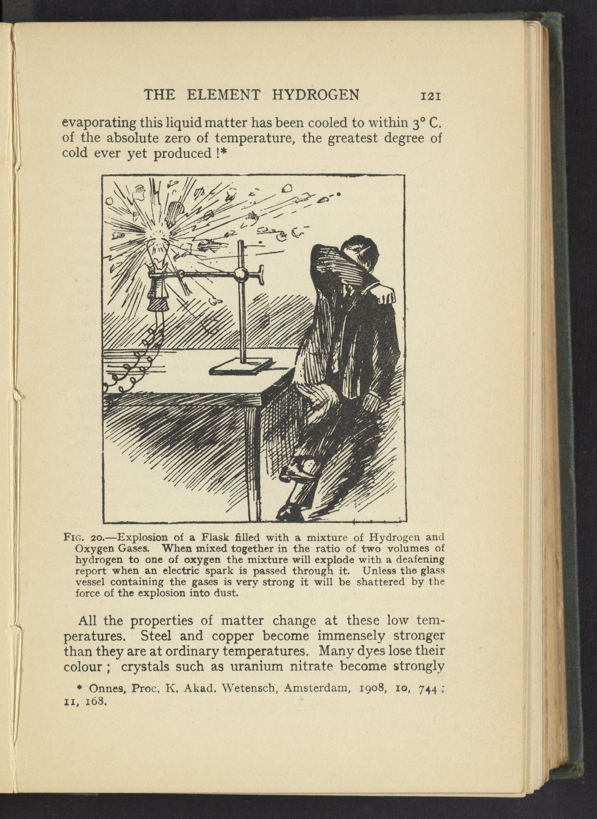 Martin, Geoffrey. “Fig. 20: Explosion of a Flask Filled with a Mixture of Hydrogen and Oxygen Gases.” Triumphs & Wonders of Modern Chemistry. New York, New York: D. Van Nostrand Company, 1913. https://digital.sciencehistory.org/works/h989r376z.