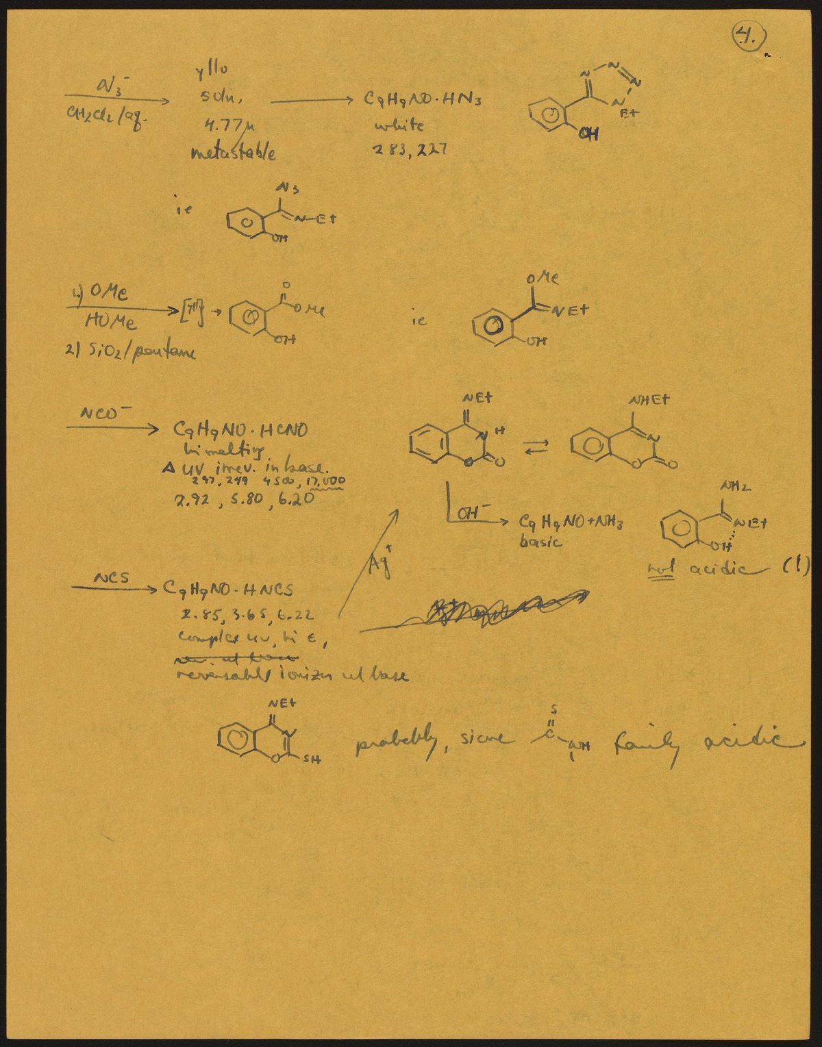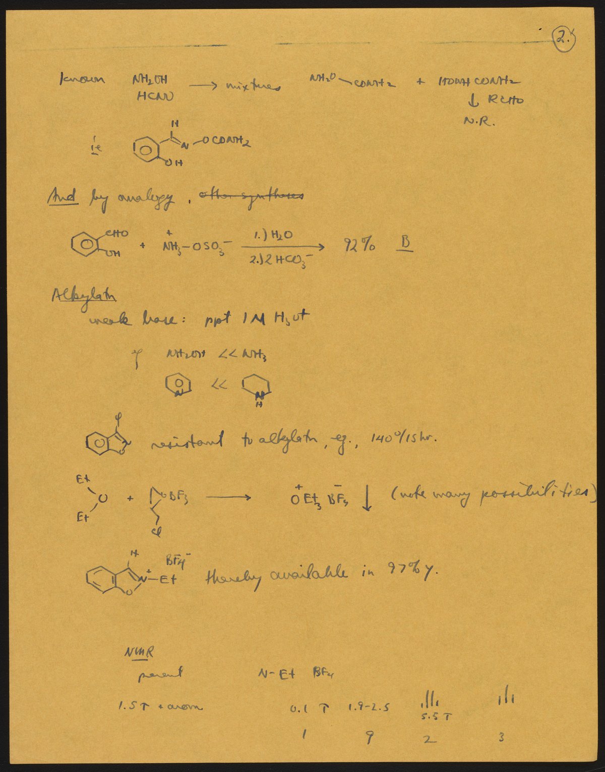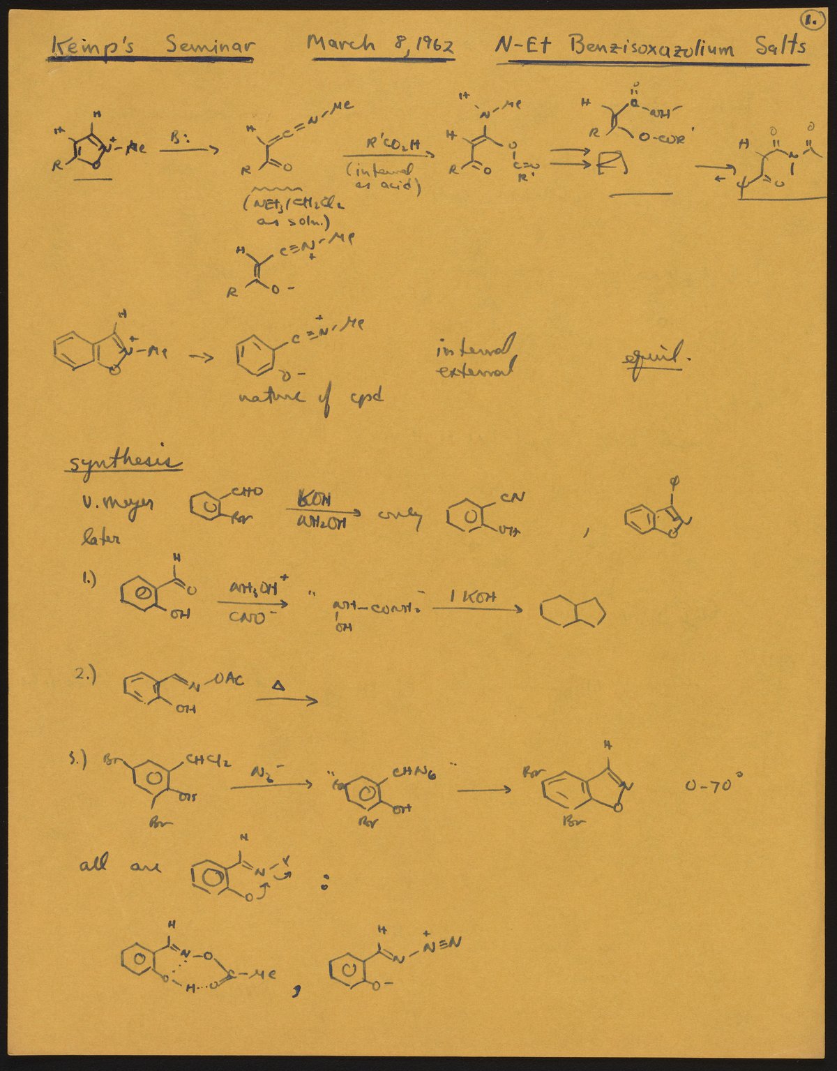Kohler, Robert E. “R. B. (Robert Burns) Woodward Seminar Entitled ‘N-Et Benzisoxazolium Salts.’” Notes from R. B. (Robert Burns) Woodward's Seminars, circa 1959–1966. Folder 2. Science History Institute. Philadelphia. https://digital.sciencehistory.org/works/h989r4102.