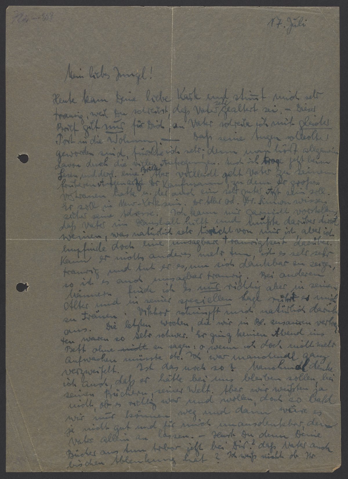 Heute kam deine liebe Karte und stimmt mich sehr traurig, weil Du schreibst, dass Vater sehr gealtert sei. – Dieser Brief gilt nur für Dich, an Vater schreibe ich mit gleicher Post in die Wohnung. – Daß seine Augen schlechter geworden sind, fürchte ich sehr; denn man hört allgemein davor durch die viele Aufregungen. Auch ich trage jetzt beim Lesen, und dergl. Eine Brille. Aber vielleicht geht Vater zu seinen früheren Augenarzt Dr. Kaufmann, zu dem er großes Ansehen hatte u. der auch ein sehr guter Arzt sein soll. Er soll in New York sein. Dr. Adler od. Dr. Simon wißen sicher seine Adresse. Ich kann mir garnicht vorstellen, dass Vater im Haushalt hilft und müßte daruber direct weinen, was natürlich sehr töricht von mir ist, aber ich empfinde doch eine unsagbare Traurigkeit darüber. Kann er nichts anderes mehr tun, ist es sehr sehr traurig und tut er es, um sich dankbar zu zegien, so ist es auch unsagbar traurig. Bei anderen Männern finde ich es nur richtig aber in seinem Alter und in seiner speciellen Lage rührt es mich zu Tränen. Viktor schimpft mich darüber natürlich darüber aus. Die letzten Wochen, die wir in Bl. Zusammen verbrachten, waren so sehr schwer. Er ging keinen Abend ins Bett ohne zu sagen: O, wenn ich doch nicht mehr aufwachen müßte etc. Ich war manchmal ganz verzweifelt. Ist das noch so? Manchmal denke ich auch, dass er hätte bei uns bleiben sollen, bei seinen Büchern, seiner Welt. Aber wir wußten ja nicht, ob es richtig war und wollen, doch so bald wir nur können, weg und dann wäre es ja nicht gut und für mich unausdenkabr, den Vater allein zu lassen. – Hast Du denn Deine Bücher aus Ann Arbor jetzt bei Dir? Daß Vater auch bischen Ablenkung hat? Ich weiß nicht ob Ihr