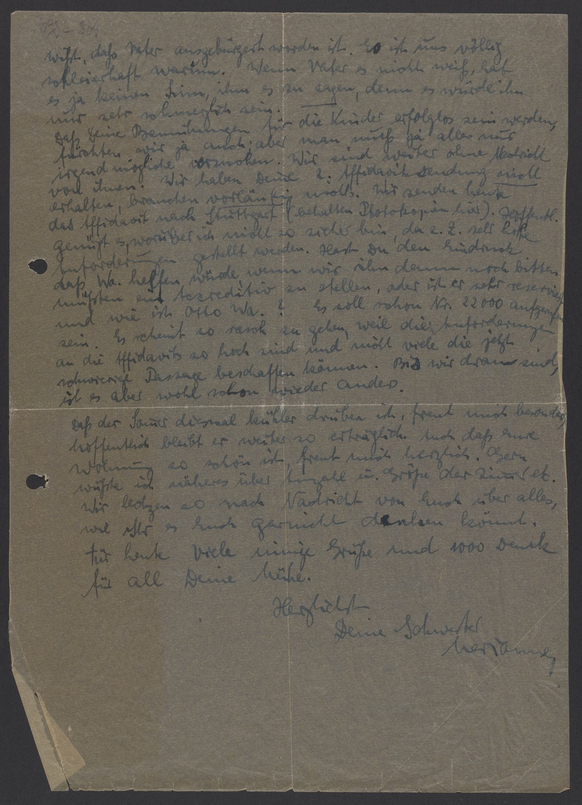 Daß Deine Bemühungen für die Kinder erfolglos sein werden, fürchten wir ja auch; aber man muss ja alles nur irgend mögliche versuchen. Wir sind weiter ohne Nachricht von ihnen. Wir haben Deine 2. Affidavitsendung nicht erhalten, brauchen vorläufig nichts. Wir senden heute das Aiffdavit nach Suttgart (behalten Photokopien hier). Hoffentlich genügt es, worüber ich nicht sicher bin, da z.Z. sehr höhe Anforderungen gehellt werden. Has Du den Eindruck, dass Wa. helfen würden, wenn wir ihn dann noch bitten müßten, ein Accreditiv zu stellen, oder ist er sehr reserveriert und wie ist Otto Wa.? Es soll schon Nr. 22000 aufgerufen sein. Es scheint so rasch zu gehen, weil die Anforderungen an die Affidavits so hoch sind und nicht viele die jetzt schwierige Passge beschaffen können. Bis wir dran sind, ist es aber wohl schon wieder anders.