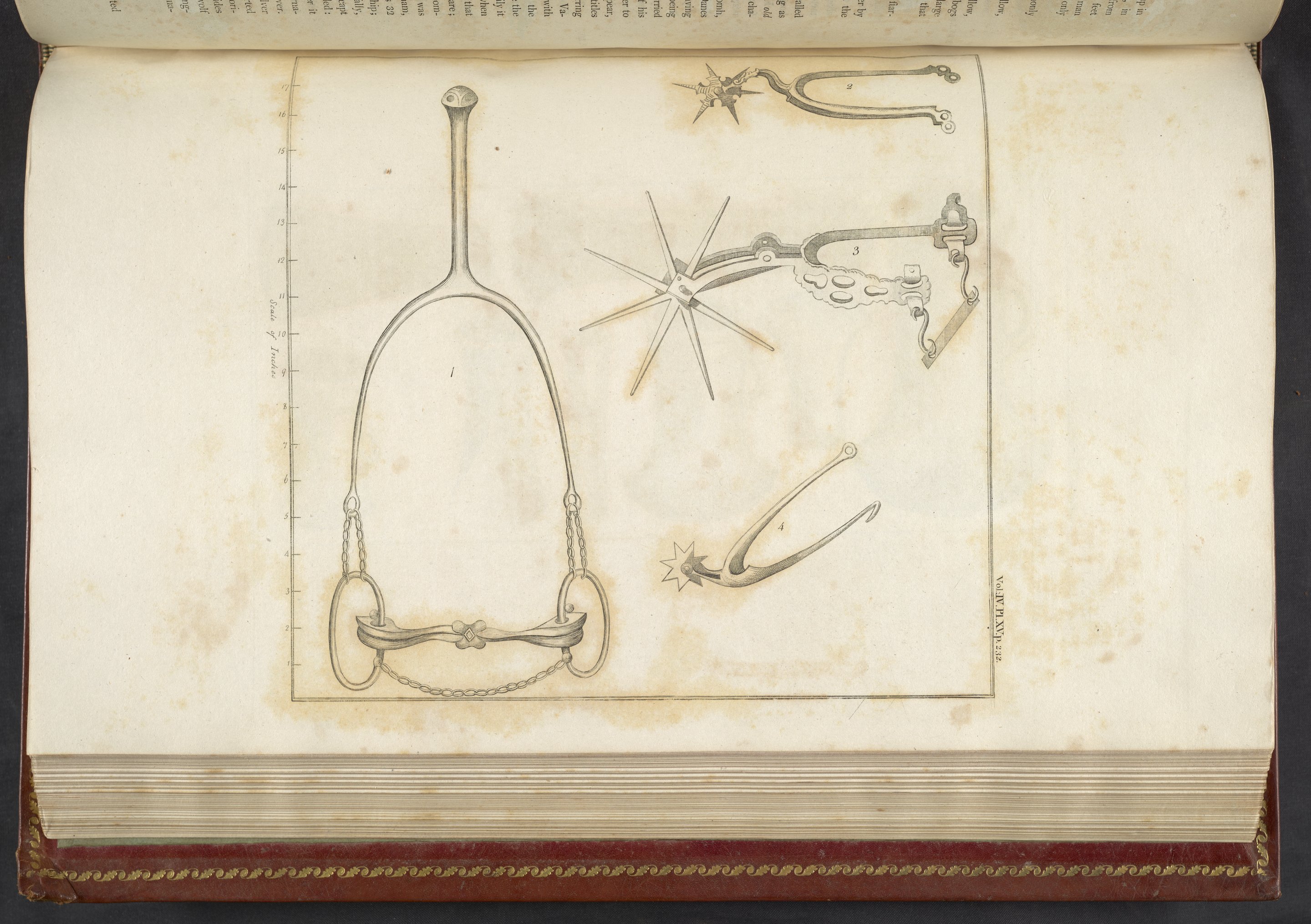 Engraving depicting a series of ancient brass and iron artifacts excavated from County Roscommon in Ireland. Figure 1 depicts the bitt and headstall of a bridle, both brass. Figure 2 depicts a brass spur. Figure 3 depicts a large iron spur. Figure 4 depicts a brass spur.