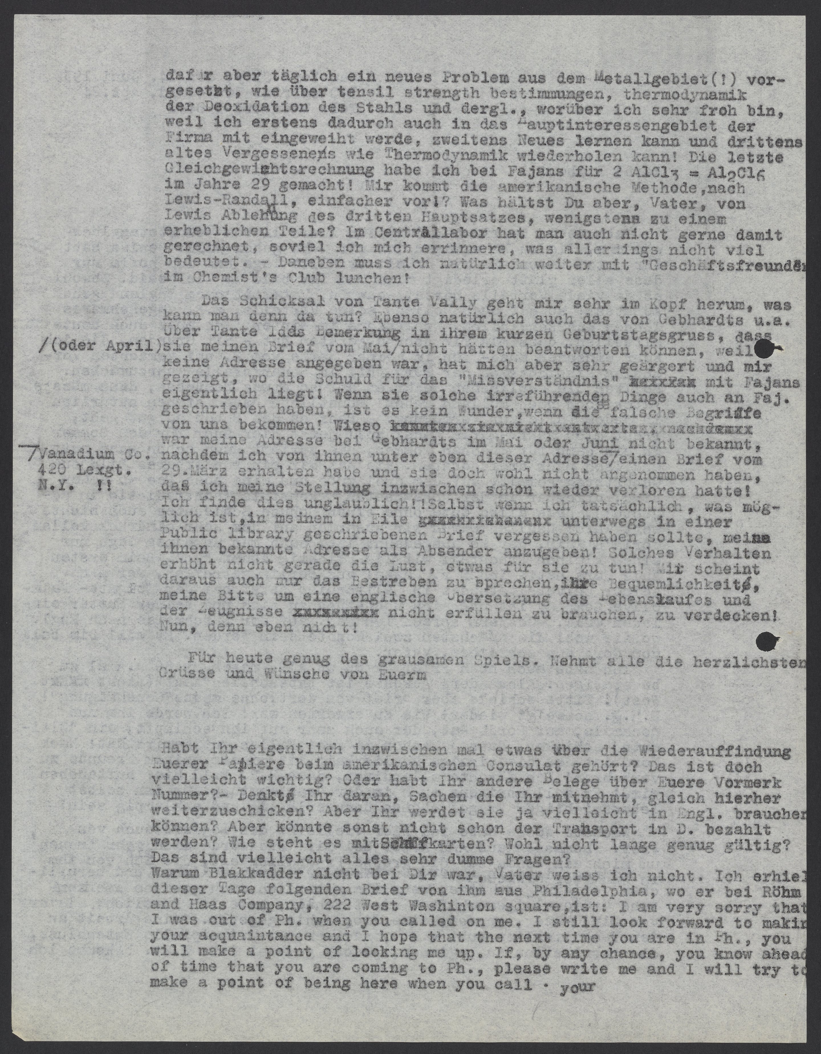 Das Schicksal von Tante Vally geht mir sehr im Kopf herum, was kann man denn da tun? Ebenso natürlich auch das von Gebhardts u.a. Über Tante Idas Bemerkung in ihrem kurzen Geburtstagsgruss, dass sie meinen Brief vom Mai/ (oder April) nicht hätten beantworten können, weil keine Adresse angegeben war, hat mich aber sehr geärgert und mir gezeigt, wo die Schuld für das „Missverständnis" mit Fajans eigentlich liegt! Wenn sie solche irreführenden Dinge auch an Faj. geschrieben haben, ist es kein Wunder, wenn die falsche Begriffe von uns bekommen! Wieso war meine Adresse bei Gebhardts im Mai oder Juni nicht bekannt, nachdem ich von ihnen unter eben dieser Adresse (Vanadium Co., 420 Lexington, N.Y.) einen Brief vom 29.März erhalten habe und sie doch wohl nicht angenommen haben, das ich meine Stellung inzwischen schon wieder verloren hatte! Ich finde dies unglaublich! Selbst wenn ich tatsächlich, was möglich ist, in meinem in Eile unterwegs in einer Public library geschriebenen Brief vergessen haben sollte, meine ihnen bekannte Adresse als Absender anzugeben! Solches Verhalten erhöht nicht gerade die Lust, otwas für sie zu tun! Wir scheint daraus auch nur das Bestreben zu besprechen, ihre Bequemlichkeit, meine Bitte um eine englische Übersetzung des Lebenslaufes und der Zeugnisse xxnicht erfüllen zu brauchen, zu verdecken! Nun, denn eben nicht!
