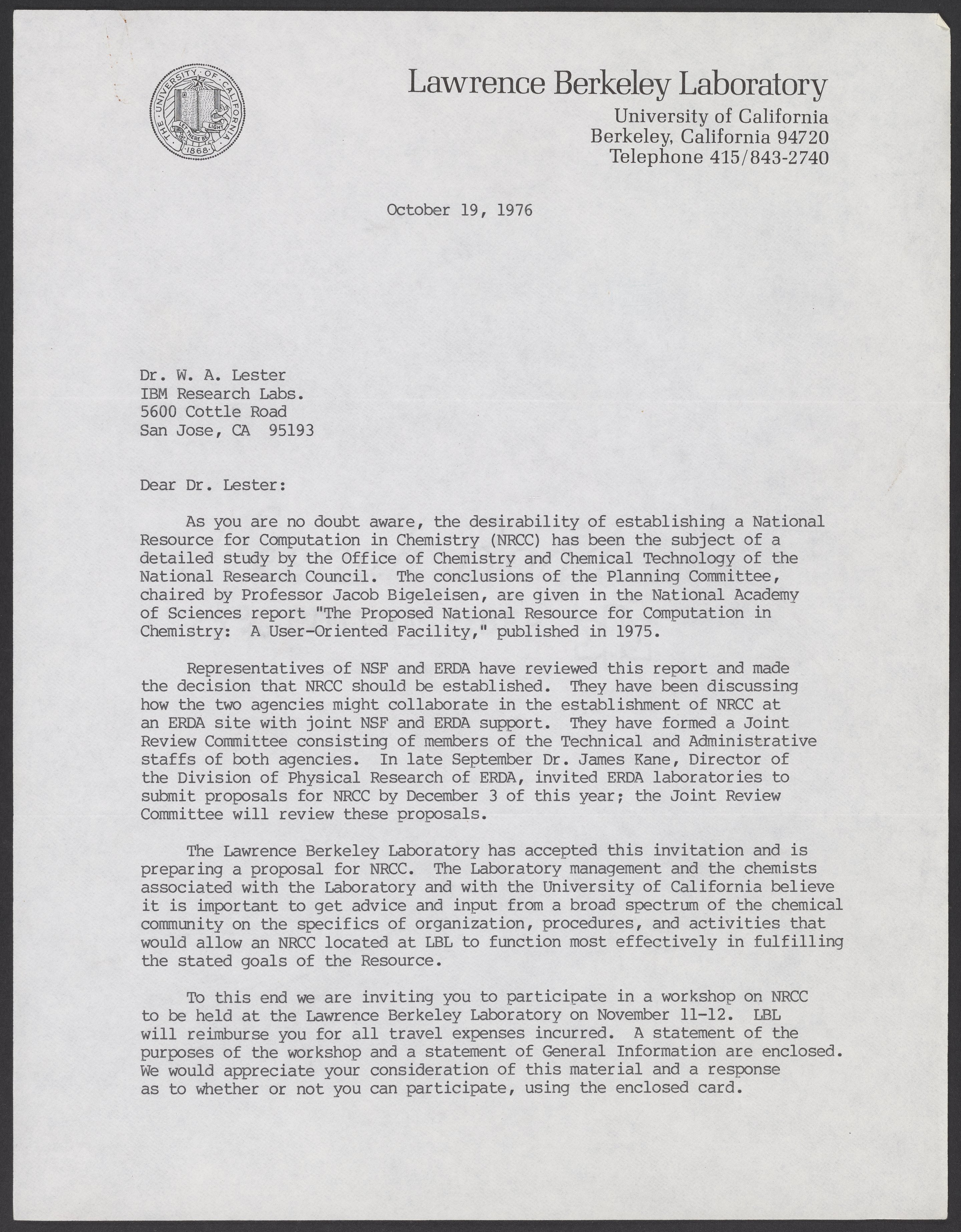 Letter from Andrew M. Sessler to William A. Lester, Jr. (1937-) about establishing a National Resource for Computation in Chemistry (NRCC). Sessler invites Lester to an NRCC workshop to be held at the Lawrence Berkeley Laboratory.