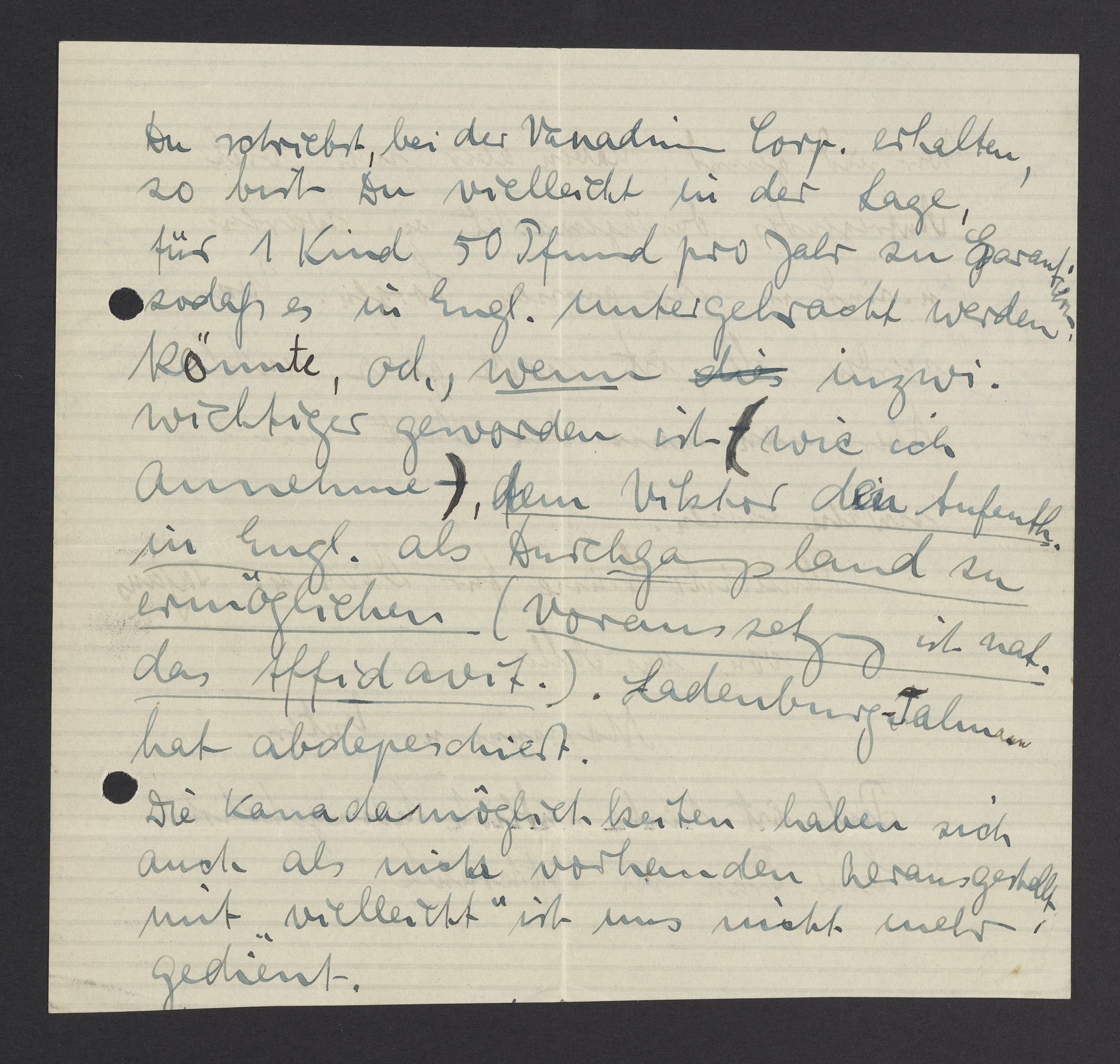 Du schriebst, bei der Vanadium Corporation, erhalten, so bist vielleicht in der Lage für 1 Kind 50 Pfund pro Jahr zu garantieren, sodaß es in Engl. untergebracht werden konnte, od., wenn dies inzwi. wichtiger geworden ist (wie ich annehme), dem Viktor den Aufenthalt in England als Durchgangsland zu ermöglichen (Voraussetzung ist nat. das Affidavit). Ladenburg-Talmann hat abdepeschiert.