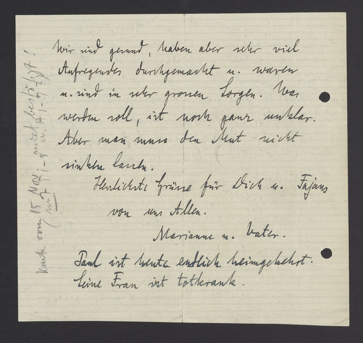 Wir sind gesund, haben aber sehr viel Aufgeregtes durchgemacht u. waren u. sind in der großen Sorgen. Was werden soll ist noch ganz unklar. Aber man muss den Mut nicht sinken lassen.