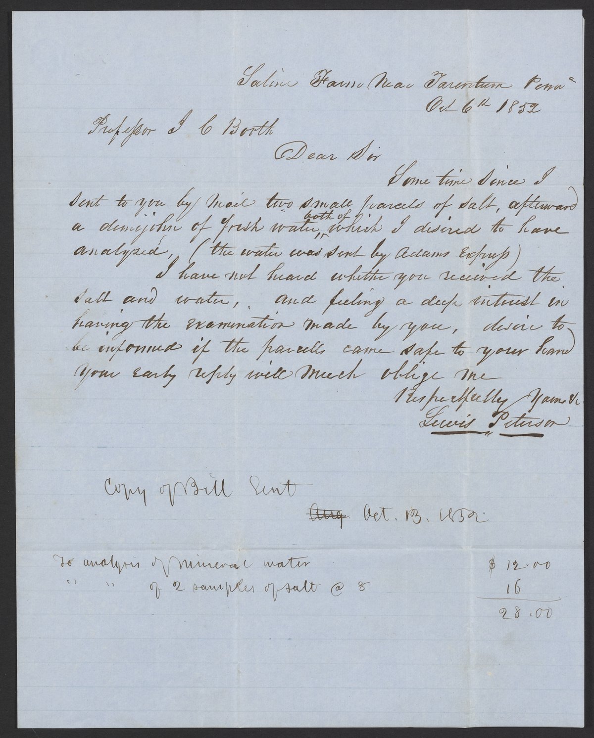 Peterson, Lewis. “Letter from Lewis Peterson to James Curtis Booth, October 6, 1852,” October 6, 1852. Papers of James Curtis Booth, Box 1, Folder 6. Science History Institute. Philadelphia. https://digital.sciencehistory.org/works/hk7hfvr.