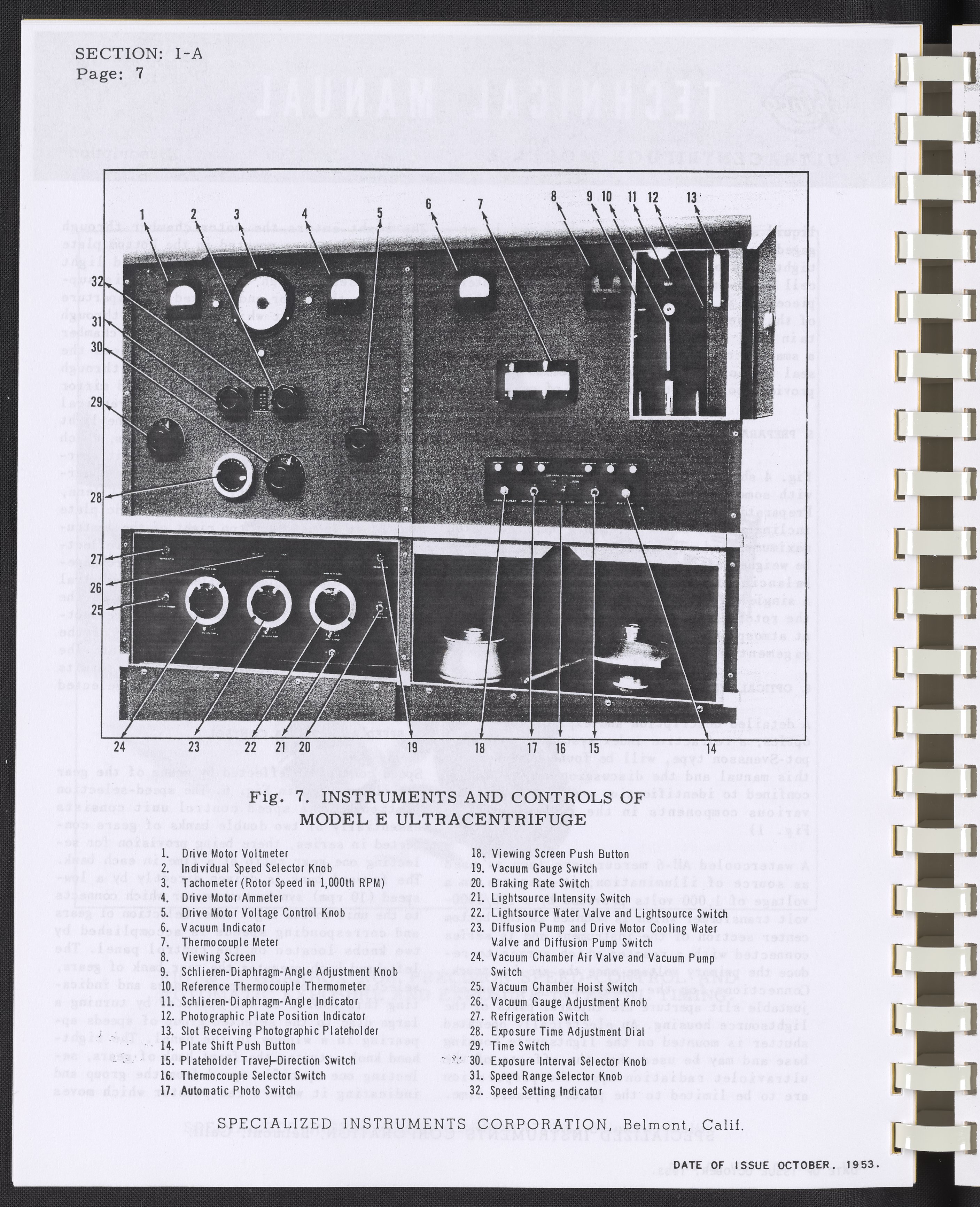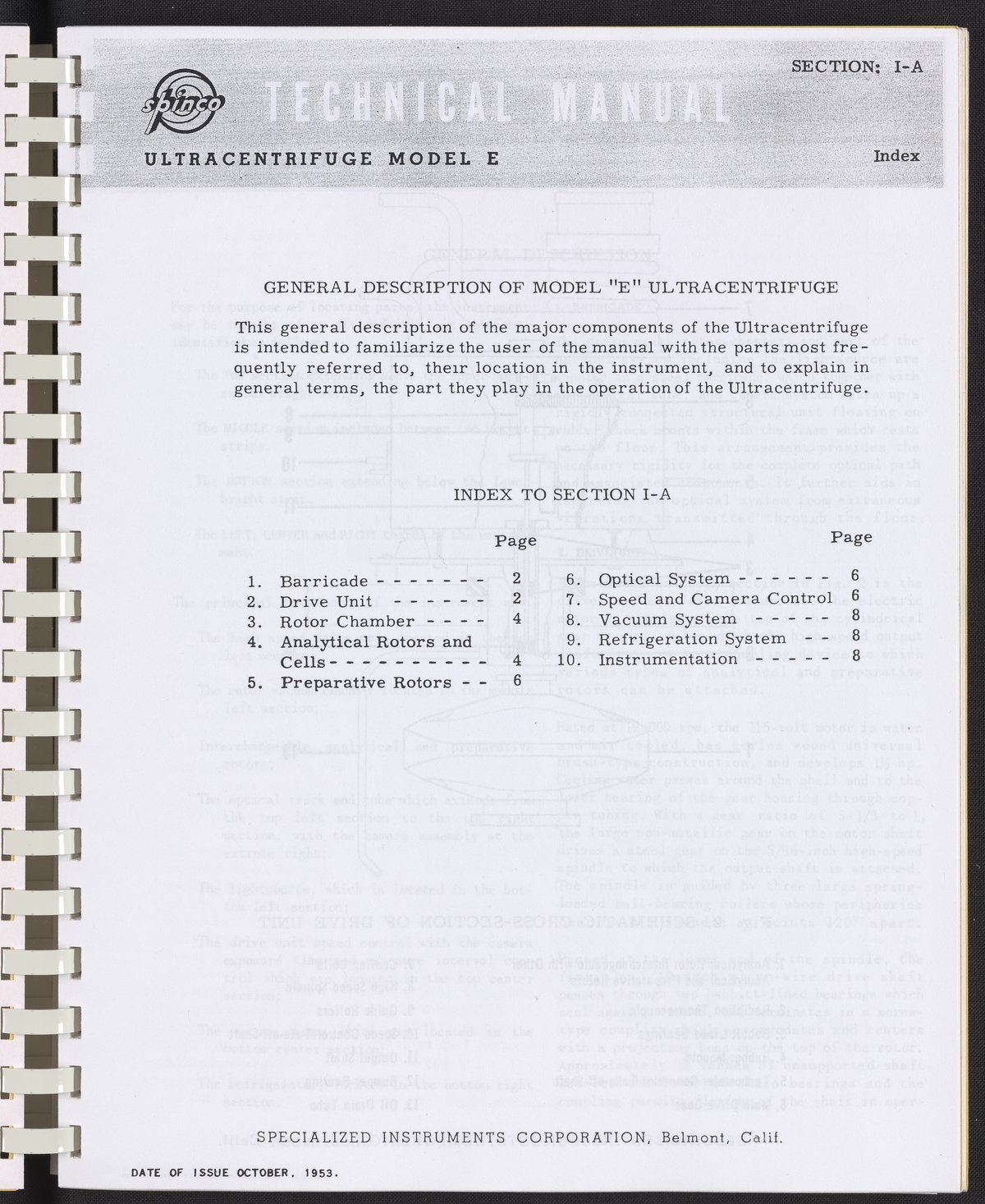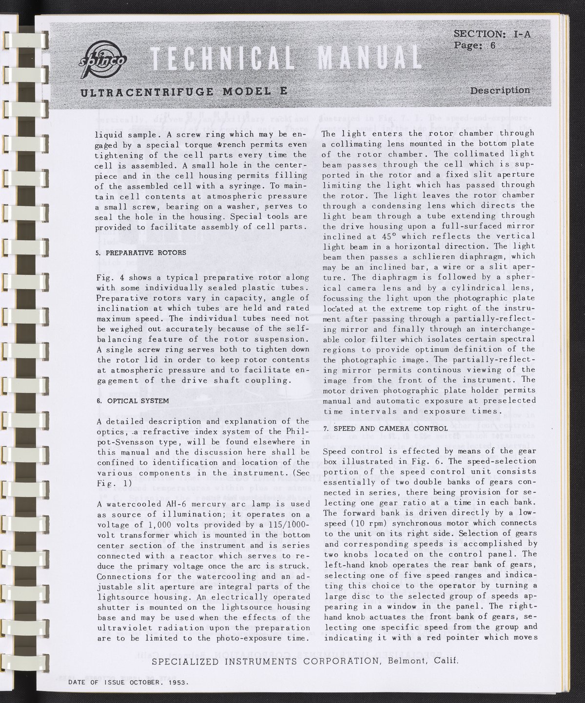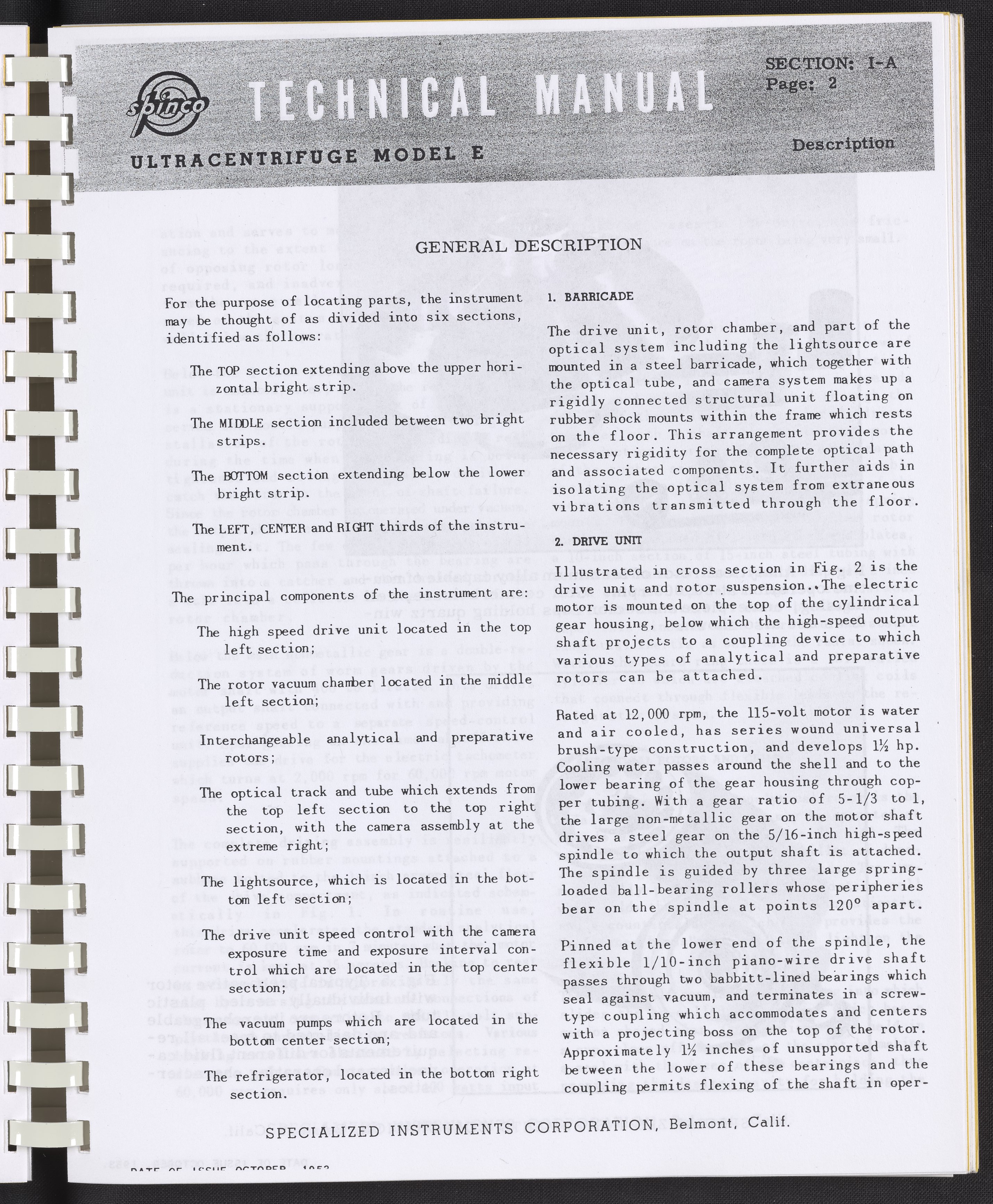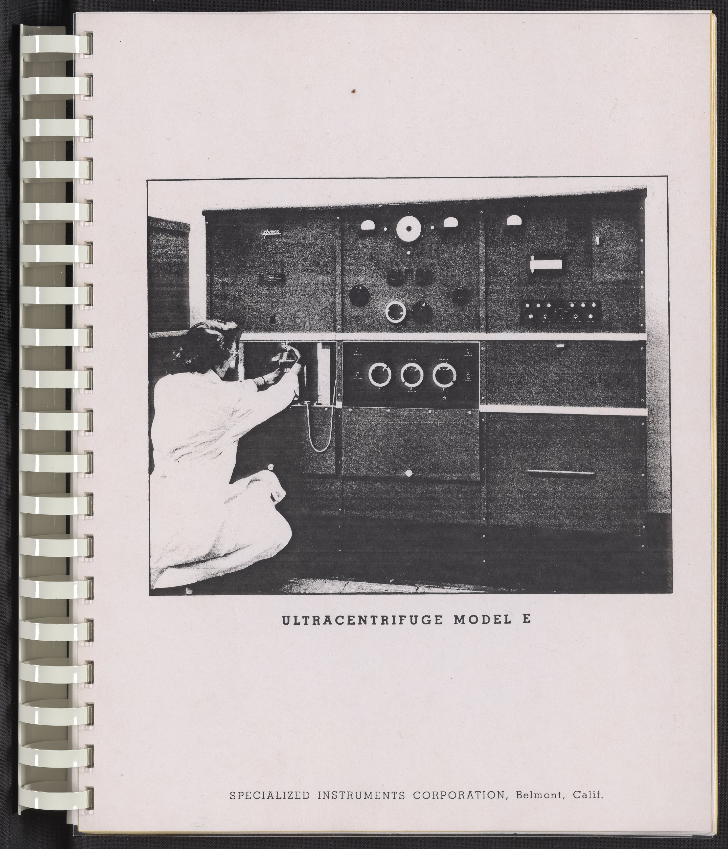 Beckman Instruments, Inc. Spinco Division. “Technical Manual, Spinco Ultracentrifuge Model E,” 1953–1954. Beckman Historical Collection, Box 121, Folder 9. Science History Institute. Philadelphia. https://digital.sciencehistory.org/works/hm50ts49m.