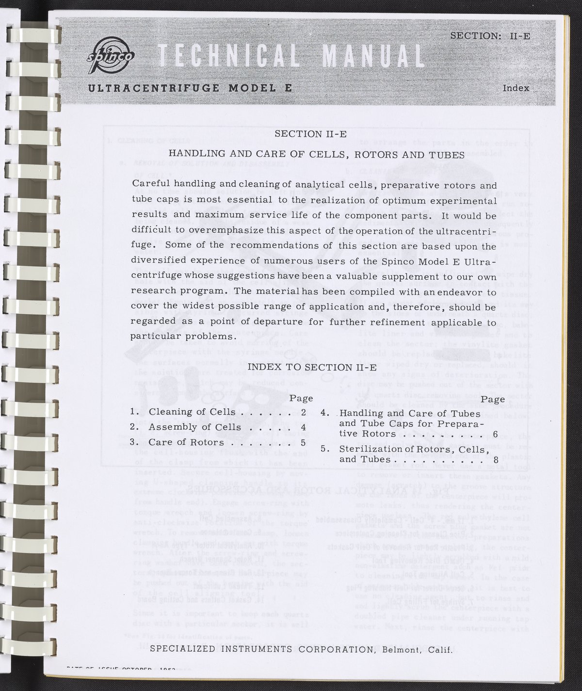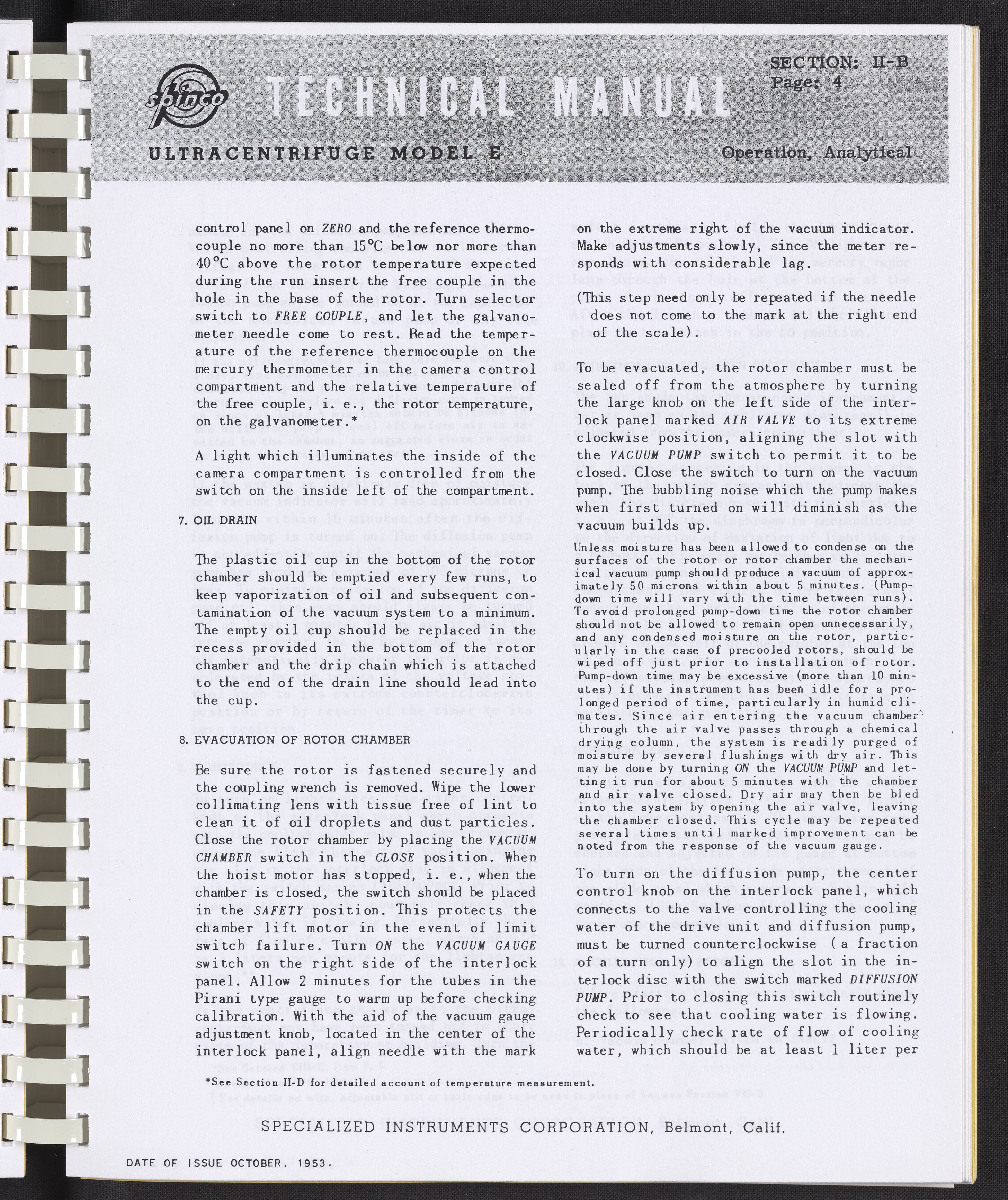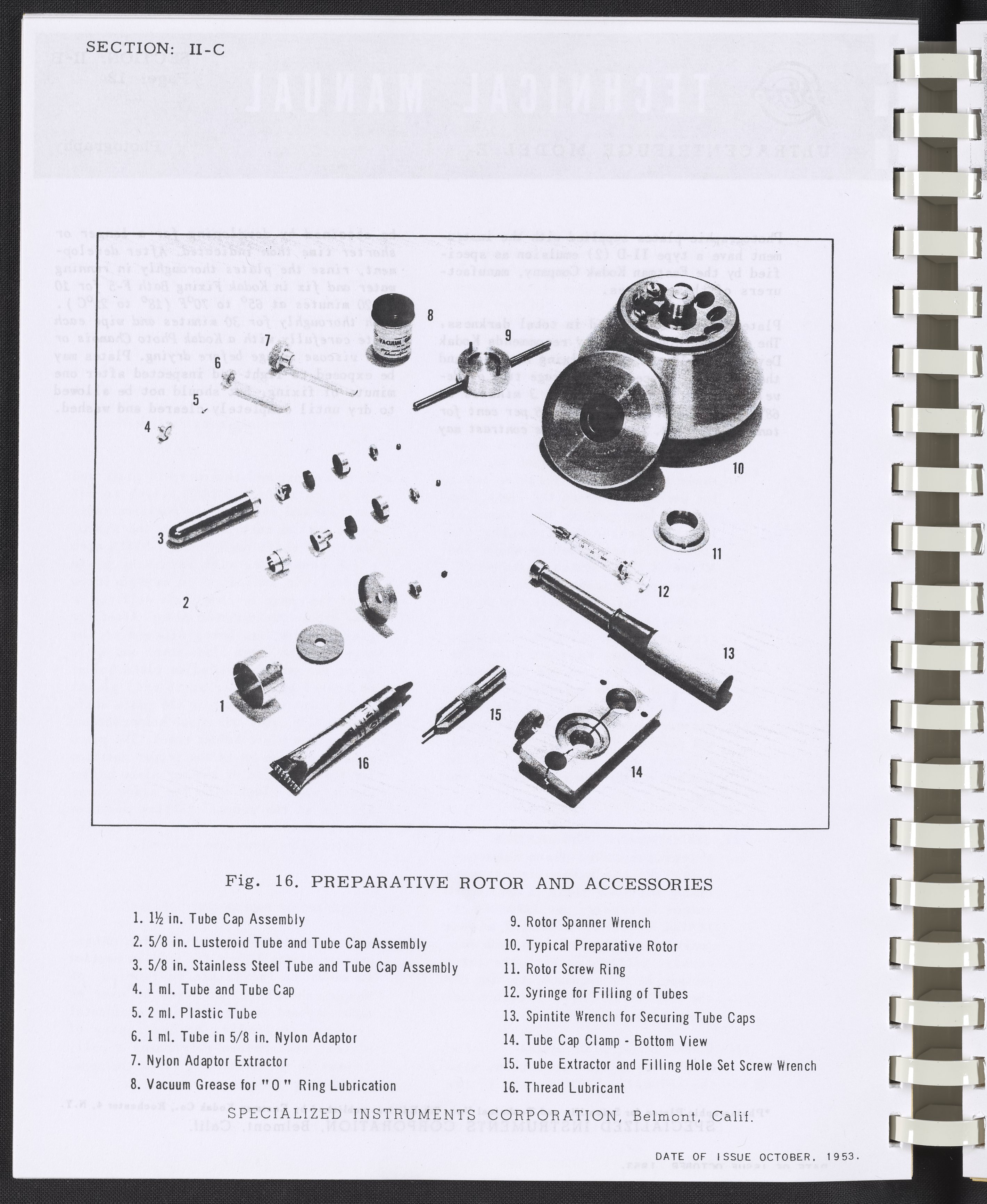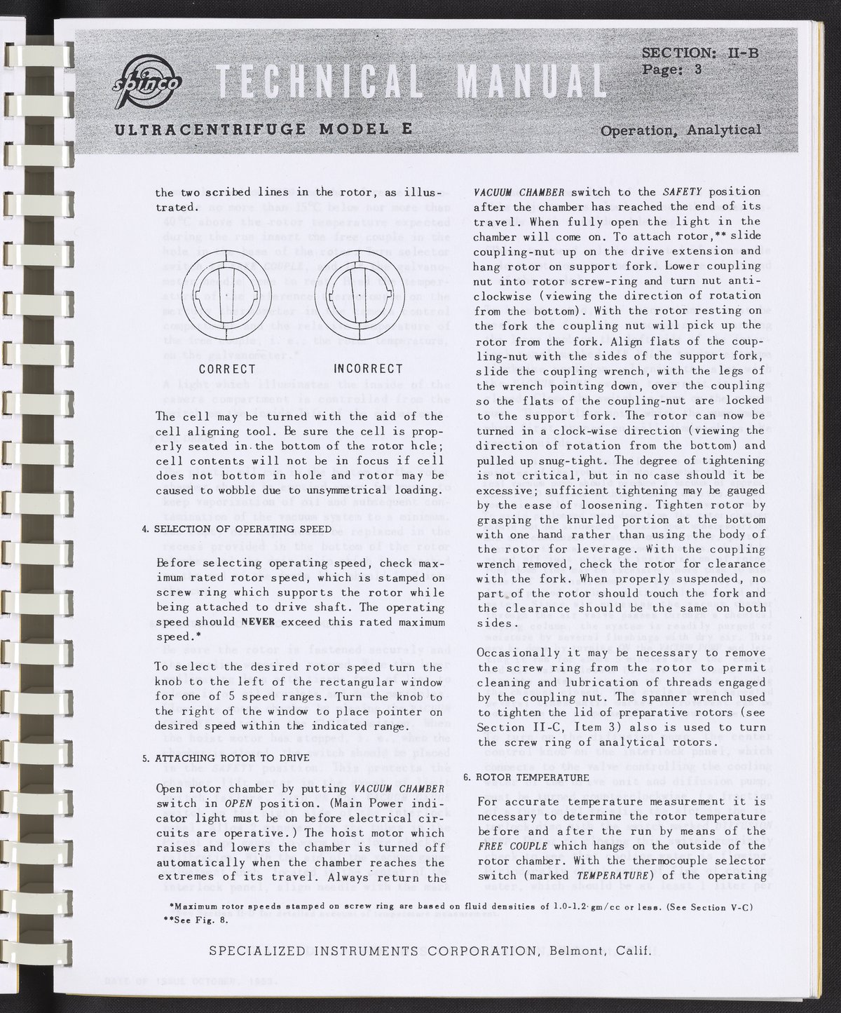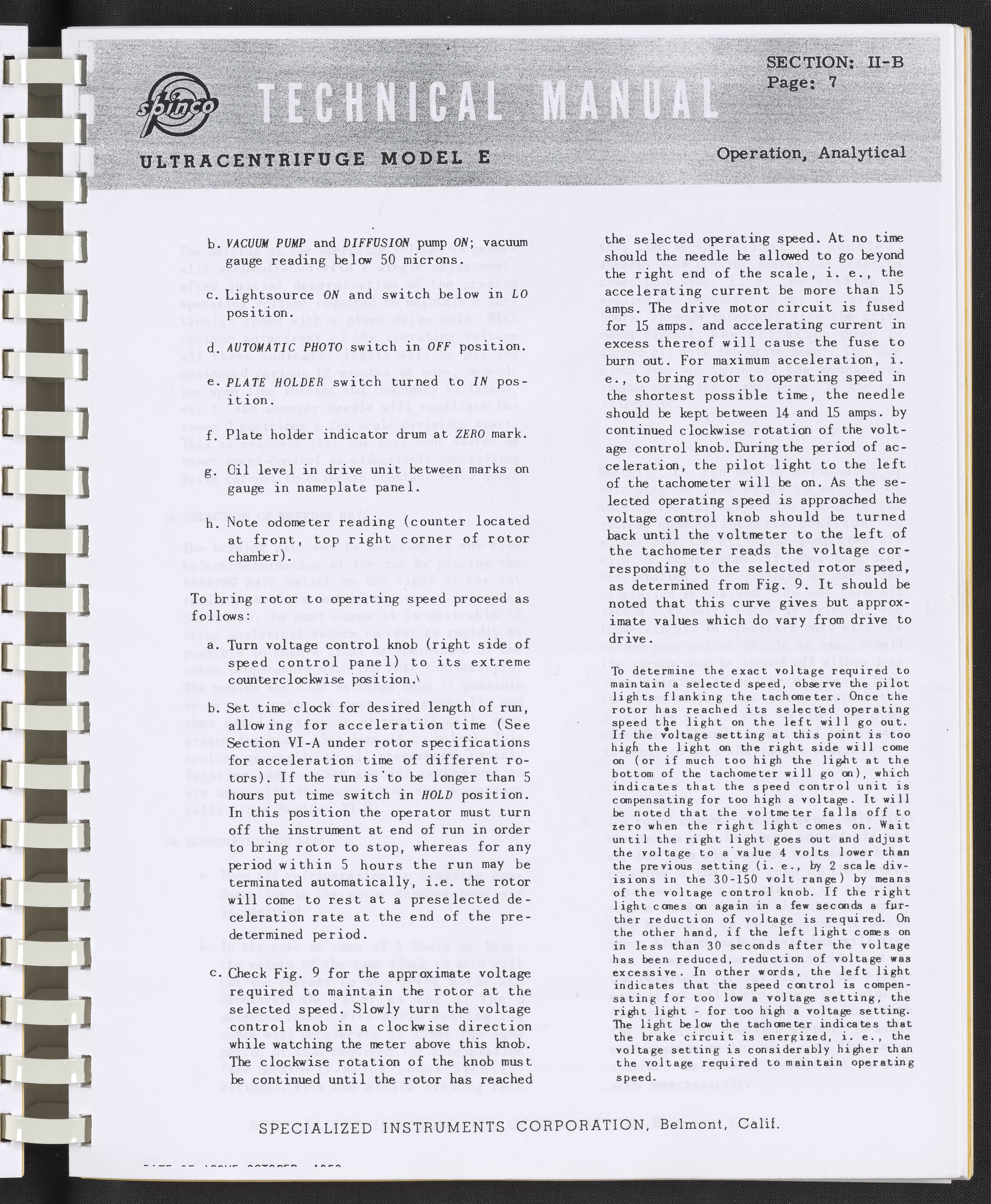 Beckman Instruments, Inc. Spinco Division. “Technical Manual, Spinco Ultracentrifuge Model E,” 1953–1954. Beckman Historical Collection, Box 121, Folder 9. Science History Institute. Philadelphia. https://digital.sciencehistory.org/works/hm50ts49m.