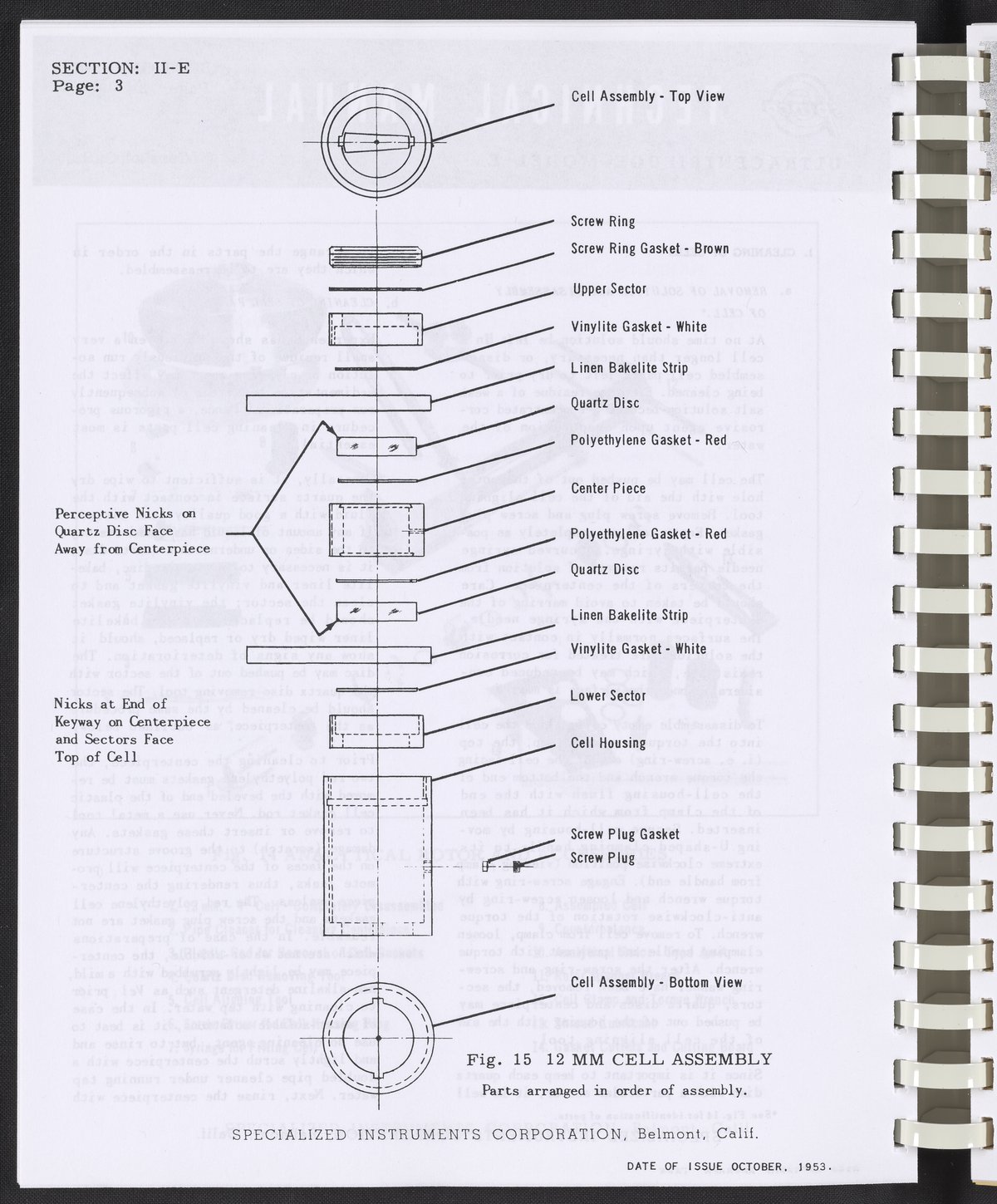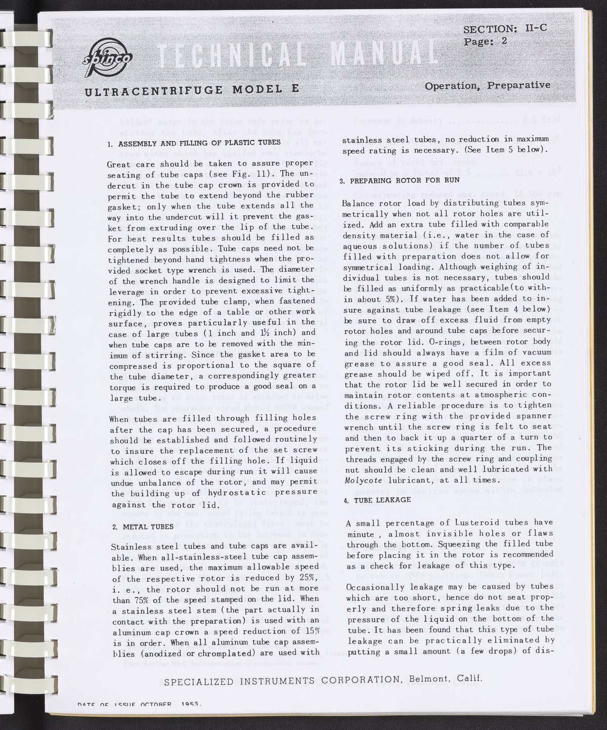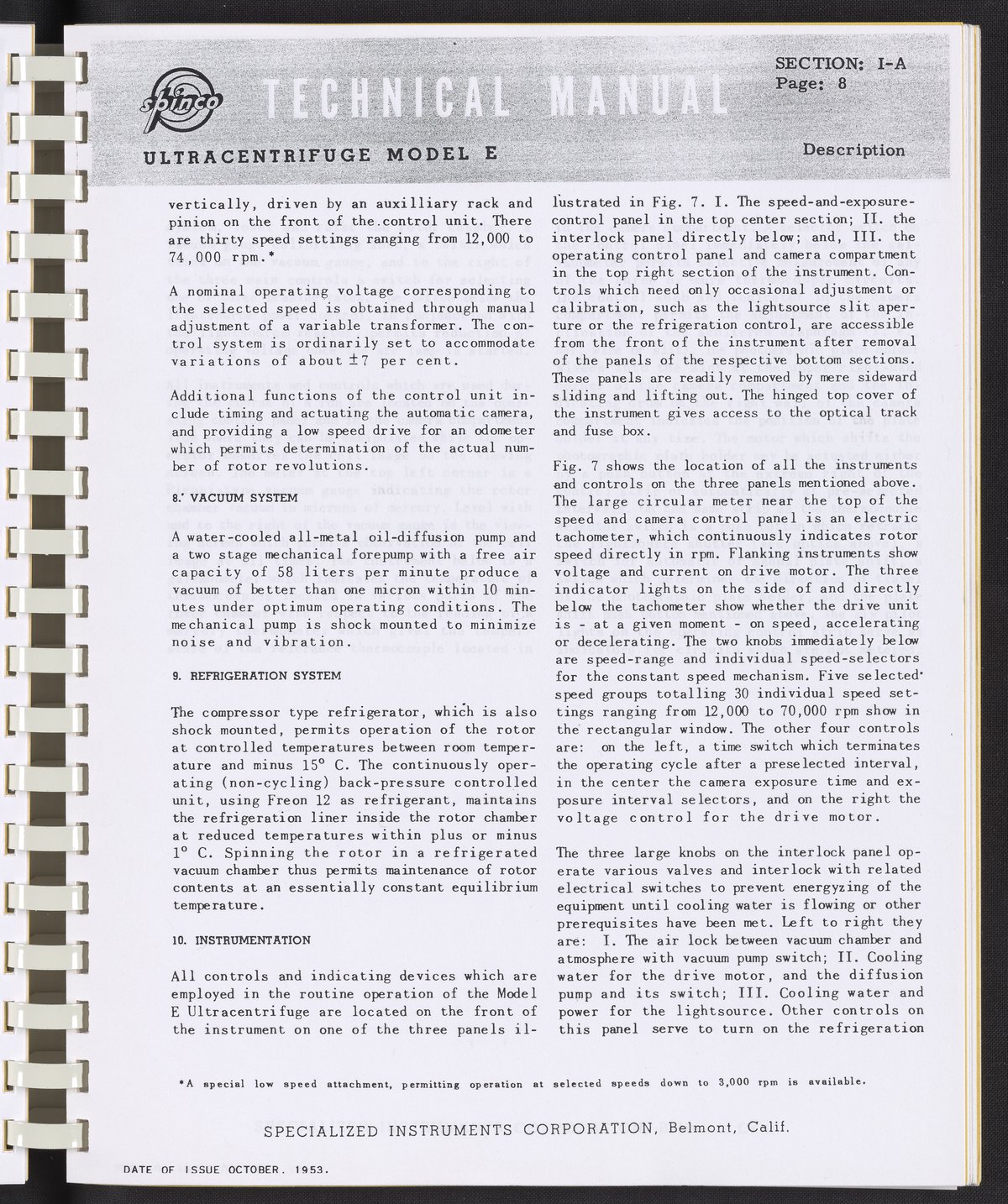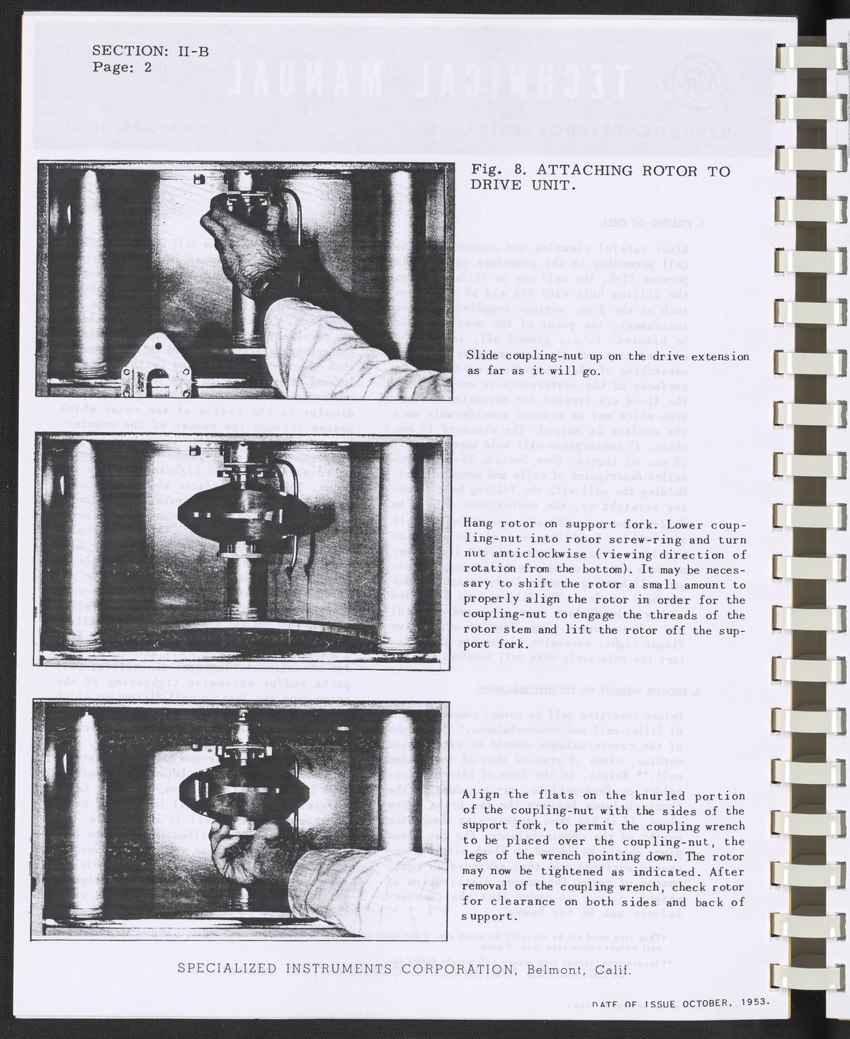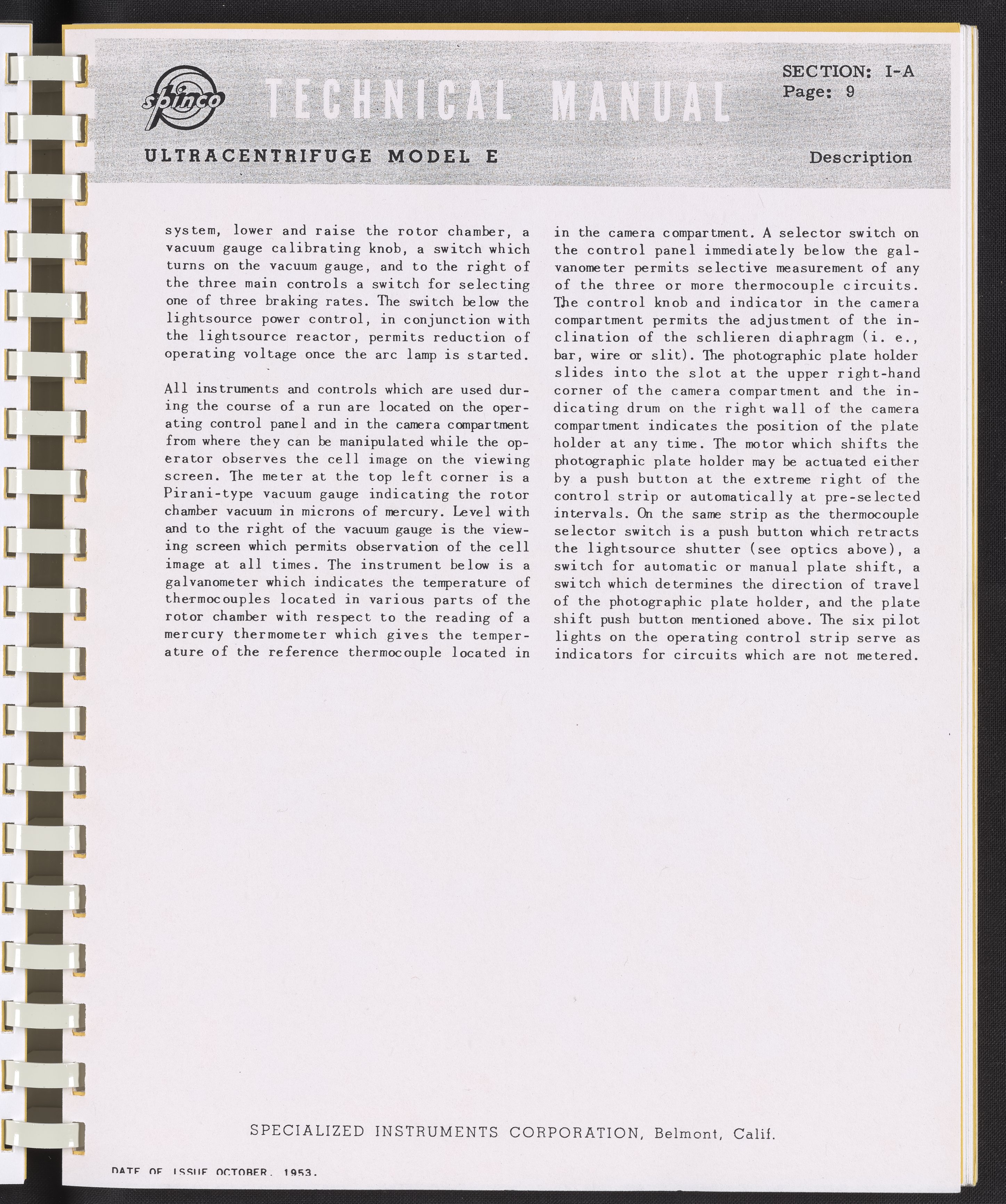 Beckman Instruments, Inc. Spinco Division. “Technical Manual, Spinco Ultracentrifuge Model E,” 1953–1954. Beckman Historical Collection, Box 121, Folder 9. Science History Institute. Philadelphia. https://digital.sciencehistory.org/works/hm50ts49m.