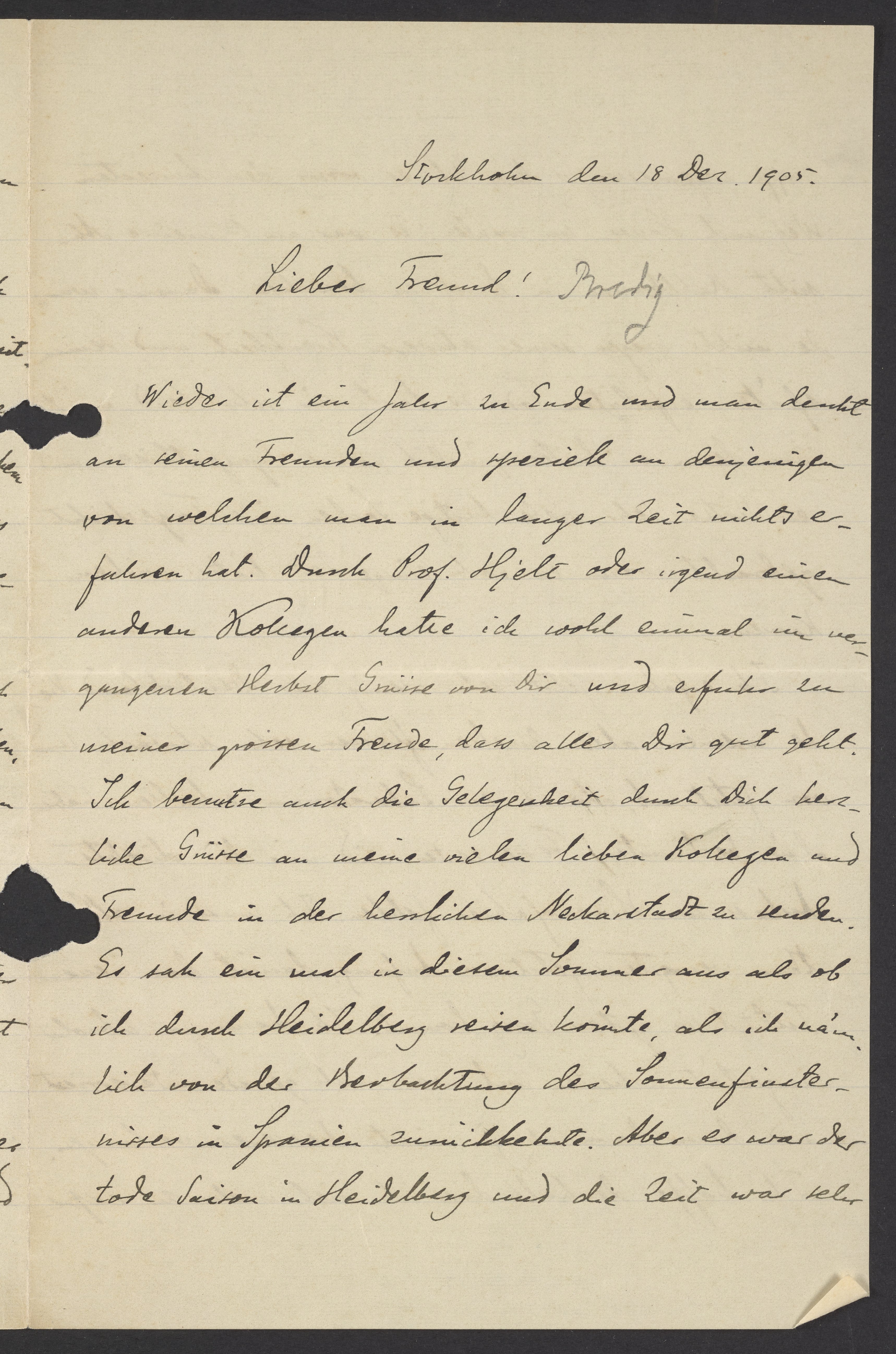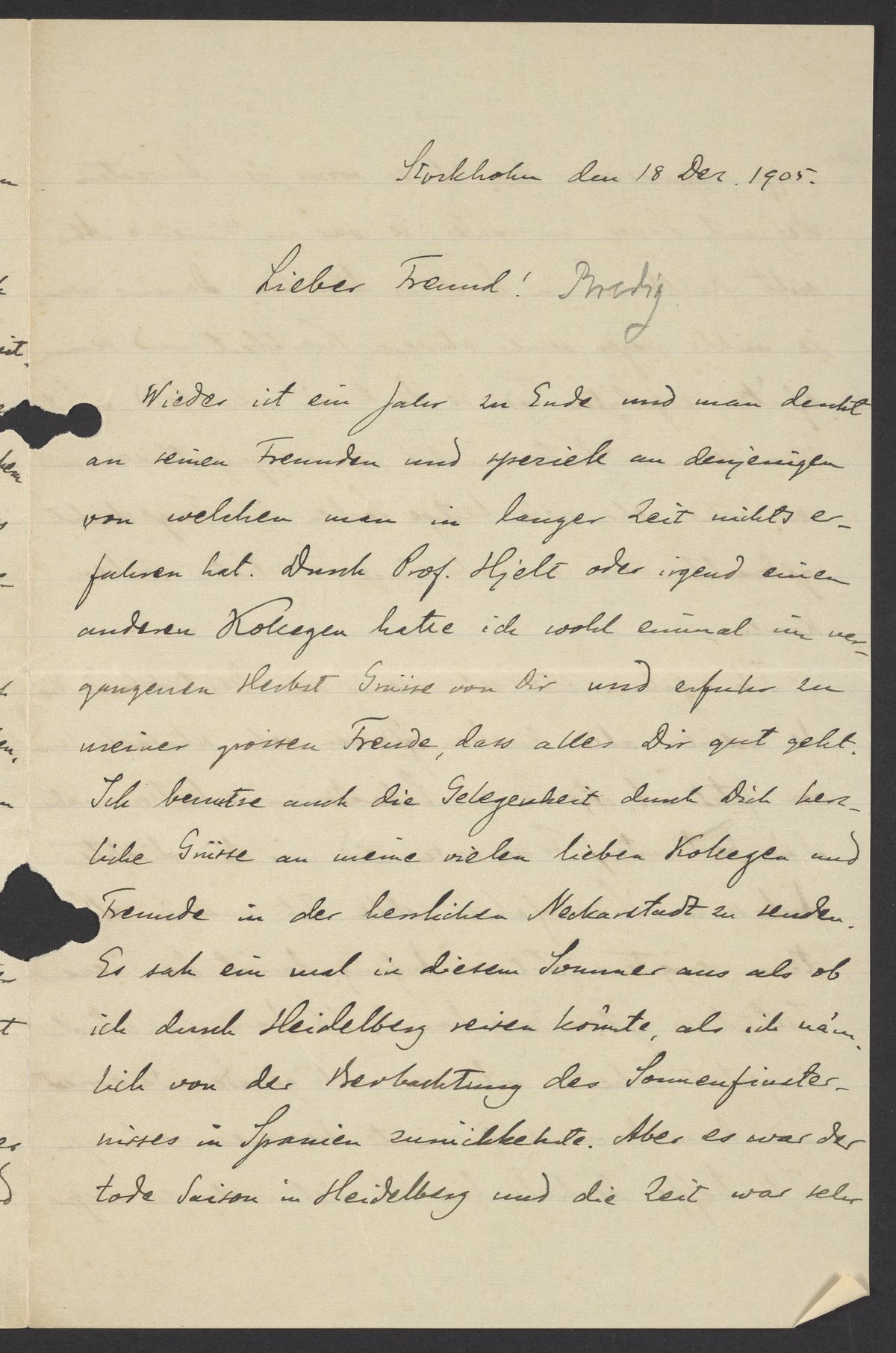 Wieder ist ein Jahr zu Ende und man denkt an seinen Freunden und speziell an denjenigen von welchen man in langer Zeit nichts erfahren hat. Durch Prof. Hjelt oder irgend einen anderen Kollegen hatte ich wohl einmal im vergangenen Herbst Grüsse von Dir un erfuhr zu meiner grossen Freude, dass alles Dir gut geht. Ich benutze auch die Gelegenheit durch Dich herzliche Grüsse an meine vielen lieben Kollegen und Freunden in der herrlichen Neckarstadt zu senden. Es sah ein mal in diesem Sommer aus als ob ich durch Heidelberg reisen könnte, als ich nämlich der Betrachtung des Sonnenfinsternisses in Spanien zurückkehrte. Aber es war der tode Saison in Heidelberg und die Zeit