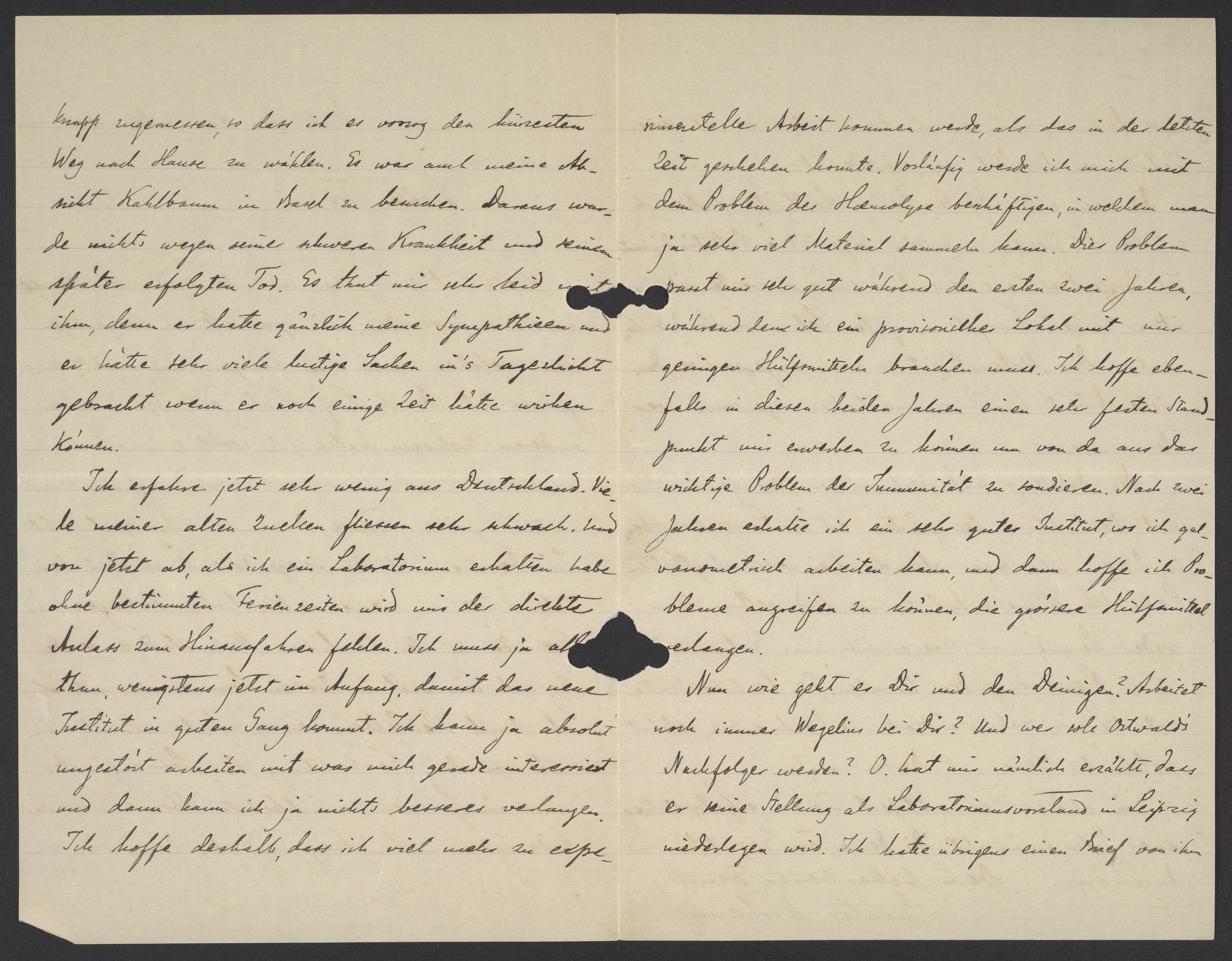 war zu Knapp gewesen, so dass ich es vorzog den kürzesten Weg nach Hause zu wählen. Es war auch meine Absicht Kahlbaum in Basel zu besuchen. Daraus wurde nichts wegen seiner schweren Krankheit und seinem später erfolgten Tod. Es that mir sehr leid mit ihm, denn er hatte gänzlich meine Sympathieen und er hätte sehr viele lustige Sache in’s Tagelicht gebracht wenn er noch einige Zeit hätte wirken können. Ich erfahre jetzt sehr wenig aus Deutschland. Viele meiner alten Quellen fliessen sehr schwach. Und von jetzt ab, als ich ein Laboratorium erhalten habe ohne bestimmten Ferienzeiten wird uns der direkte Anlass zum Hinauffahren fehlen. Ich muss jetzt alles thun, wenigsten im Anfang, damit das neue Institut im guten Gang kommt. Ich kann ja absolut ungestört mit was mich gerade interessiert und darum kann ich ja nichts besseres verlangen. Ich hoffe deshalb, dass ich viel mehr zu