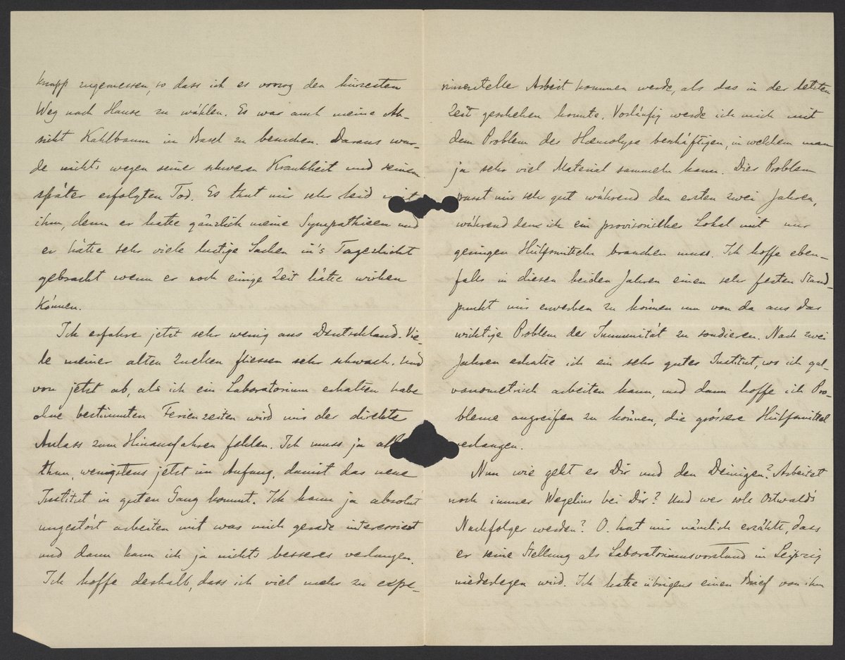experimentelle Arbeit kommen werde, als das in der letzten Zeit geschehen konnte. Vorläufig werde ich mich mit dem Problem der Hornolyse beschäftigen, in welcher man ja sehr viel Material sammeln kann. Dies Problem passt mir sehr gut während der ersten zwei Jahren, während dem ich ein provisionelles Lokal mit nur geringen Hilfmitteln brauchen muss. Ich hoffe ebenfalls in diesen beiden Jahren einen sehr festen Standpunkt mir erwerben zu können um von da aus das wichtige Problem der Immunität zu sondieren. Nach zwei Jahren erhalte ich ein sehr gutes Institut, wo ich galvanonietrisch arbeiten kann, und dann hoffe ich Probleme aufgreifen zu können, die grosse Hilfsmittel verlangen.
