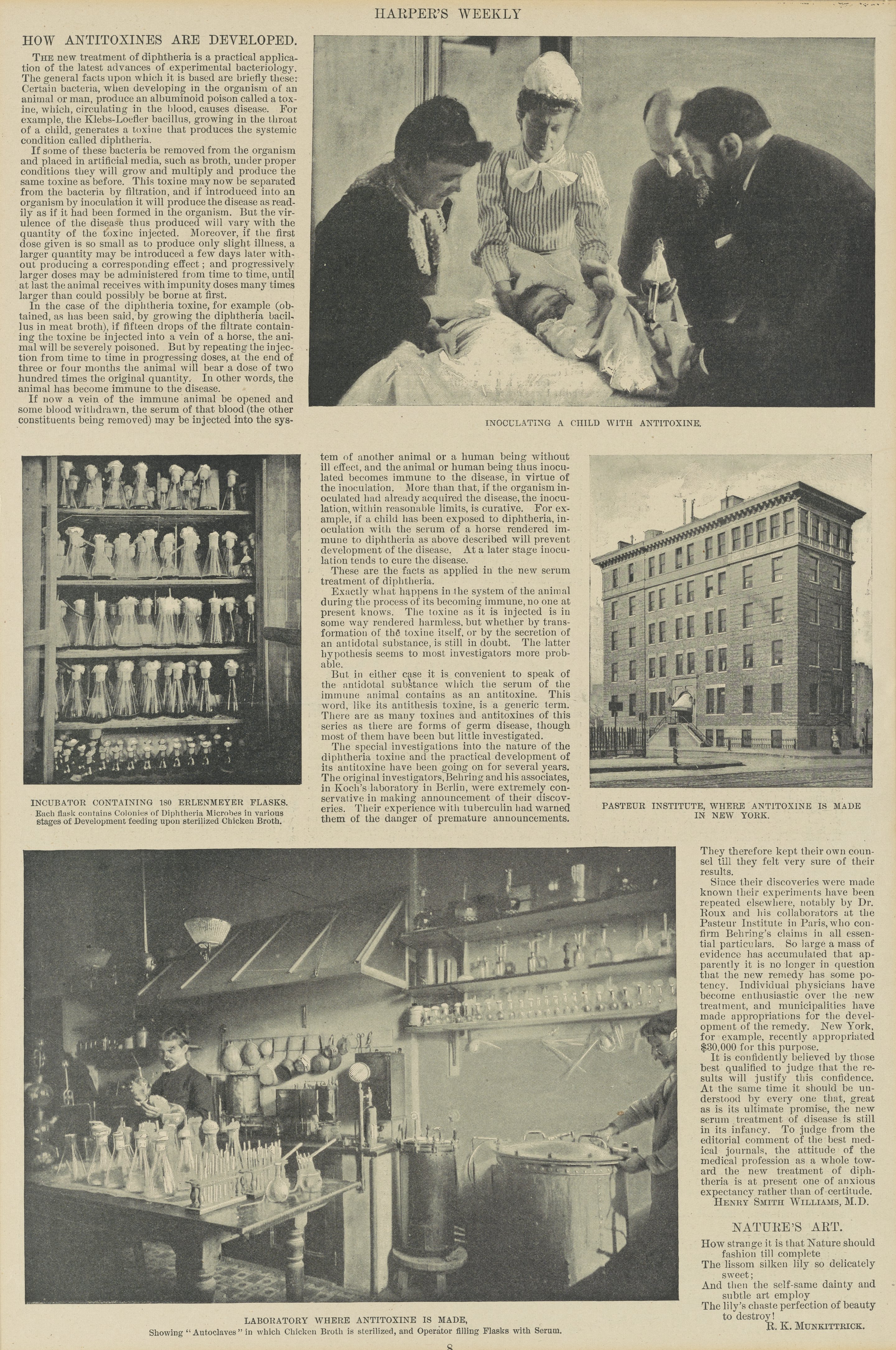 “How Antitoxines Are Developed.” New York, New York: Harper & Brothers, January 5, 1895. Fisher-Pasteur Memorial Collection, Box 2, Folder 19 A & B. Science History Institute. Philadelphia. https://digital.sciencehistory.org/works/how8d8o.