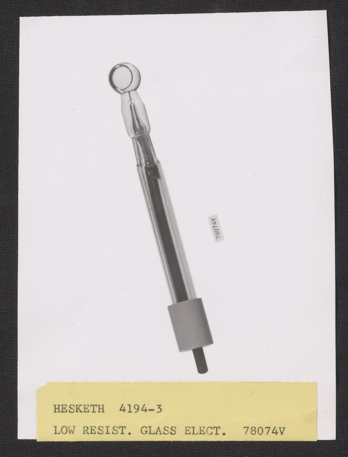 Hesketh, Dean D. “Low Resistance Glass Electrode #78074V,” 1960–1969. Beckman Historical Collection, Box 86. Science History Institute. Philadelphia. https://digital.sciencehistory.org/works/hq37vn926.