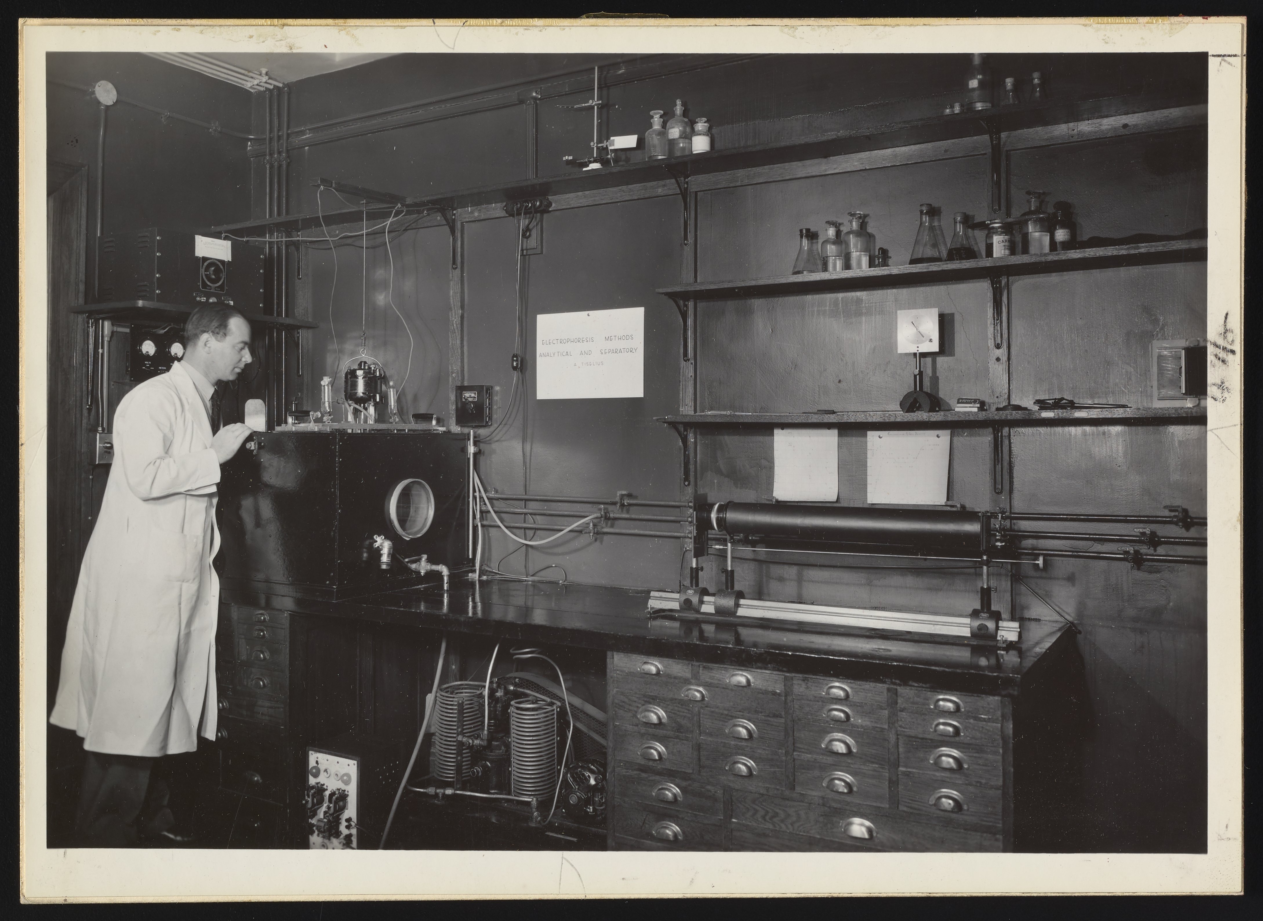 “Arne Tiselius Demonstrating Electrophoresis Apparatus,” September 15, 1939. Permanent Exhibition, Box Small Collections. Science History Institute. Philadelphia. https://digital.sciencehistory.org/works/hq37vp19d.