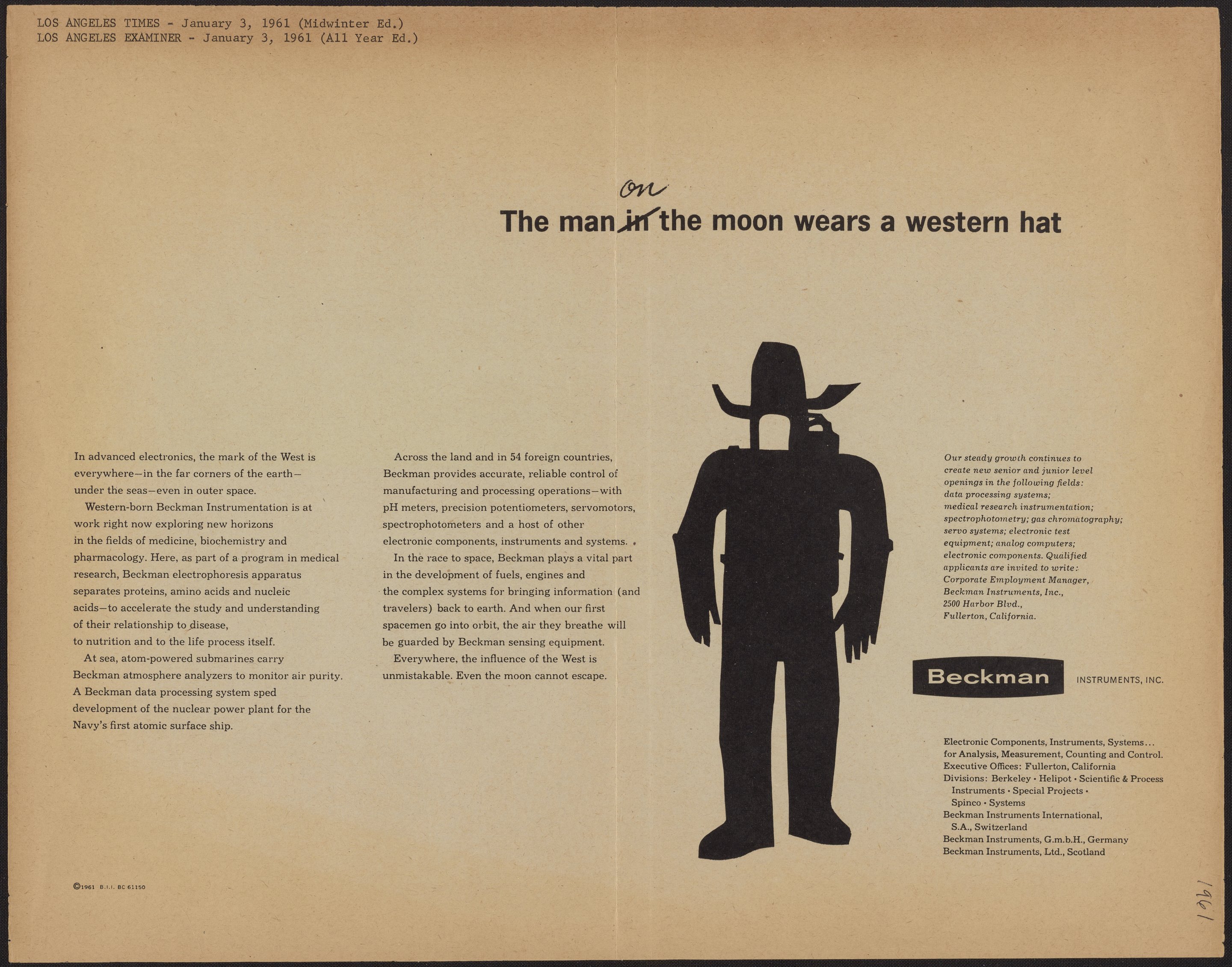 Beckman Instruments, Inc. “The Man on the Moon Wears a Western Hat,” 1961. Beckman Historical Collection, Box 49, Folder 19. Science History Institute. Philadelphia. https://digital.sciencehistory.org/works/ht24wj40p.