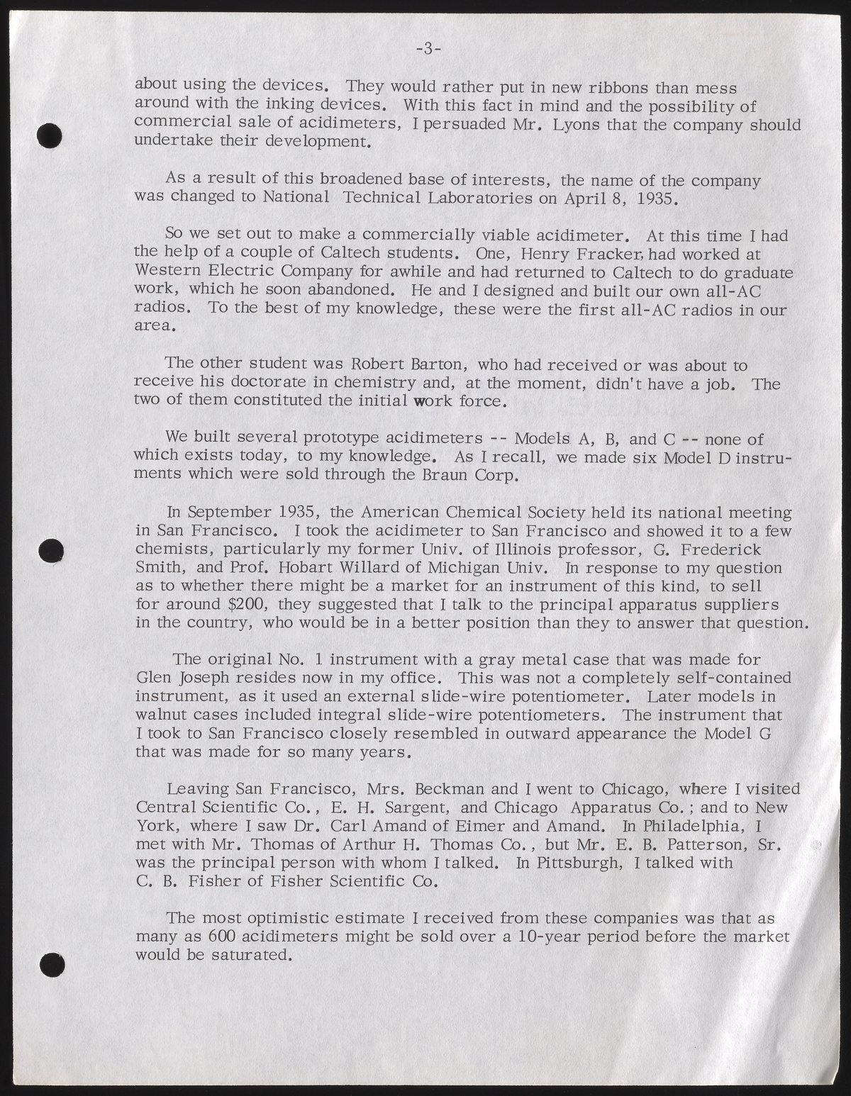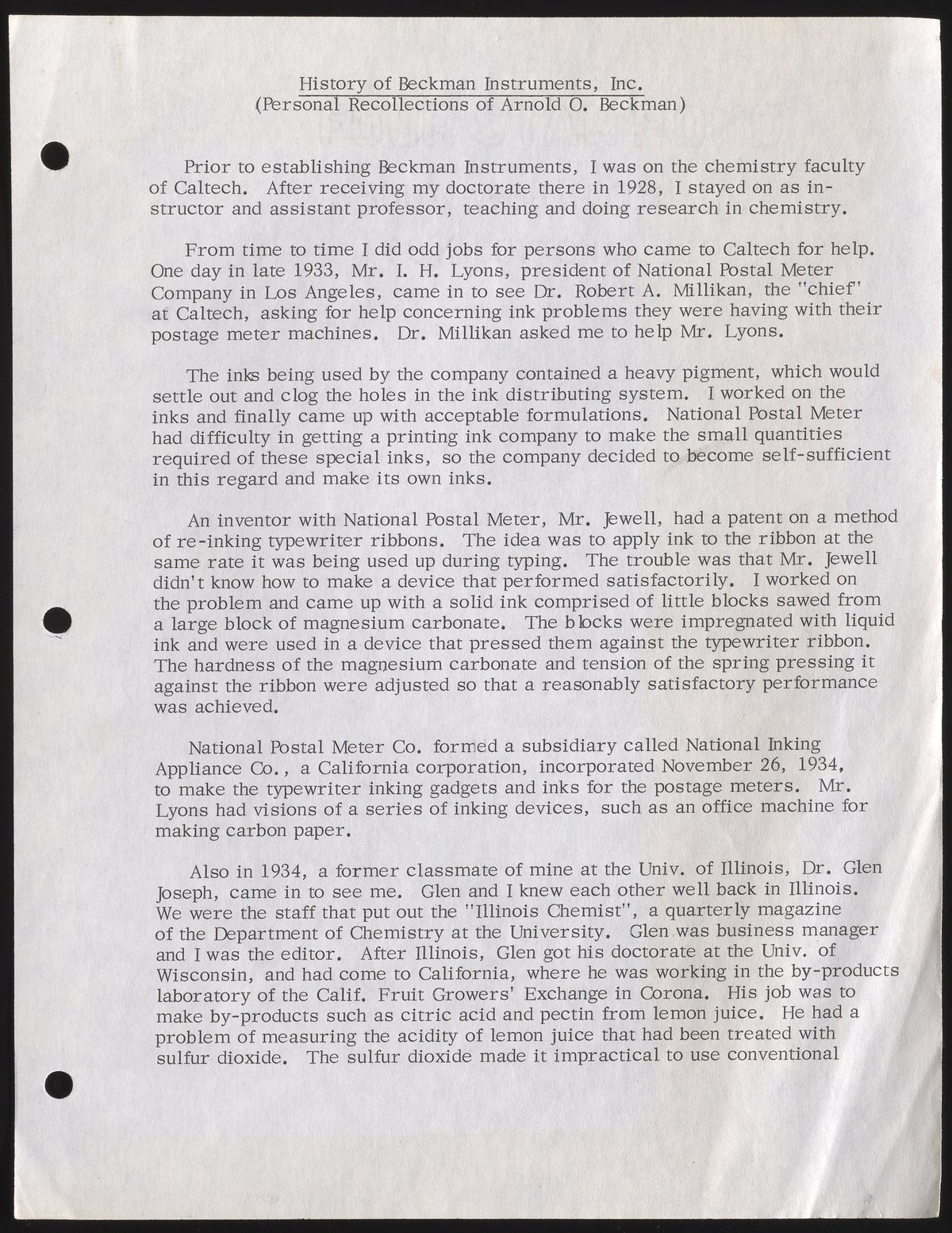 Small JPG1200 x 1553px — 443 KBFull-sized JPG2649 x 3428px — 1.7 MBOriginal fileTIFF — 2649 x 3428px — 26.0 MBThe account focuses on the early days of Beckman's entrepreneurial endeavors, from Robert Millikan referring I. H. Lyons to Beckman for assistance with National Postal Meter Company inks through the renting of a new National Technical Laboratories building on East Colorado Street. The account is not strictly chronological, however, and references to events such as an employee's 1974 retirement date it to an advanced stage of Beckman's career.