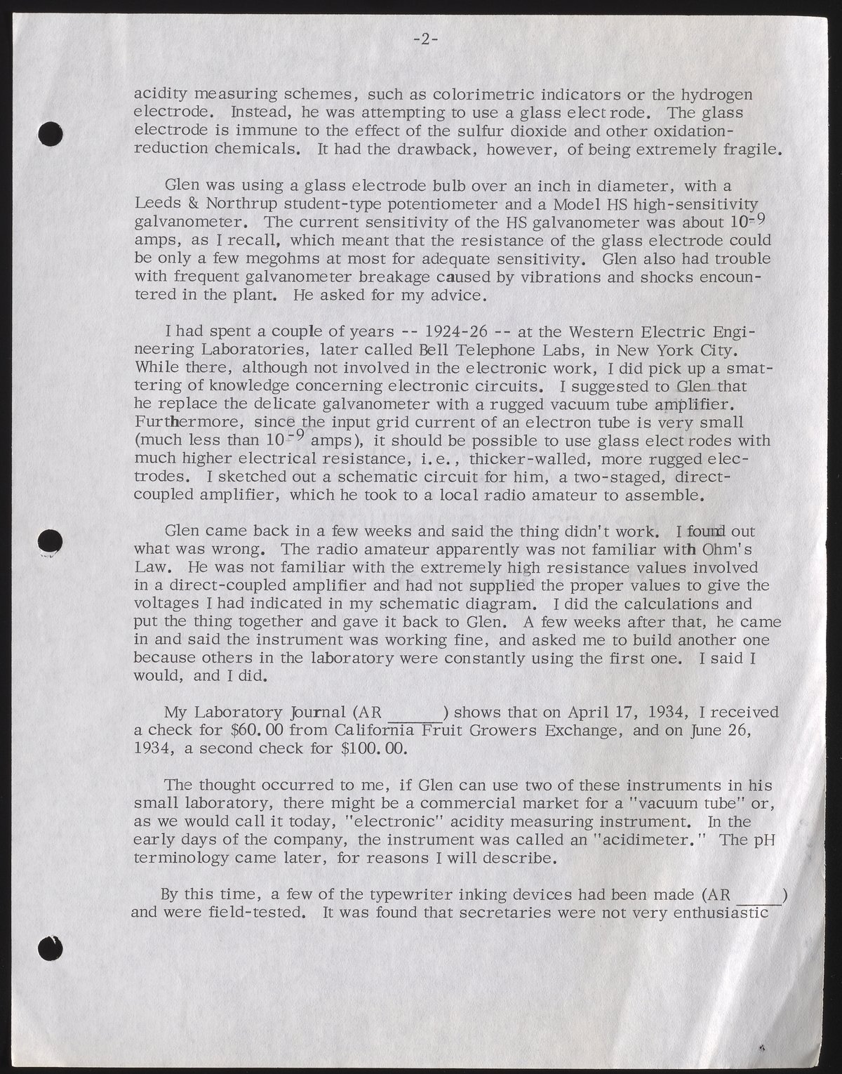 Beckman, Arnold O. “History of Beckman Instruments, Inc.,” n.d. Beckman Historical Collection, Box 14, Folder 8. Science History Institute. Philadelphia. https://digital.sciencehistory.org/works/ht24wj50x.