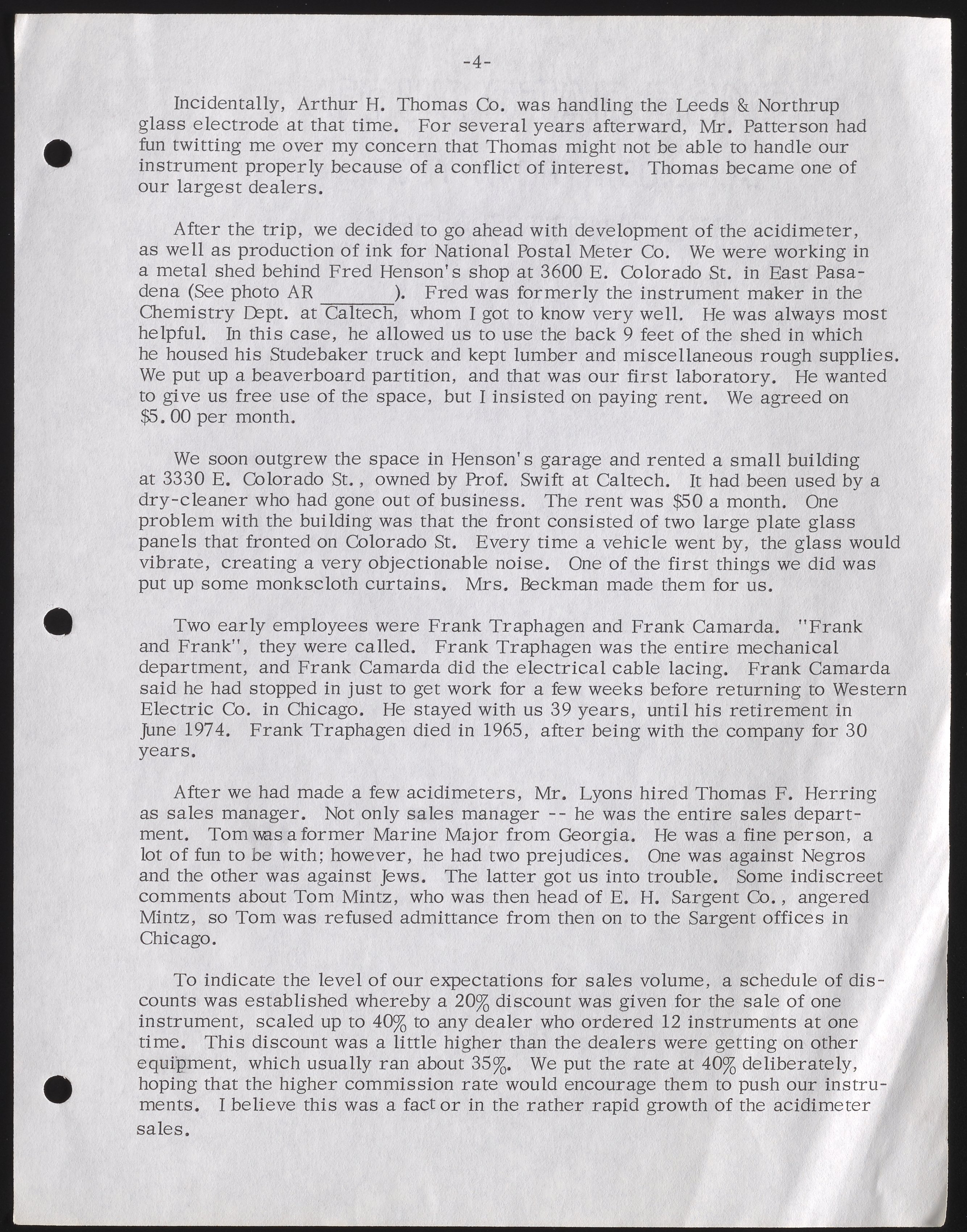 Beckman's account includes a mention of early associates and employees, including Glen Joseph, Henry Fracker, Robert Barton, Fred Henson, Frank Traphagen, Frank Camarda, Thomas F. Herring, and Tom Mintz, as well as references to Mabel Beckman's involvement in the business. The physical attributes of company buildings, meetings with distributors, discount schedules, and the negative business impact of a prejudiced sales manager are also included.