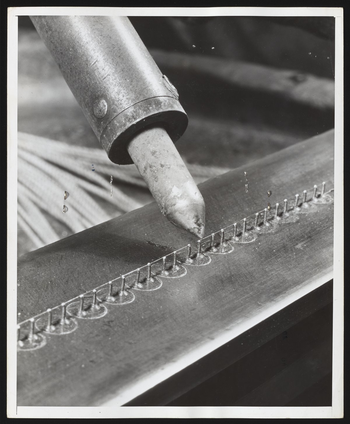Close-up view of the soldering of wire at the Hercules Powder Company plant in Port Ewen, New York. During the production of electric blasting caps, wires were inserted into the base of a bridging machine while a mixture of sulfur, graphite, and mica was poured in a mold to form a plug around the so-called leg wires. Then, a platinum alloy bridge wire was soldered across the two ends of wire protruding from the plug. Following inspection, the plugs subsequently were sent to the Filling Room to be inserted into shells.