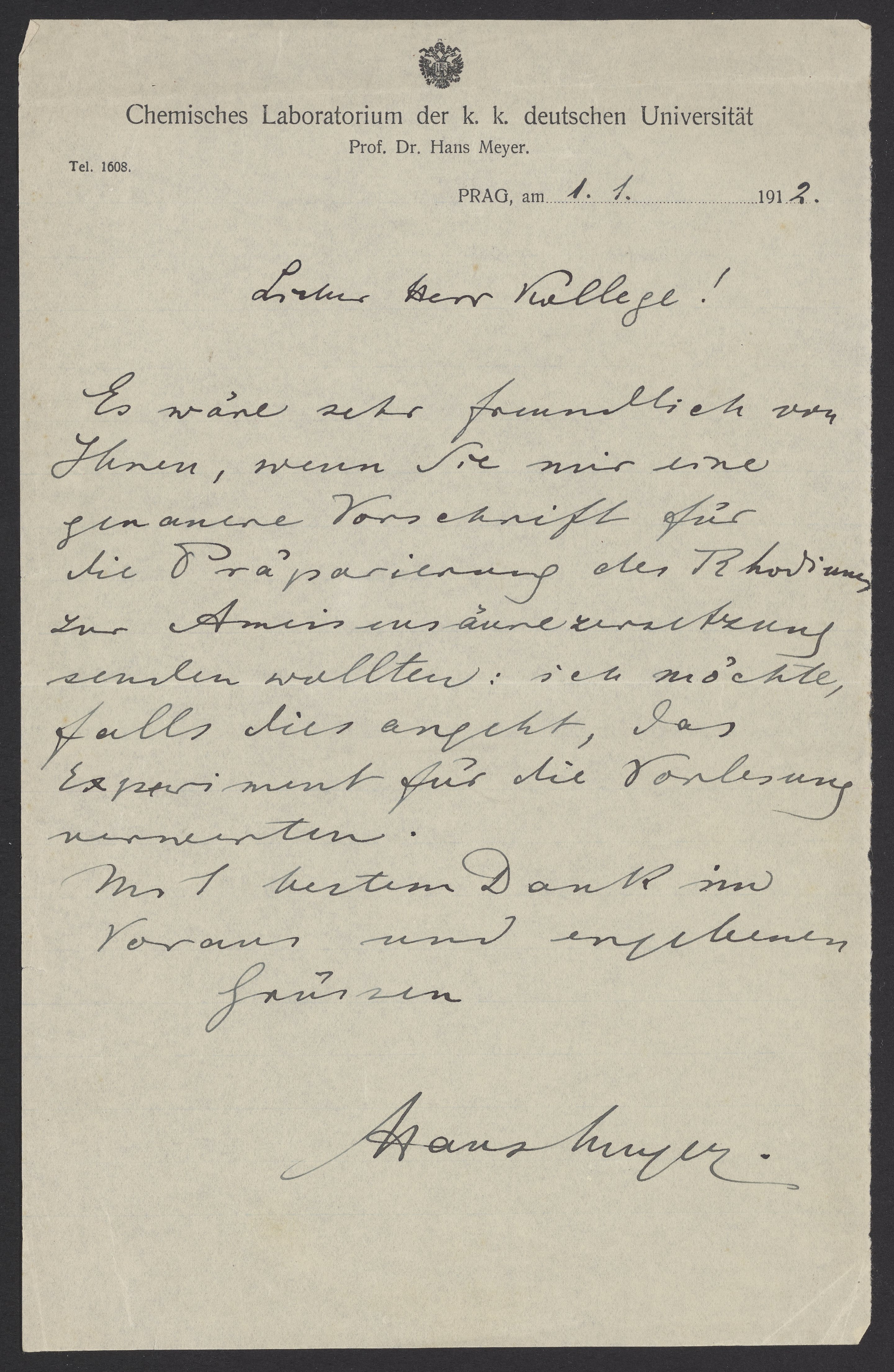 Letter from Hans Meyer (1858 -1929) a geographer and professor at the University of Leipzig. Meyer asks Georg Bredig (1868-1944) about the preparation of rhodium.