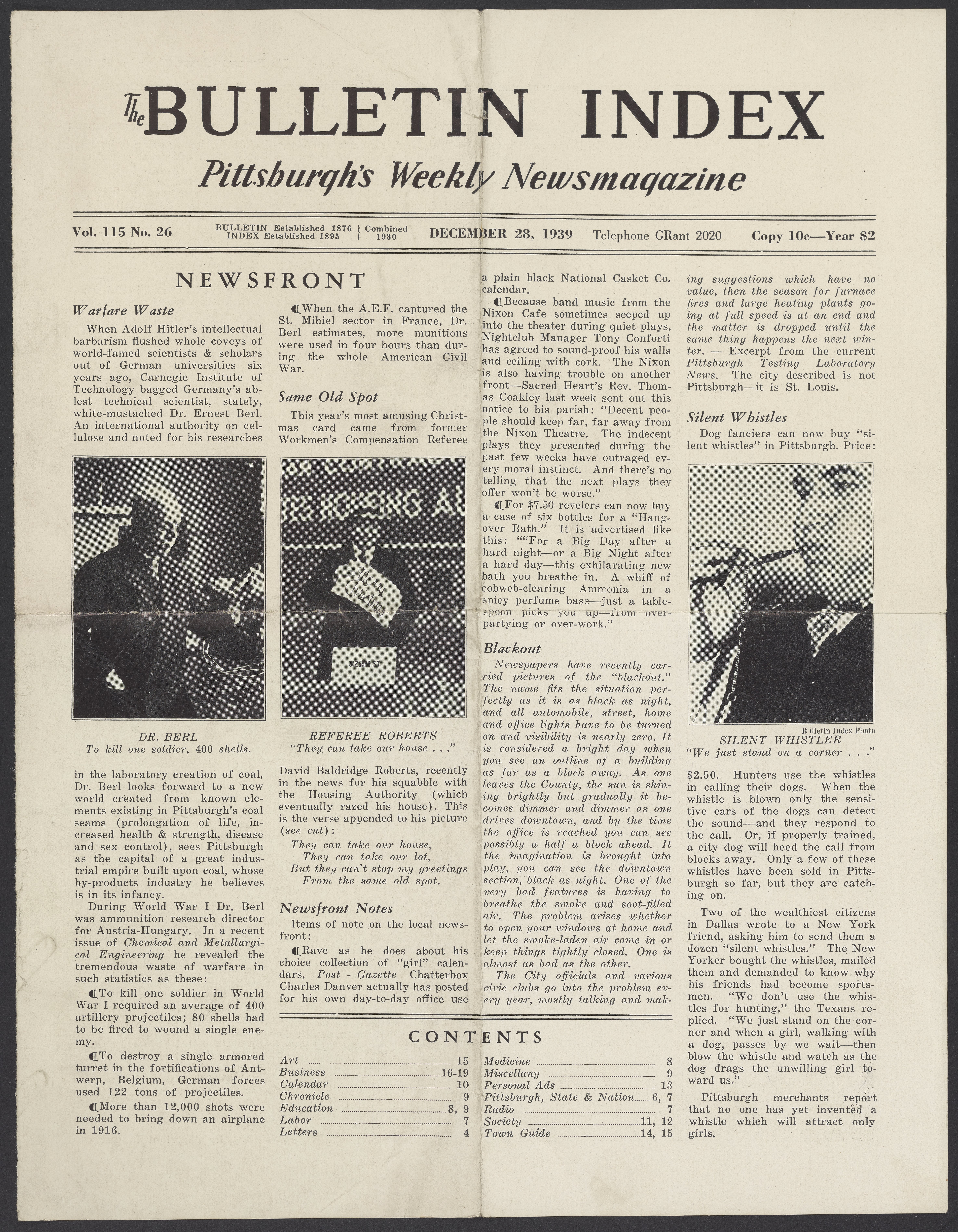 Front page and page 6 of the December 28, 1939 issue of the Bulletin Index: Pittsburgh's Weekly Newsmagazine. The article on the top left, titled "Warfare Waste," features Ernst Berl (1877-1946) discussing ammunition waste.
