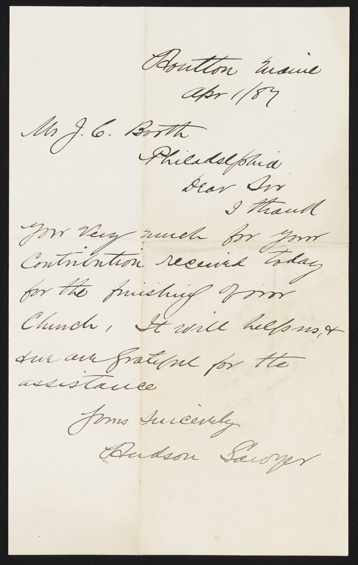 A thank you note from Hudson Sawyer to James Curtis Booth (1810-1888) for Booth's contribution toward church furnishings.