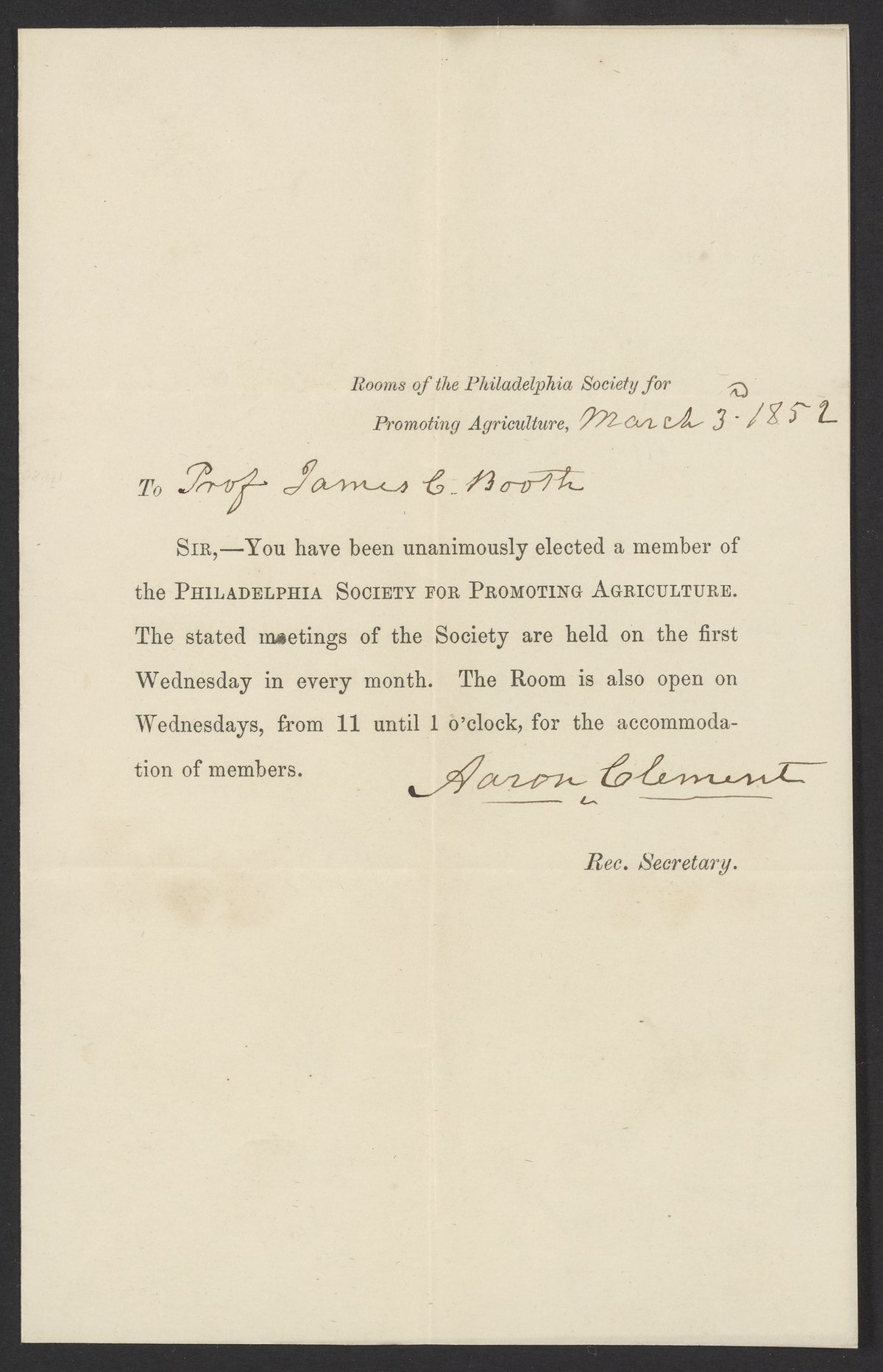Letter from Aaron Clement, recording secretary of the Philadelphia Society for Promoting Agriculture, informing James Curtis Booth (1810-1888) that he has been unanimously elected a member of the society.