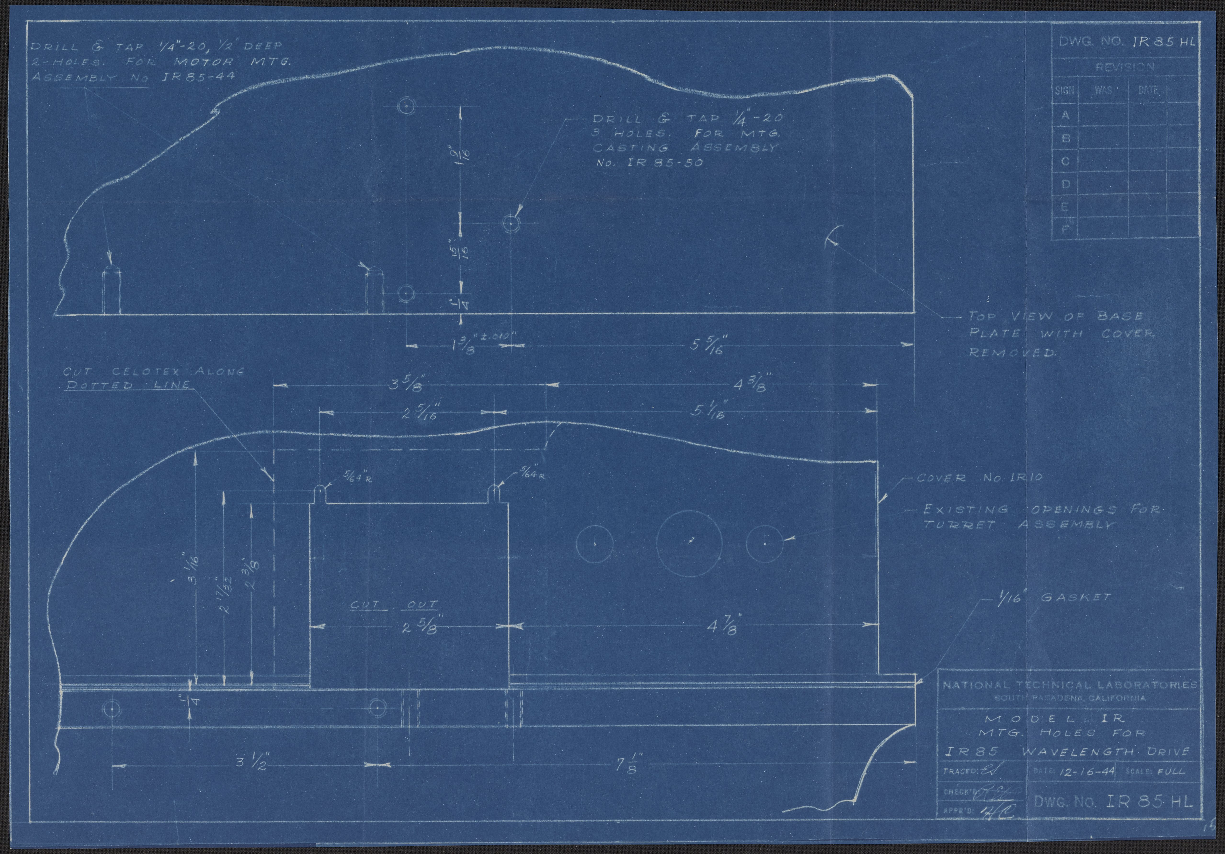 Beckman Instruments, Inc. “Mtg. Holes for Beckman IR-85 Spectrophotometer Wavelength Drive,” December 16, 1944. Beckman Historical Collection, Box 18, Folder 9. Science History Institute. Philadelphia. https://digital.sciencehistory.org/works/hx11xf24j.
