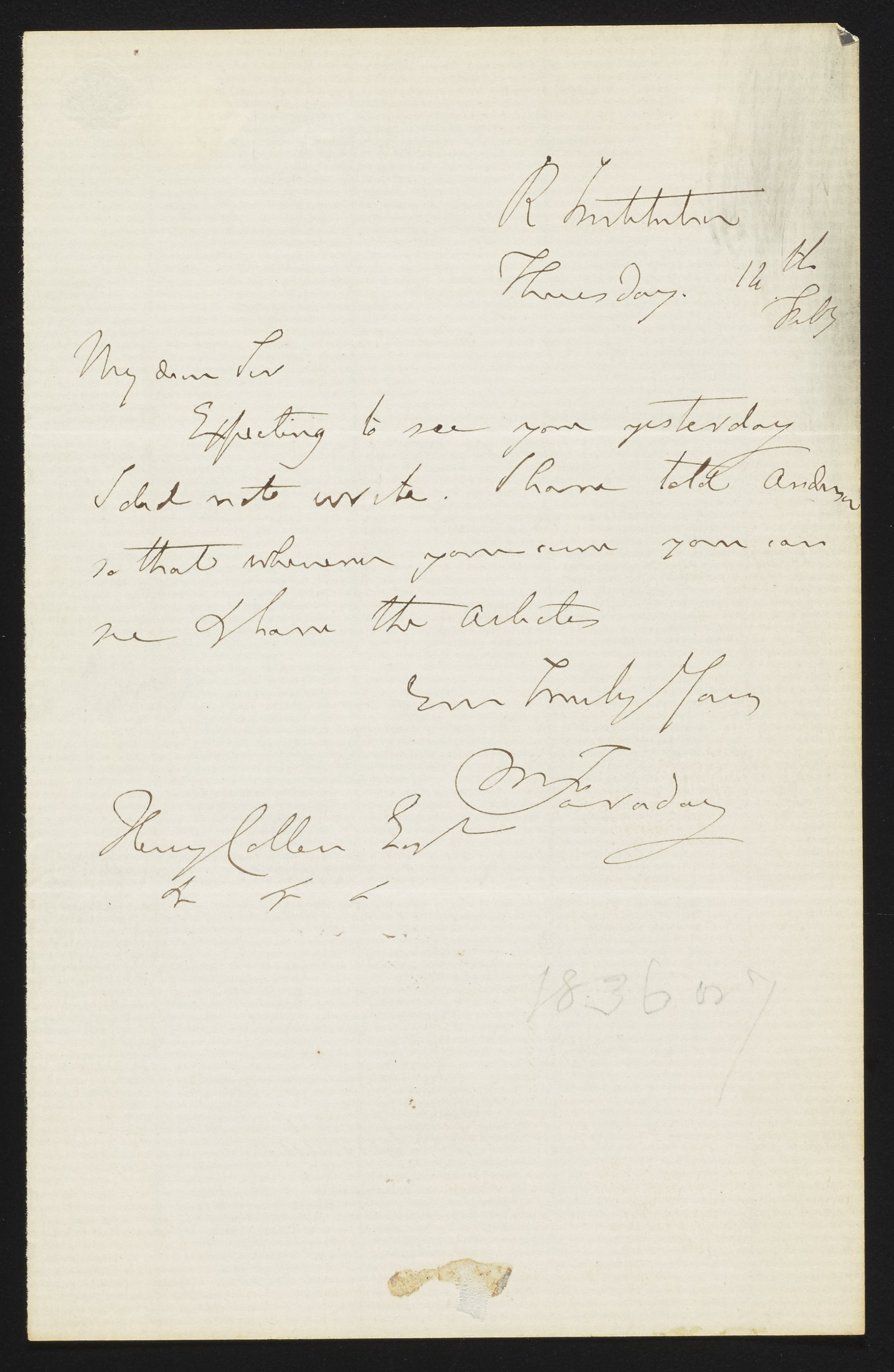 Faraday, Michael. “Letter from Michael Faraday to Henry Cullen,” February 14, 1836. Szymanowitz Autographed Letter Collection, Box 1. Science History Institute. Philadelphia. https://digital.sciencehistory.org/works/hx11xf263.
