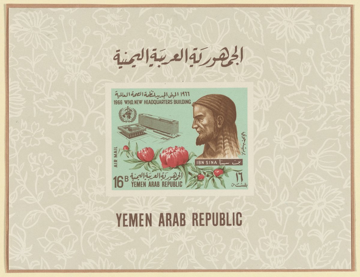 Postcard with Yemen postage stamp commemorating the inauguration of new World Health Organization offices