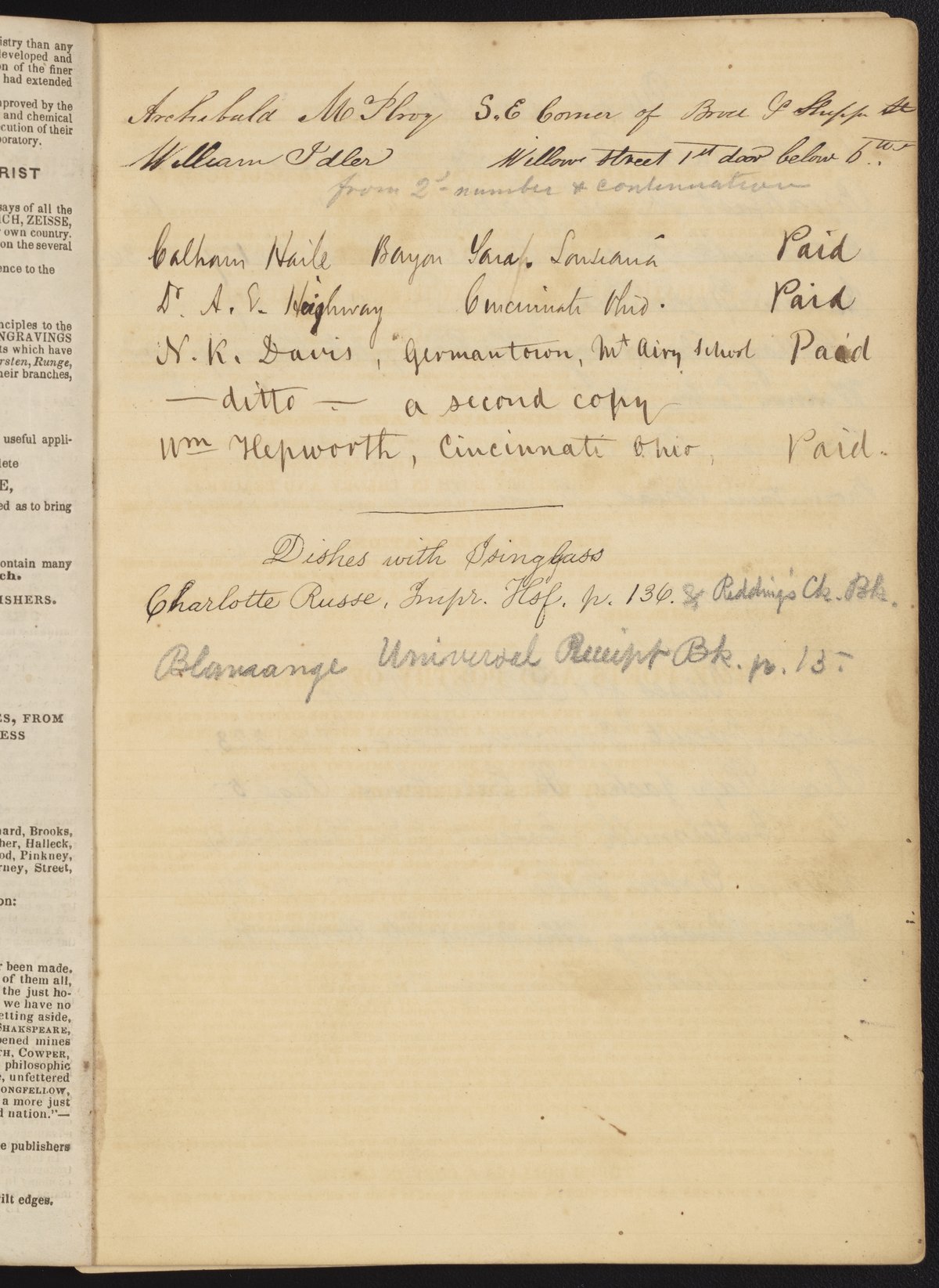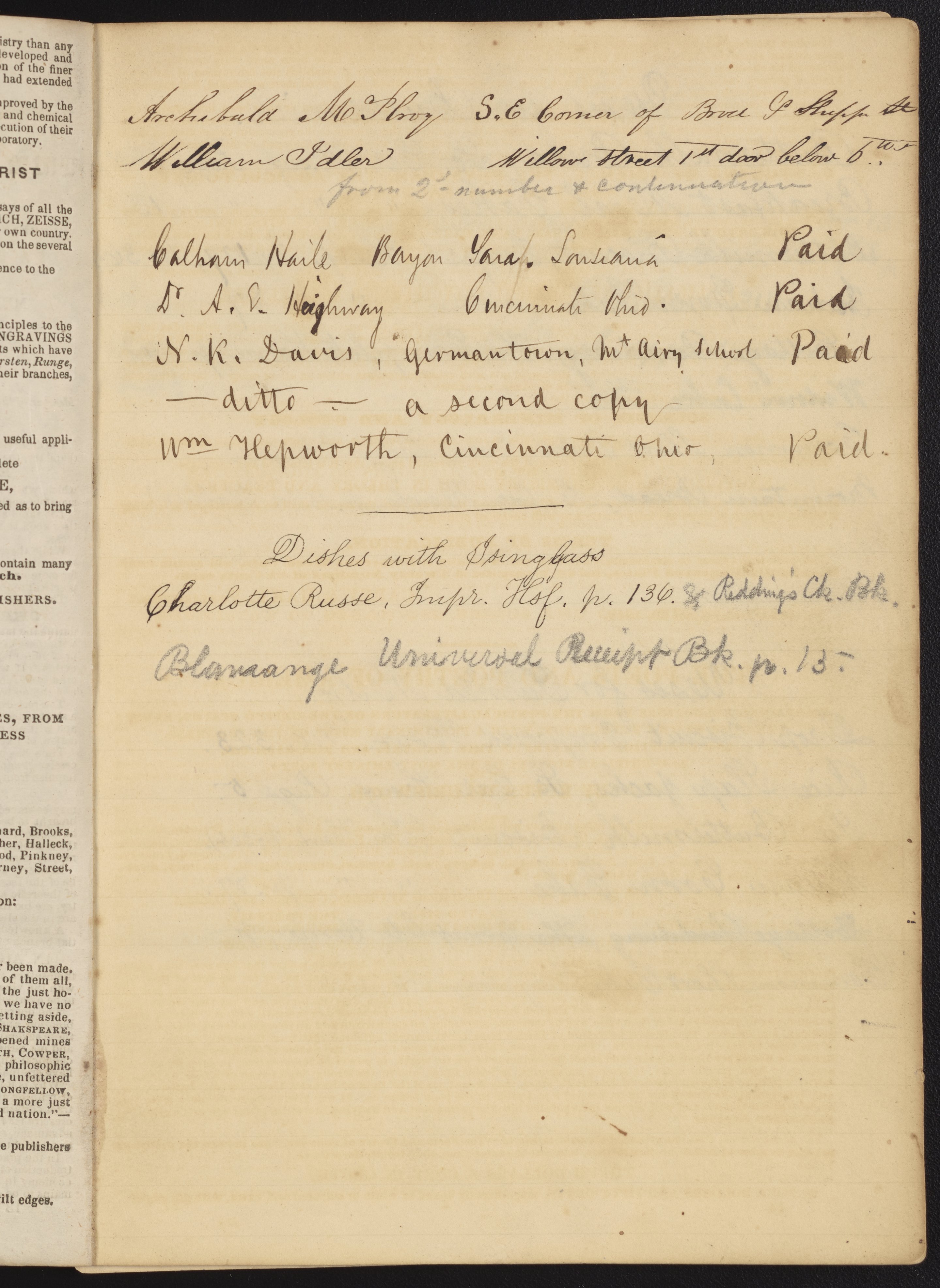 Small JPG1200 x 1696px — 433 KBLarge JPG2880 x 4070px — 2.1 MBFull-sized JPG3994 x 5644px — 3.6 MBOriginal fileTIFF — 3994 x 5644px — 64.6 MBA notebook containing handwritten references to various recipes and uses for ingredients. The first page includes an advertisement for The Encyclopedia of Chemistry, Practical and Theoretical: Embracing Its Application to the Arts, Metallurgy, Mineralogy, Geology, Medicine, and Pharmacy (1850) by James Curtis Booth (1810-1888) and Campbell Morfit (1820-1897).