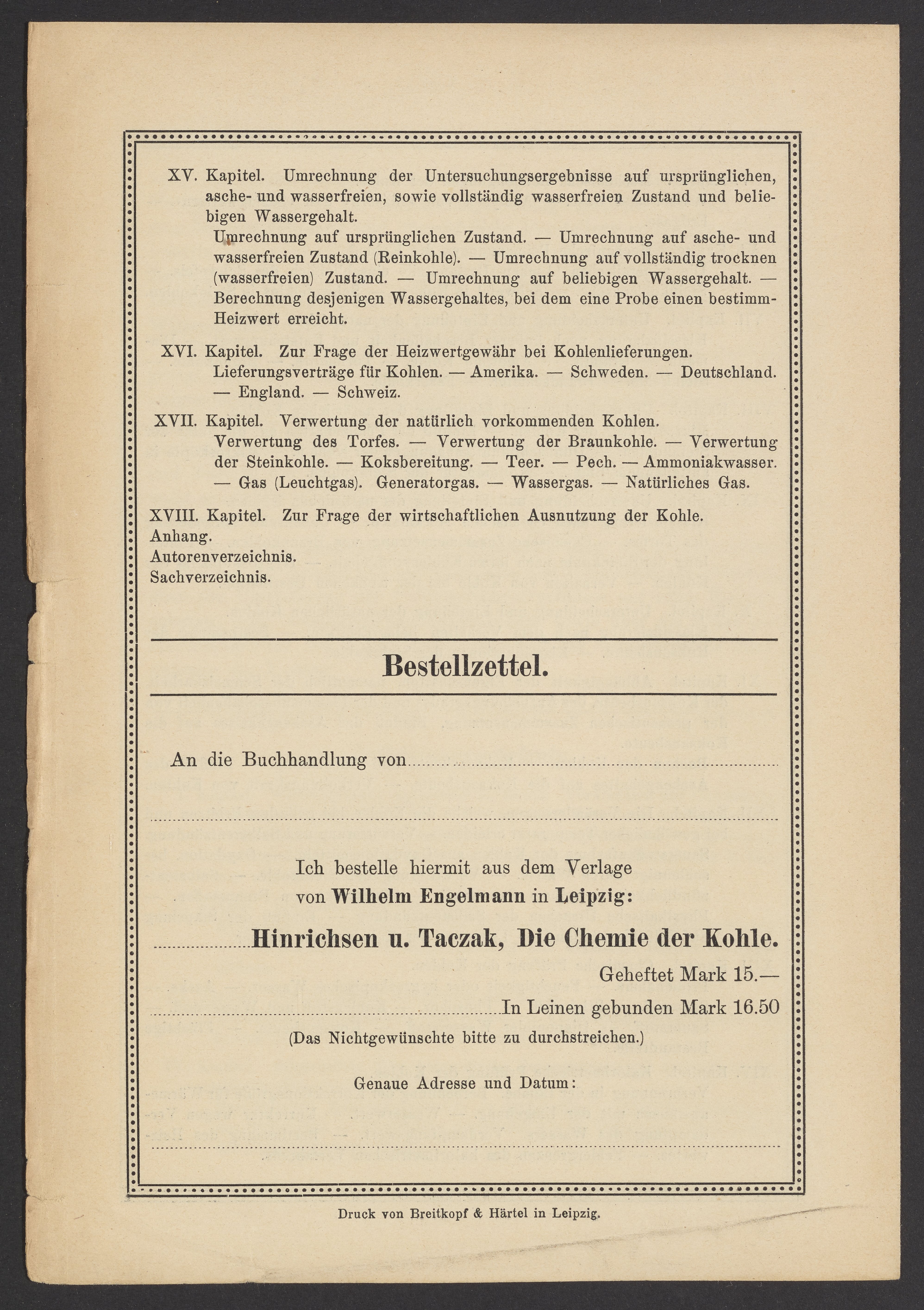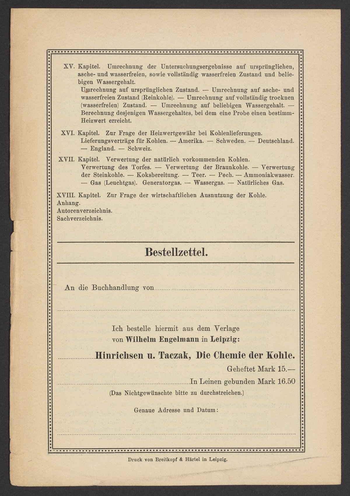 “Die Chemie Der Kohle.” Verlag von Wilhelm Engelmann, 1916. Papers of Georg and Max Bredig, Box 3, Folder 5. Science History Institute. Philadelphia. https://digital.sciencehistory.org/works/i1ij1fz.