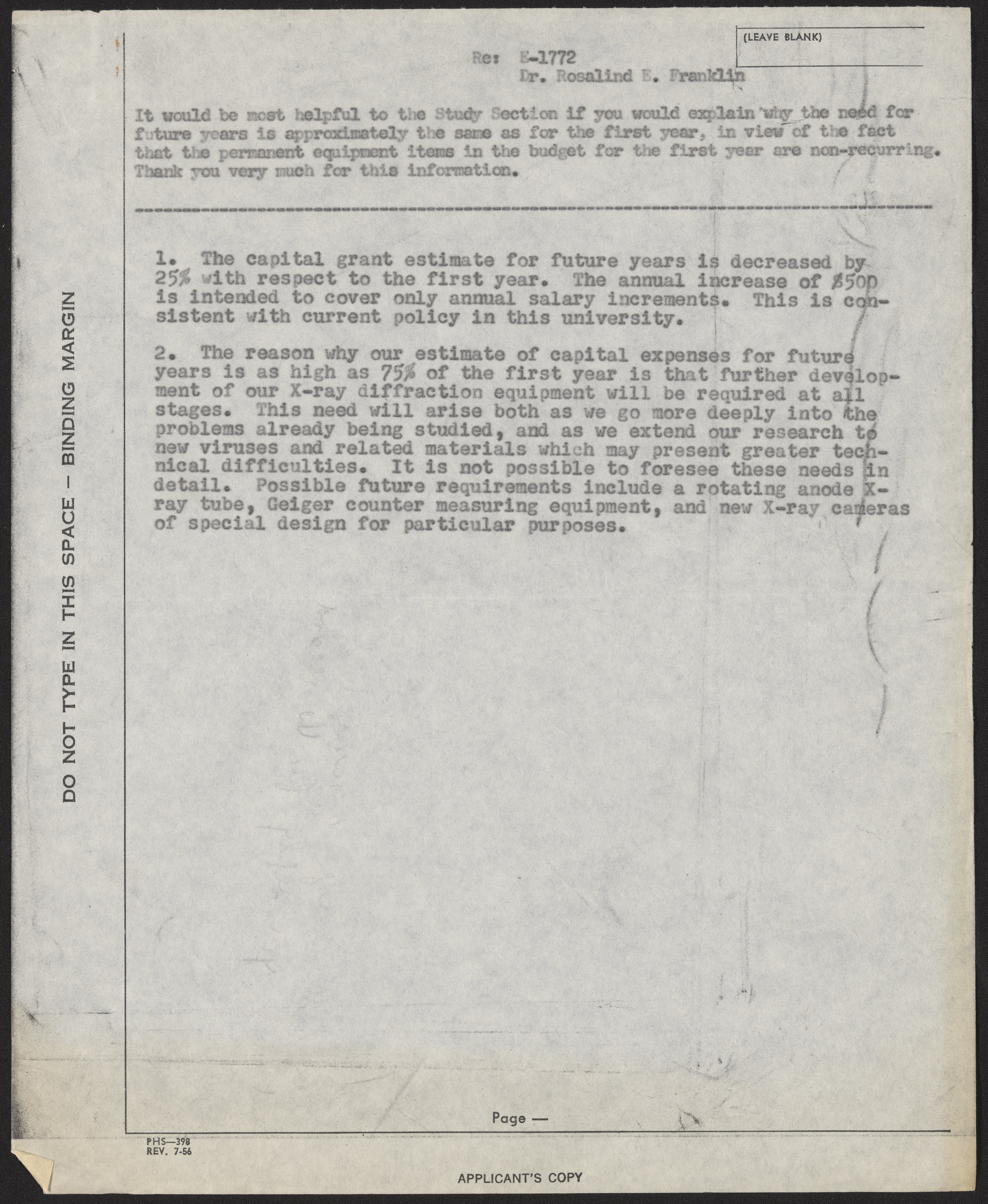 Franklin, Rosalind. “Page from Rosalind Franklin's Grant Application to the National Institute of Health,” 1956. History of Molecular Biology Collection, Box 10, Folder 6. Science History Institute. Philadelphia. https://digital.sciencehistory.org/works/i4dqalu.