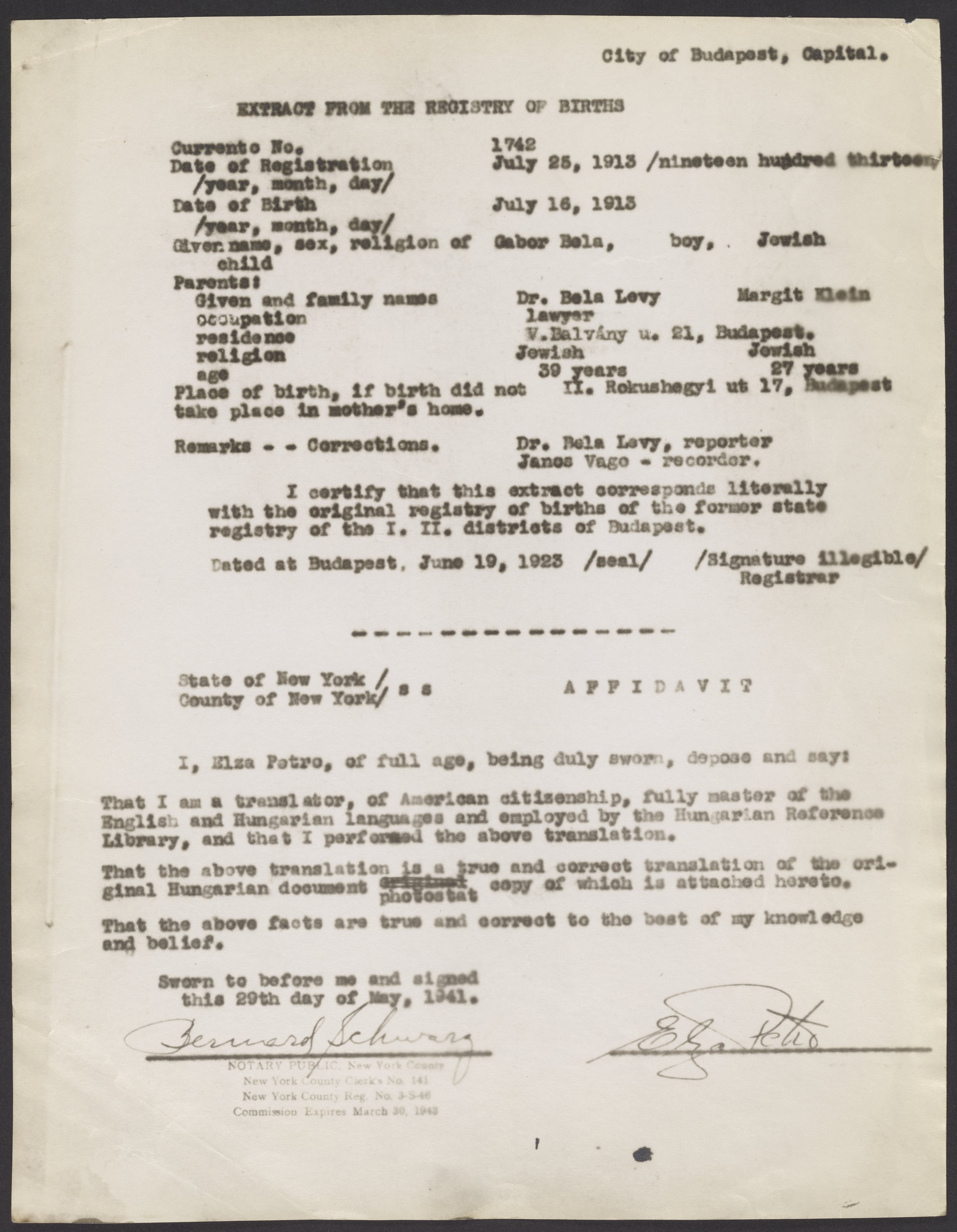 English translation of Gabor B. Levy's (1913-1999) Hungarian birth record, which includes information about his parents and the family's religious identity. Gabor's birth was registered in Budapest, Hungary on June 19, 1923. The translation is dated May 29, 1941, and was done by Elsa Petro of the Hungarian Reference Library.