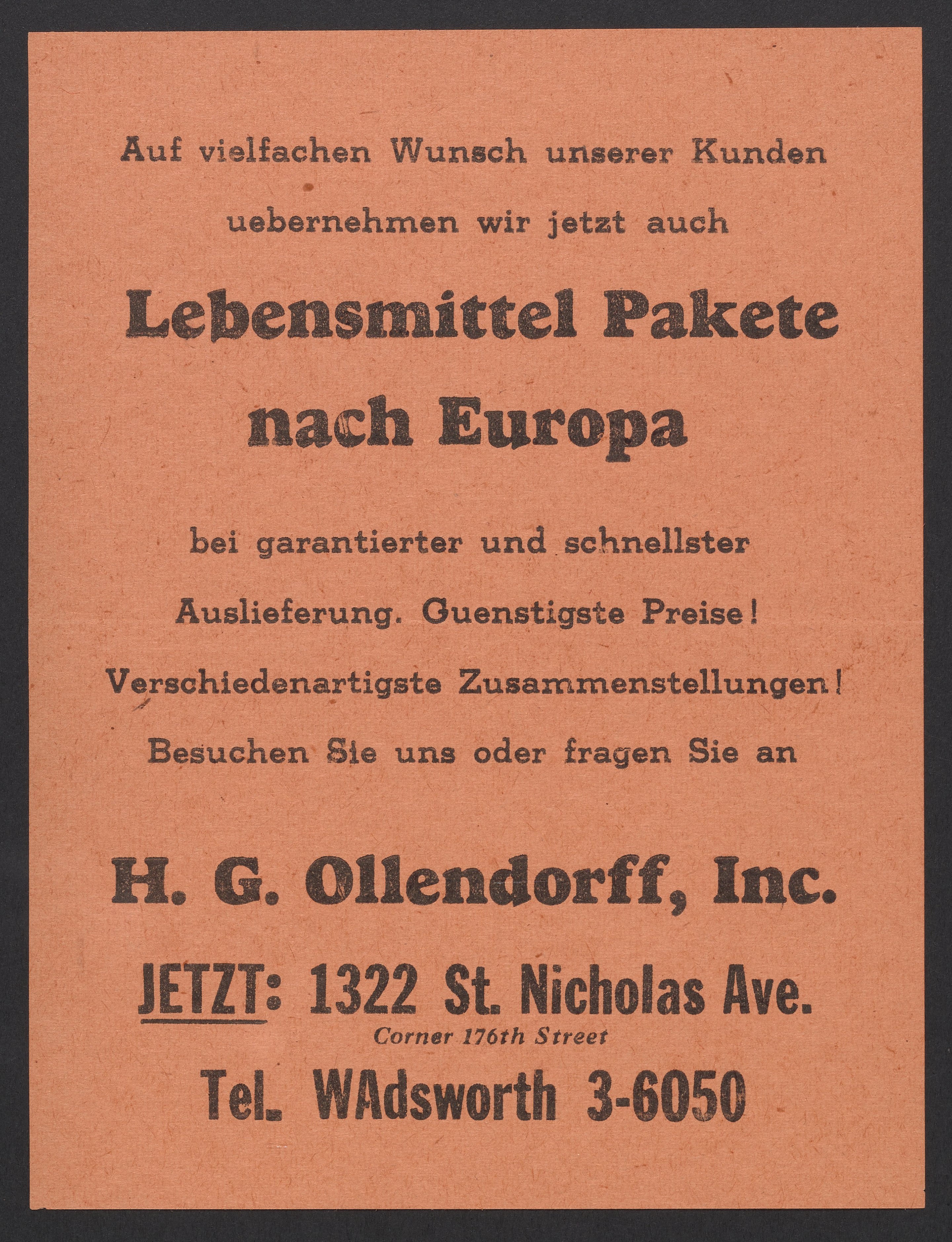 Advertisement from H.G Ollendorff, Inc. for sending food parcels from the U.S.A to Europe
