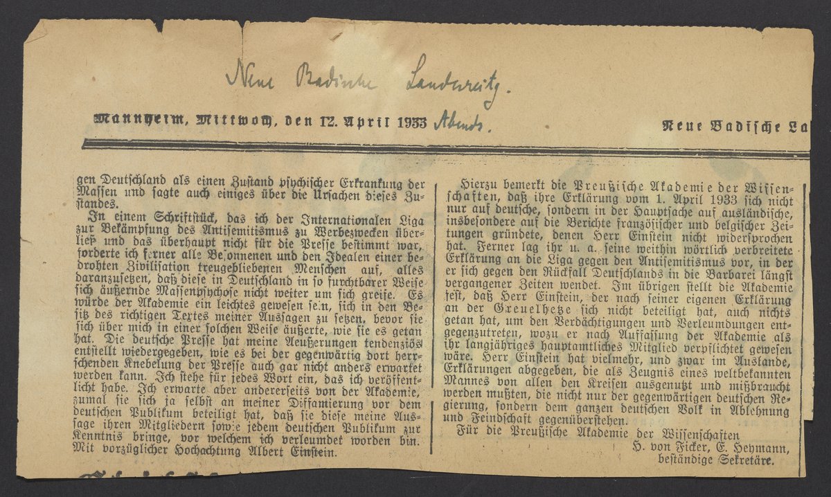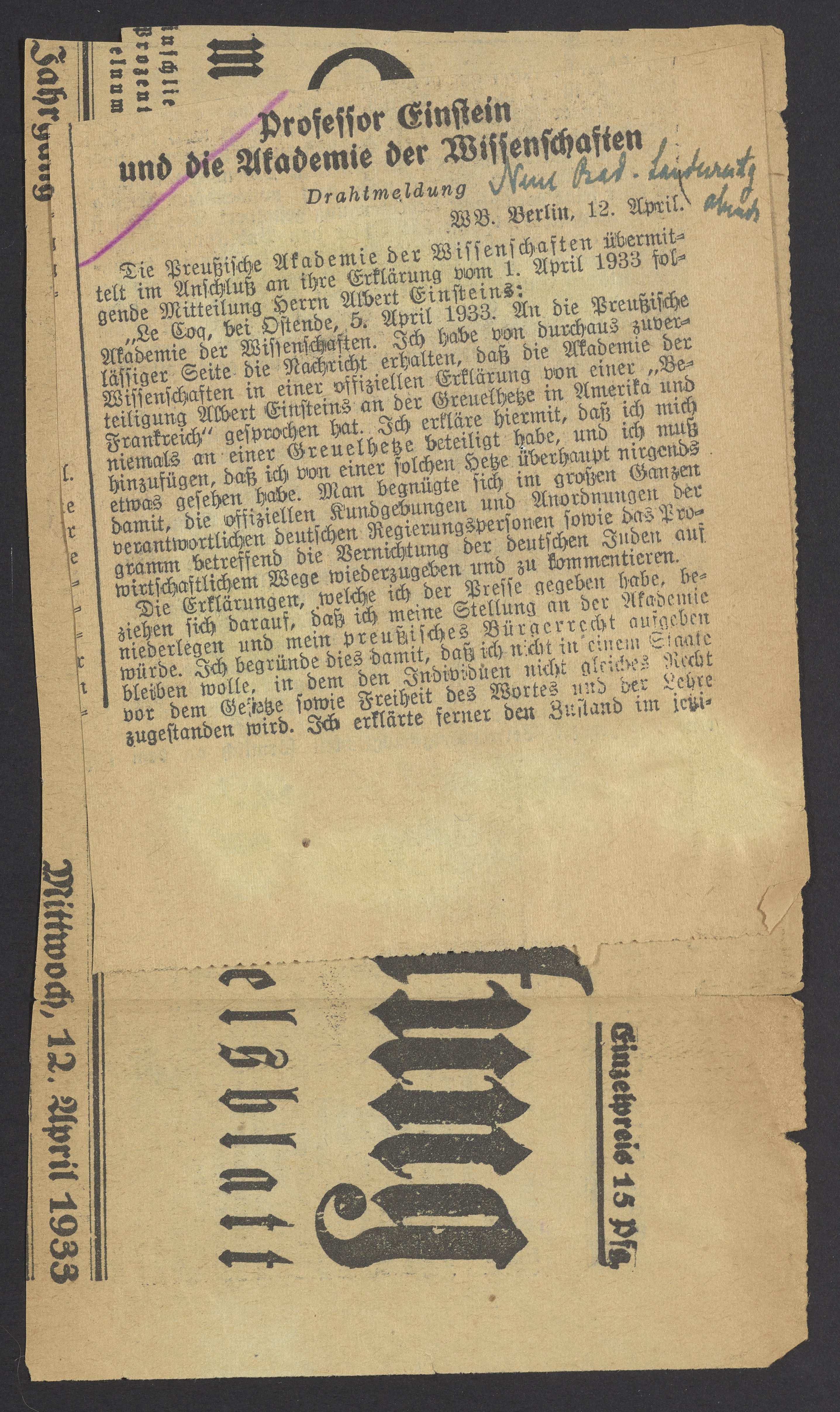 “Professor Einstein Und Die Akademie Der Wissenschaften,” April 12, 1933. Papers of Georg and Max Bredig, Box 5, Folder 2. Science History Institute. Philadelphia. https://digital.sciencehistory.org/works/i65ieb8.