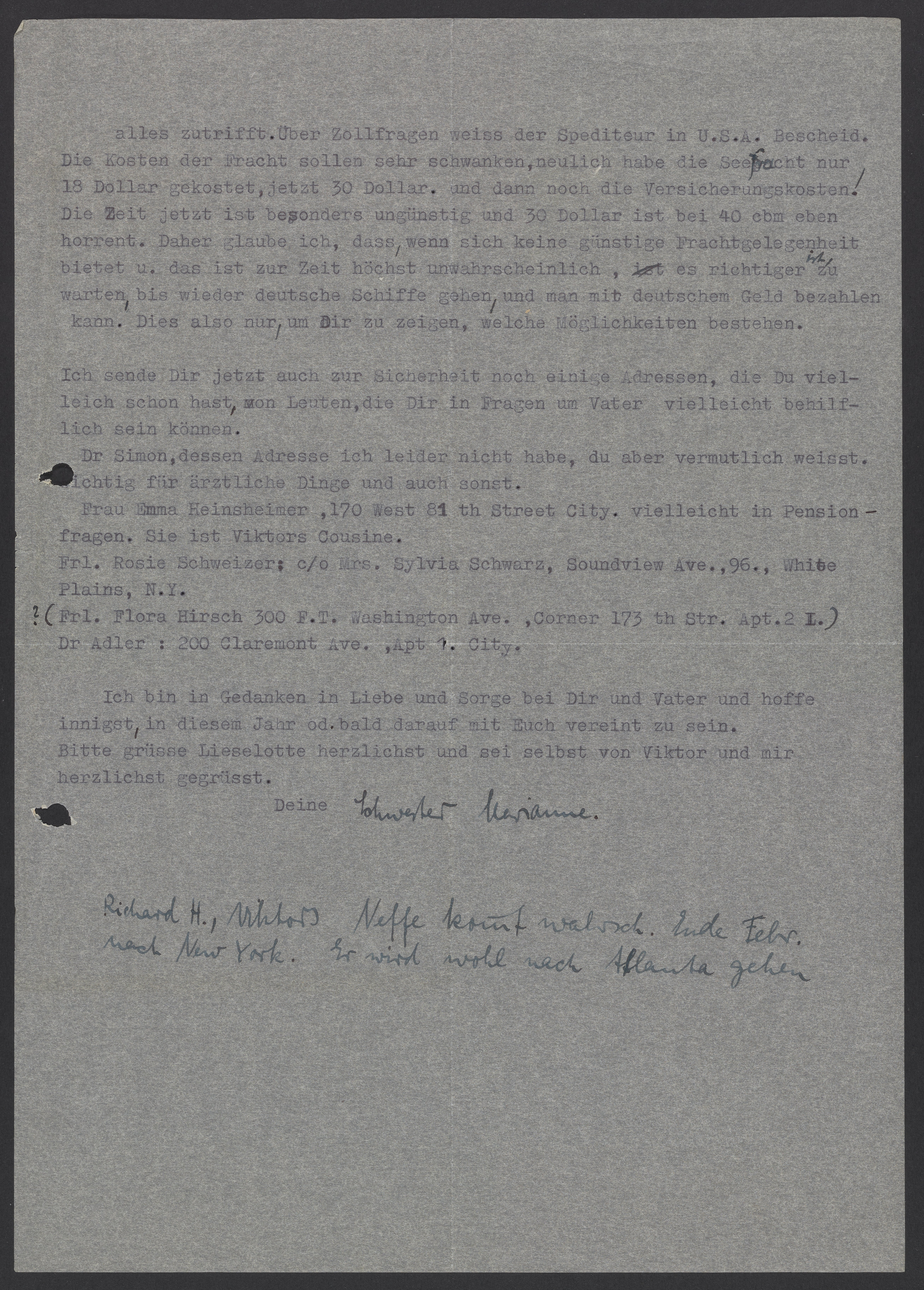 Richard H., Viktors Neffe kommt wahrsch. Ende Febr. nach New York. Er wird wohl nach Atlanta gehen.