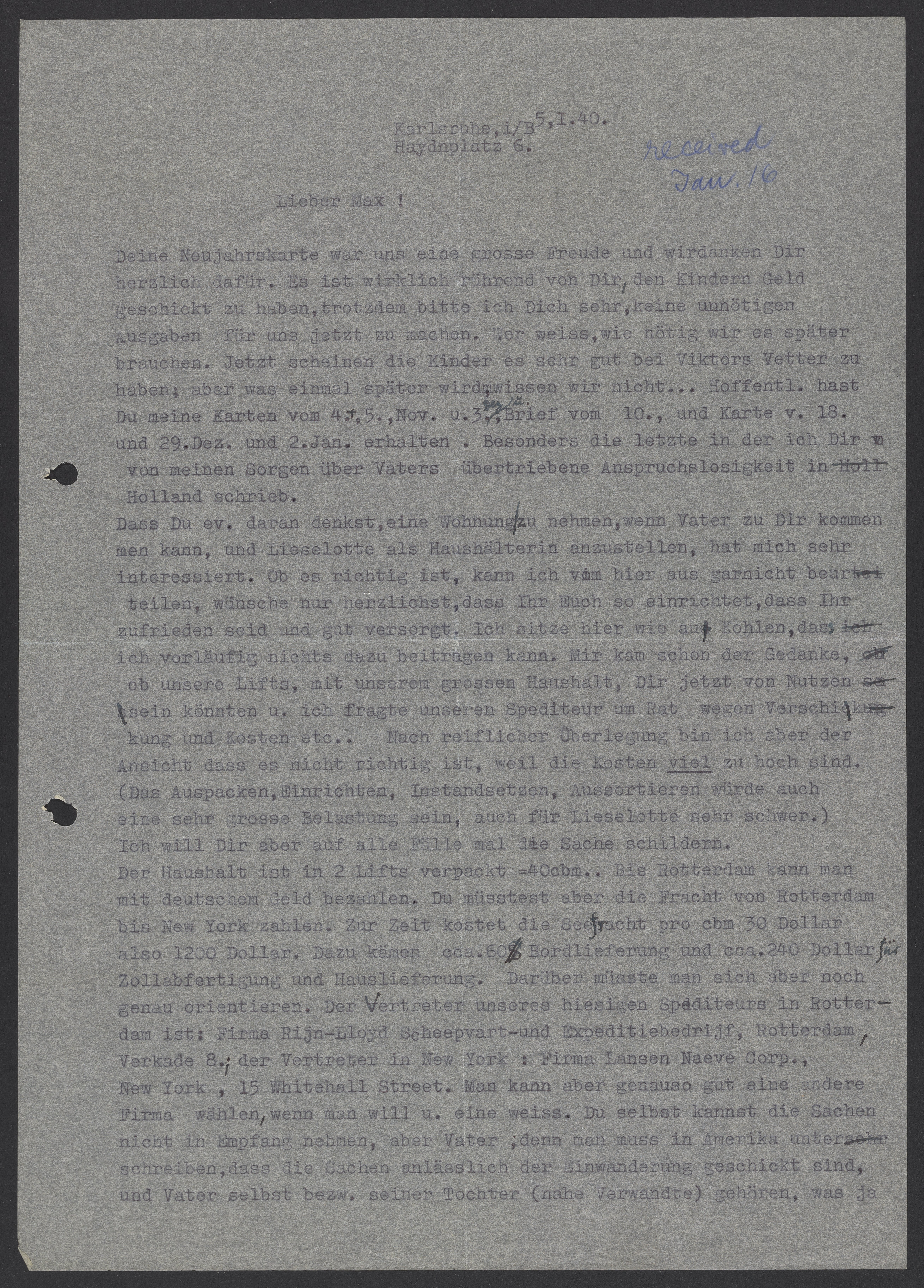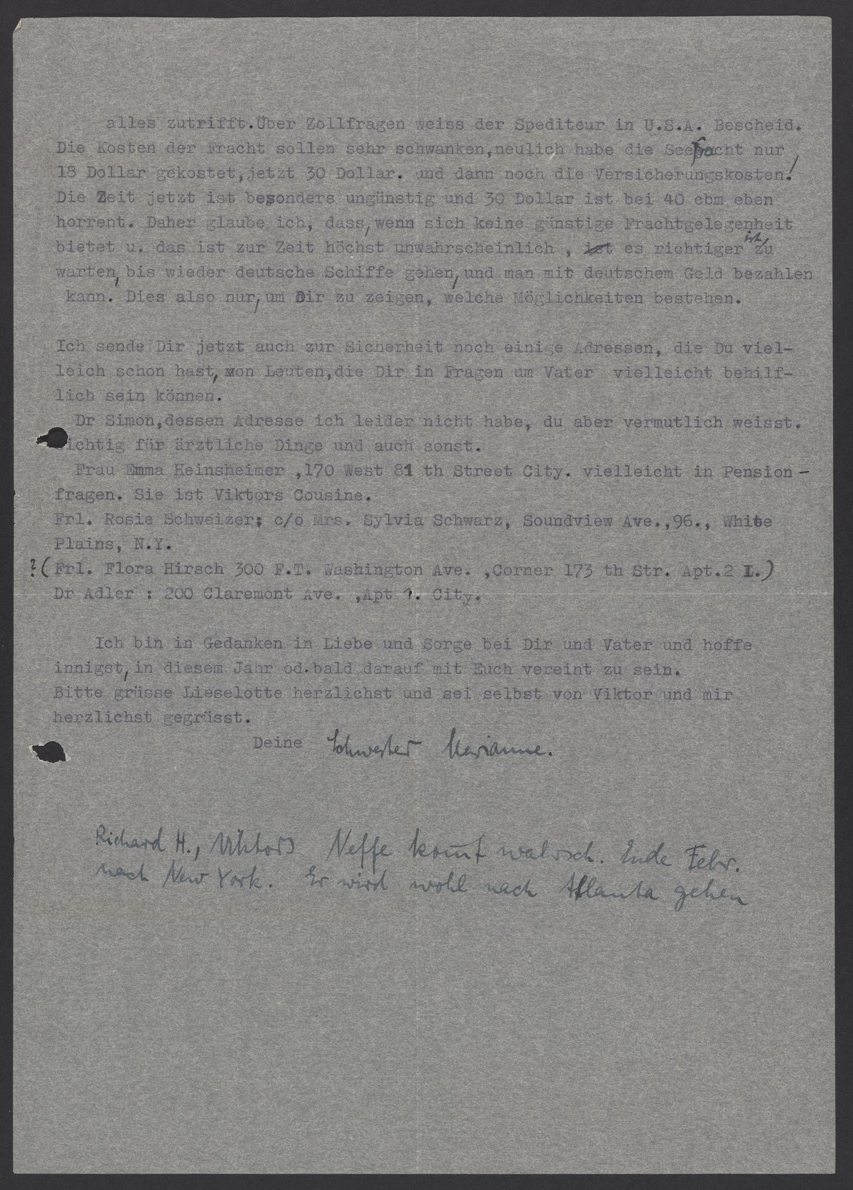 Small JPG1200 x 1672px — 470 KBLarge JPG2880 x 4014px — 3.2 MBFull-sized JPG5242 x 7306px — 9.6 MBOriginal fileTIFF — 5242 x 7306px — 110 MBIn a letter to her brother, Max Bredig (1902-1977), Marianne Homburger (1903-1987) discusses the costs of shipping household belongings from Germany to New York.