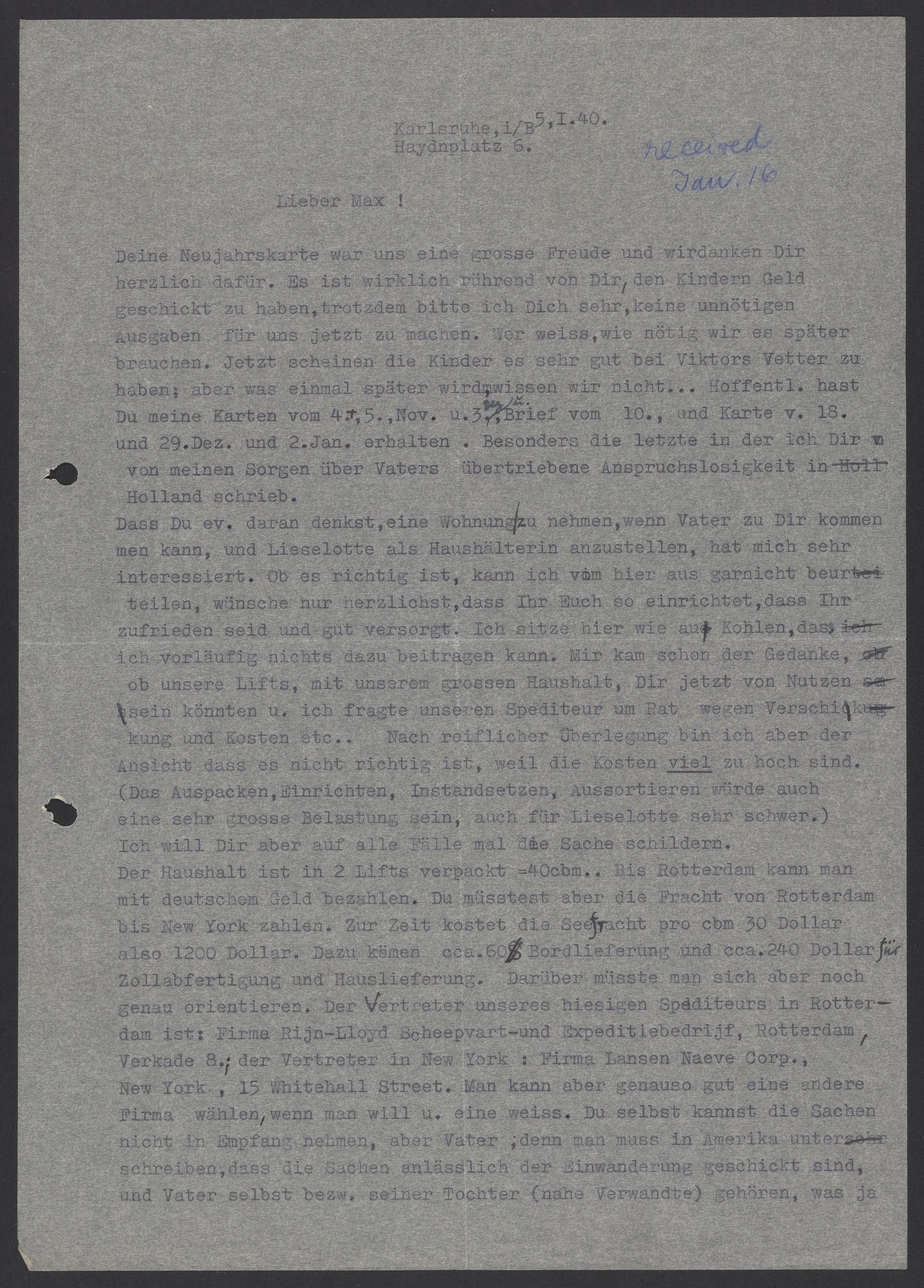 The household belongs are packed in two trunks = 40 cubic meters. We can pay with German money for shipments to Rotterdam. However, you would have to pay the freight costs from Rotterdam to New York. Currently, the ocean freight costs $30 dollars per cubic meter, i.e., $1,200. In addition, there would be approximately $60 for on board delivery and $240 dollars for customs clearance and home delivery. However, we would still have research this further. The representative of our local freight forwarder in Rotterdam is Rijn-Lloyd Scheepvart – and Expeditiebedrijf, Rotterdam, Verkade 8. The representative in New York is Lansen Naeve Corporation, Whitehall Street, New York. Nevertheless, you can choose a company if you want to and know of one. You cannot accept the trunks. Father would have to do this because in the U.S.A., you must confirm that the things were sent because of immigration and belong to Father or his daughter (close relatives).