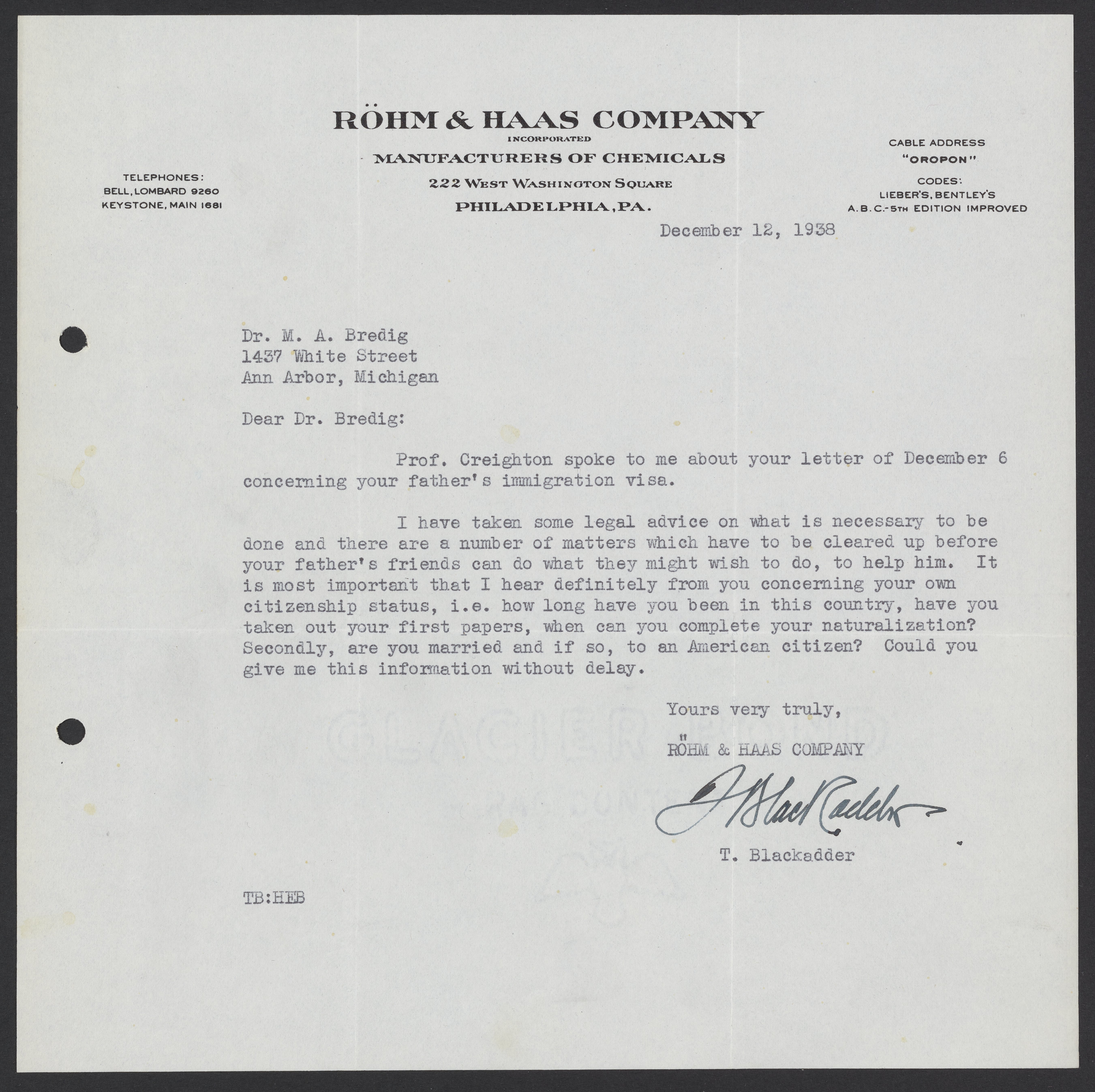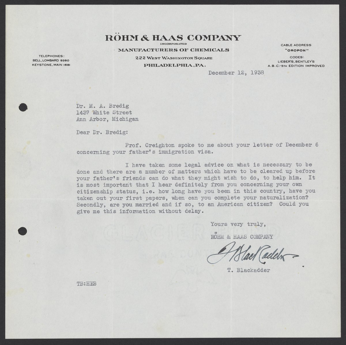 Blackadder, Thomas. “Letter from Thomas Blackadder to Max Bredig, December 1938,” December 12, 1938. Papers of Georg and Max Bredig, Box 7, Folder 6. Science History Institute. Philadelphia. https://digital.sciencehistory.org/works/i96h6vp.