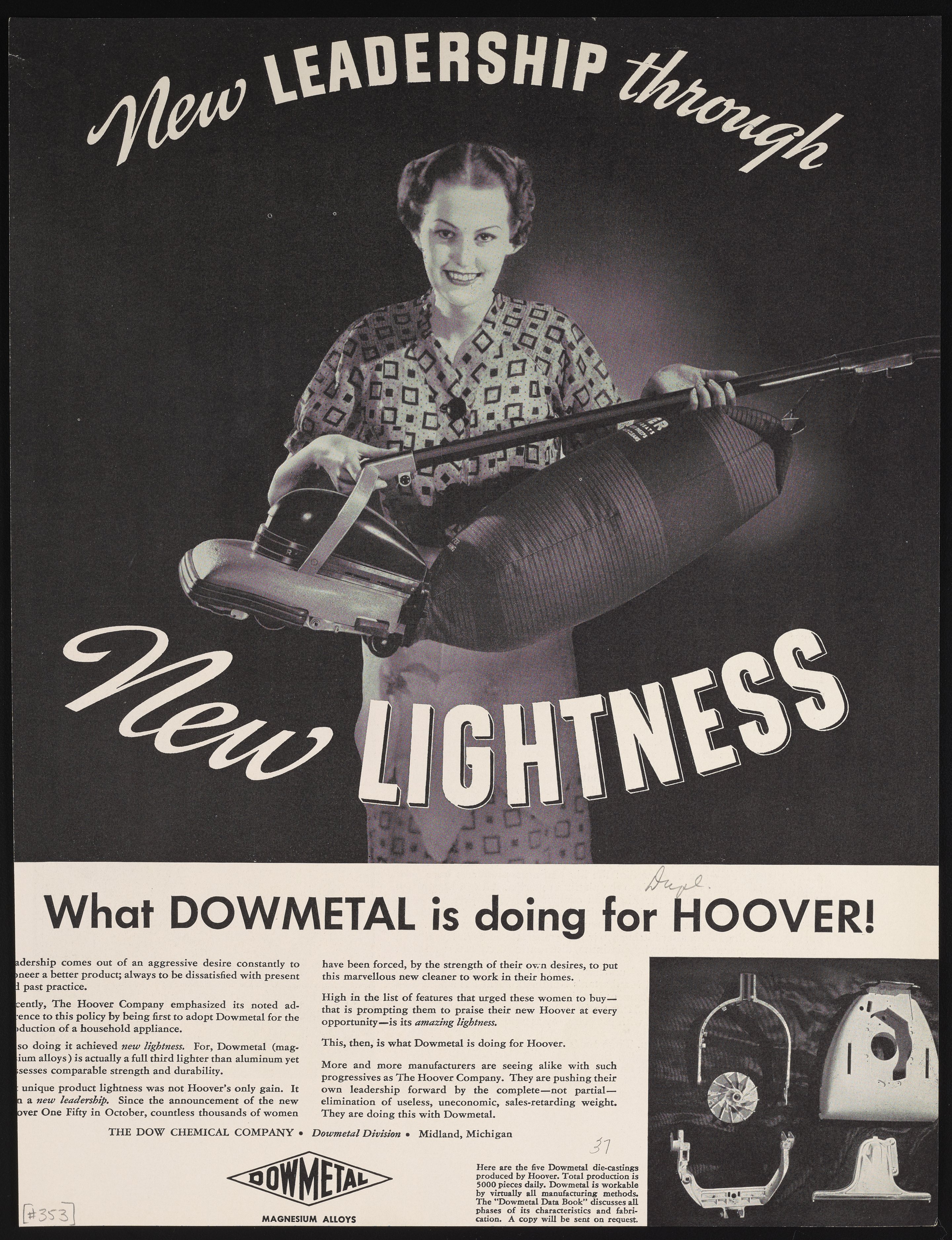 Print advertisement for Dowmetal, a magnesium alloy manufactured and sold by the Dow Chemical Company. The advertisement features a woman against a plain background holding a Hoover vacuum cleaner made with Dowmetal. The accompanying text describes Hoover as the first company to adopt Dowmetal for the production of a household appliance, the Hoover One Fifty model. The text attributes sales of the vacuum cleaner to the "amazing lightness" of Dowmetal. This advertisement appeared on page 157 of a 1937 edition of Fortune.