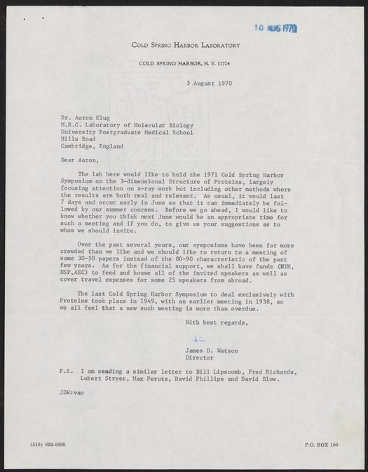 Letter from James Watson to Aaron Klug, August 5, 1970