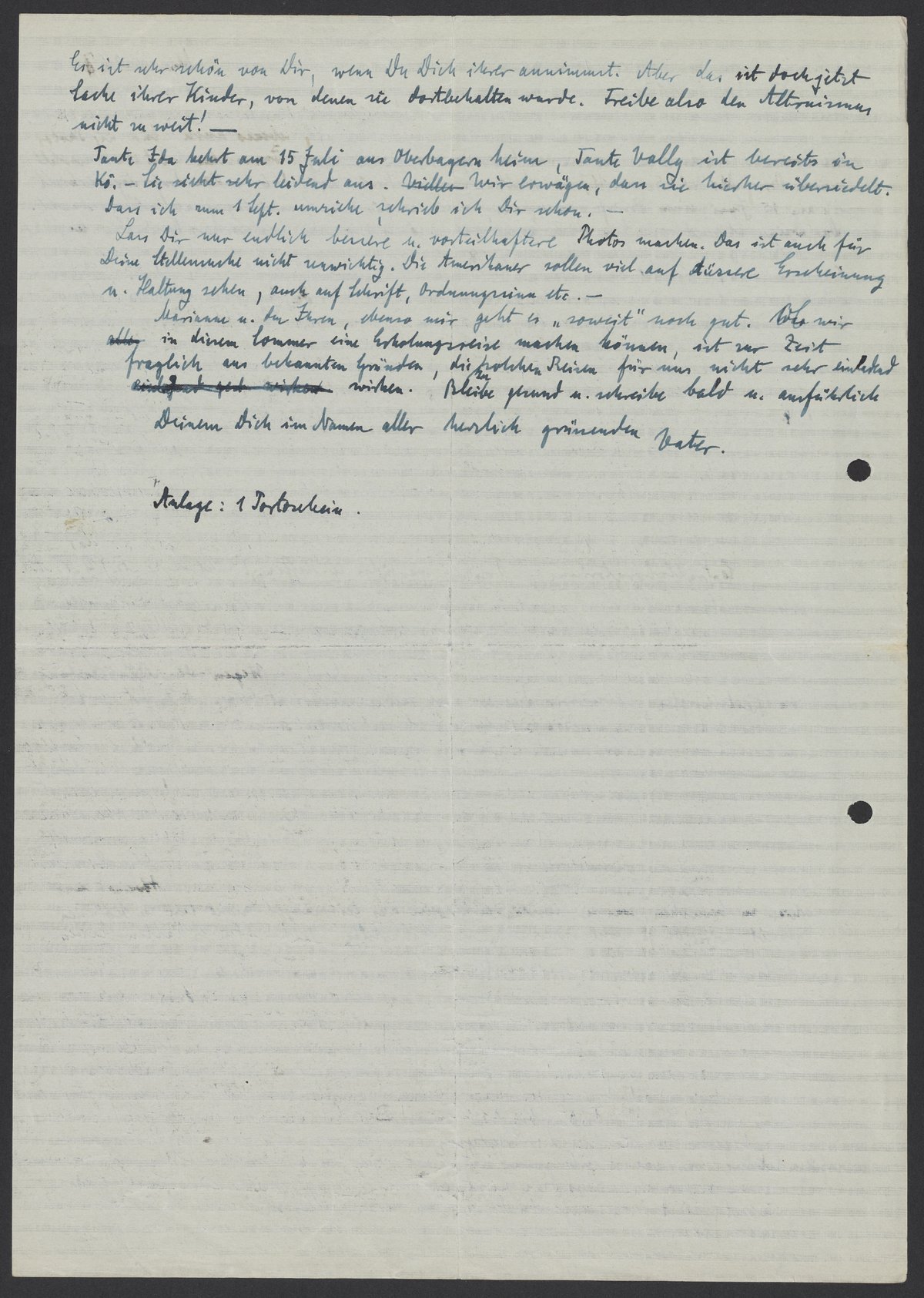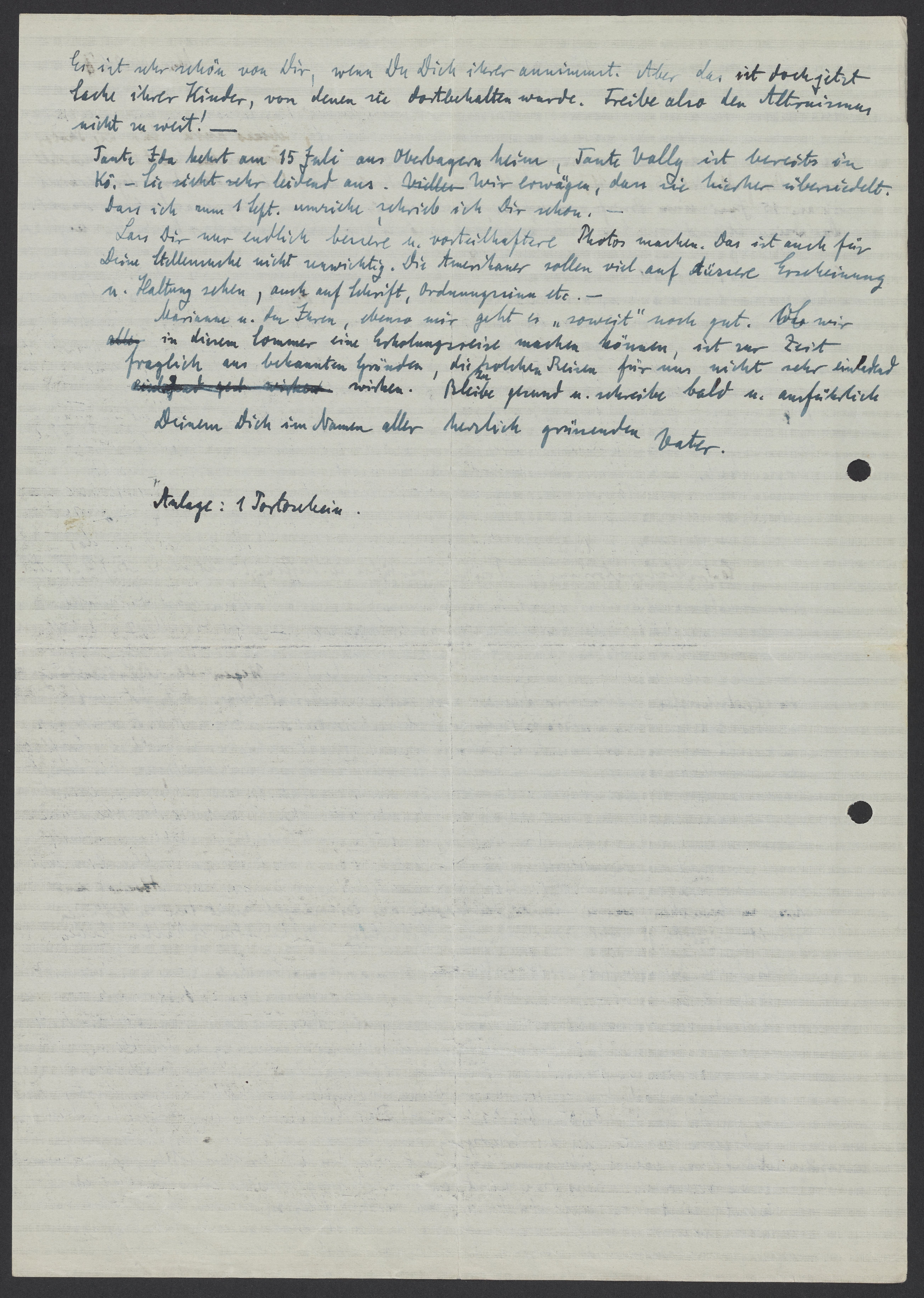 Tante Ida kehrt am 15 Juli aus Oberbayern heim, Tante Vally ist bereits in Kö. Sie sieht sehr leidend aus. Wir erwägen, dass sie hierher übersiedelt. Dass ich zum 1. Sept umziehe, schrieb ich Dir schon.