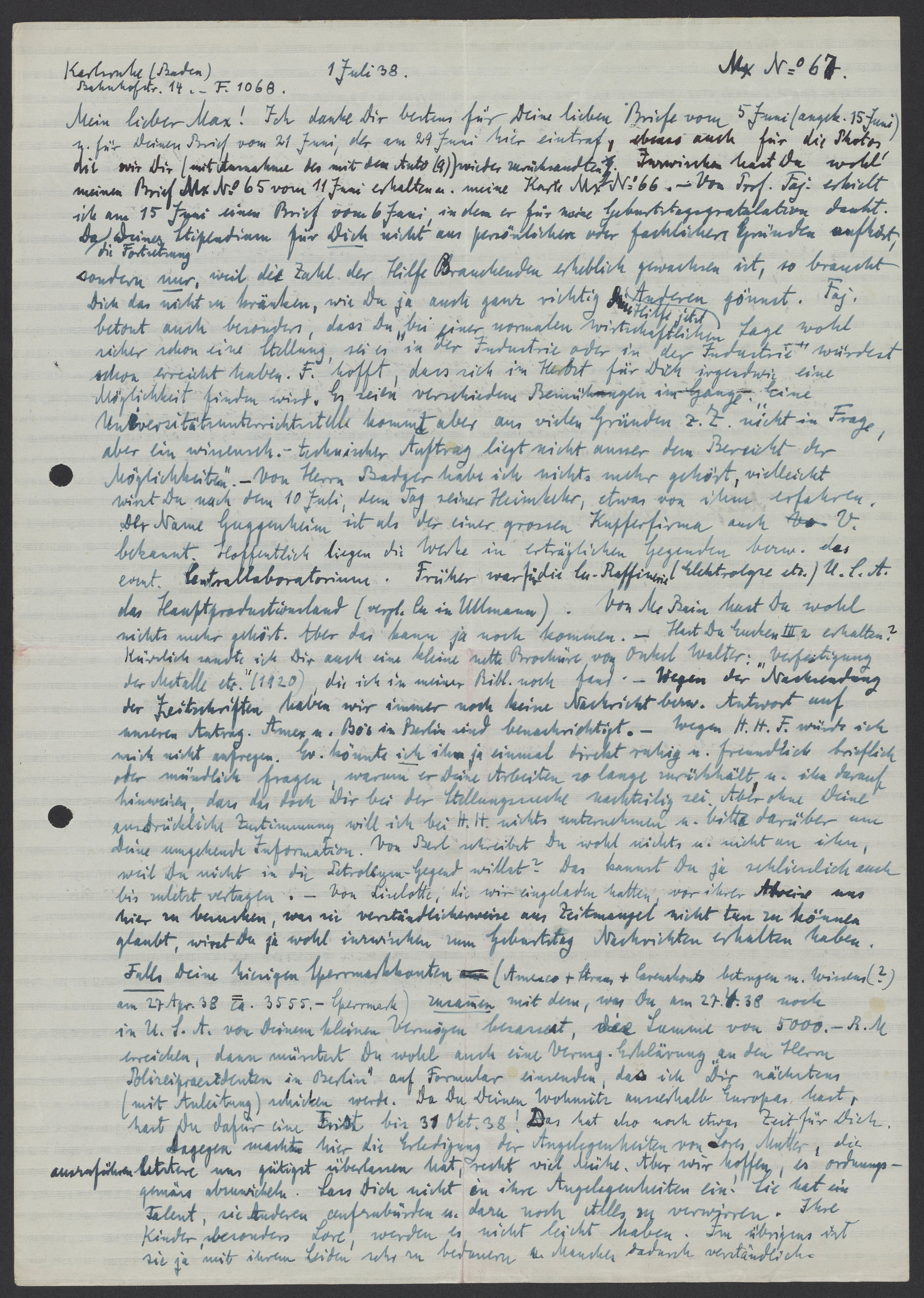 Mein lieber Max! Ich danke Dir bestens für Deine lieben Briefe vom 5 Juni (angek. 15 Juni) u. für Deinen Brief vom 21 Juni, der am 29 Juni hier eintraf, ebenso auch für die Photos die wir Dir (mit Aufnahme des mit dem Auto (9)) wieder zurücksandten. Inzwischen hast Du wohl meinen Brief Mx No 65 vom 11 Juni erhalten u. meine Karte Mx No 66. Von Prof. Faj. erhielt ich am 15 Juni einen Brief vom 6 Juni, in dem er für meine Geburtstagsgratulation dankt. Da die Fortsetzung Deines Stipendiums für Dich nicht aus persönlichen oder fachlichen Gründen auflöst, sondern nur weil die Zahl der Hilfe Brauchenden erheblich gewachsen ist, so braucht Dich das nicht zu kränken, wie Du ja auch ganz richtig Hilfe jetzt Anderen gönnt. Faj. betont auch besonders, dass Du „bei einer normalen wirtschaftlichen Lage wohl sicher schon eine Stellung, sei es in der Industrie oder in der Industrie“ würdest schon erreicht haben. F. hofft, dass sich im Herbst für Dich irgendwie eine Möglichkeit finden wird. Es seien verschiedene Bemühungen im Gange. „Eine Universitätsunterrichtsstelle kommt aber aus vielen Gründen z.Z. nicht in Frage, aber ein wissensch. – technischer Auftrag liegt nicht ausser dem Bereich der Möglichkeiten.“ – Von Herrn Badger habe ich nichts mehr gehört, vielleicht wirst Du nach dem 10 Juli, dem Tag seiner Heimkehr etwas von ihm erfahren. Der Name Guggenheim ist als der einer grossen Kupferfirma auch V. bekannt. Hoffentlich liegen die Werke in erträglichen Gegenden bezw. das event. Centrallaboratorium. Früher war für die Cu – Raffinerie (Elektrolyse etc.) U.S.A das Hauptproductionsland (vergl. Cu. in Ullmann) Von McBain hast Du wohl nichts mehr gehört. Aber das kann ja noch kommen. – Hast Du Eucken III 2 erhalten? Kürzlich sandte ich Dir auch eine kleine nette Broschüre von Onkel Walter: „Verfertigung der Metalle etc.“ (1920), die ich in meiner Bibl. noch fand.- Wegen der Nachsendung der Zeitschriften haben wir immer noch keine Nachricht bezw. Antwort auf unseren Antrag. Amex u. Bo.‘s in Berlin sind benachrichtigt. – Wegen H.H.F. würde ich mich nicht aufregen. Ev. könnte ich ihn ja einmal direkt ruhig u. freundlich brieflich oder mündlich fragen, warum er Dich Arbeiten so lange zurückhält, u. ihn darauf hinweisen, dass das doch Dir bei der Stellungssuche nachteilig sei. Aber ohne Deine ausdrückliche Zustimmung will ich bei H.H. nichts unternehmen u. bitte darüber um deine umgehende Information. Von Berl schreibst Du wohl nichts u. nicht an ihn, weil Du nicht in die Petrolia-Gegend willst? Das kannst Du ja schliesslich auch bis zuletzt vertagen. – Von Liselotte, die wir eingeladen hatten, vor ihrer Abreise uns hier zu besuchen, was sie verständlicherweise aus Zeitmangel nicht tun zu können glaubt, wirst Du ja wohl inzwischen zum Geburtstag Nachrichten erhalten haben. Falls Deine hiesigen Sperrmarkkonten (Amexco + Straus + Carenzkonto Betrage u. wissen (?) am 27 Apr. 38 ca. 3555.- Sperrmark) zusammen mit dem was Du am 27. 4. 38 noch in U.S.A. von Deinem kleinen Vermögen besassest, die Summe von 5000. – R.M. erreichen, dann müsstest Du wohl auch eine Vermg. Erklärung an den Herrn Polizeipräsidenten in Berlin auf Formular einsenden, das ich Dir nächstens (mit Anleitung) schicken werde. Da Du Deinen Wohnsitz ausserhalb Europas hast, hast Du dafür eine Frist bis 31 Okt. 38! Das hast Du also noch etwas Zeit für Dich.