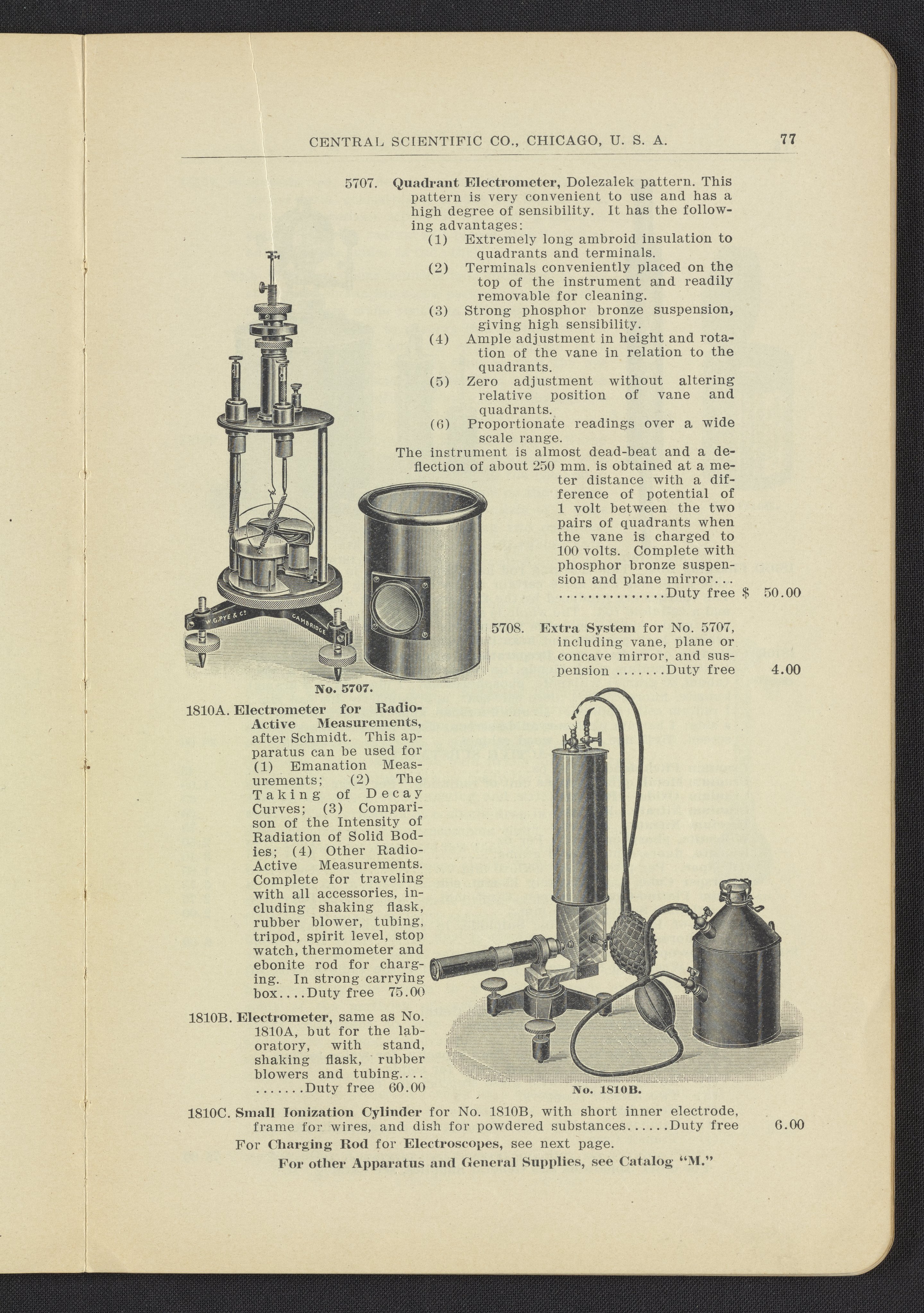 Central Scientific Company. “Electrometers.” Physical Apparatus for Universities and Colleges Manufactured and Imported by Central Scientific Co. Chicago, Illinois: Central Scientific Company, 1912. Q185.7 .C46 1912. Science History Institute. Philadelphia. https://digital.sciencehistory.org/works/idzidwu.