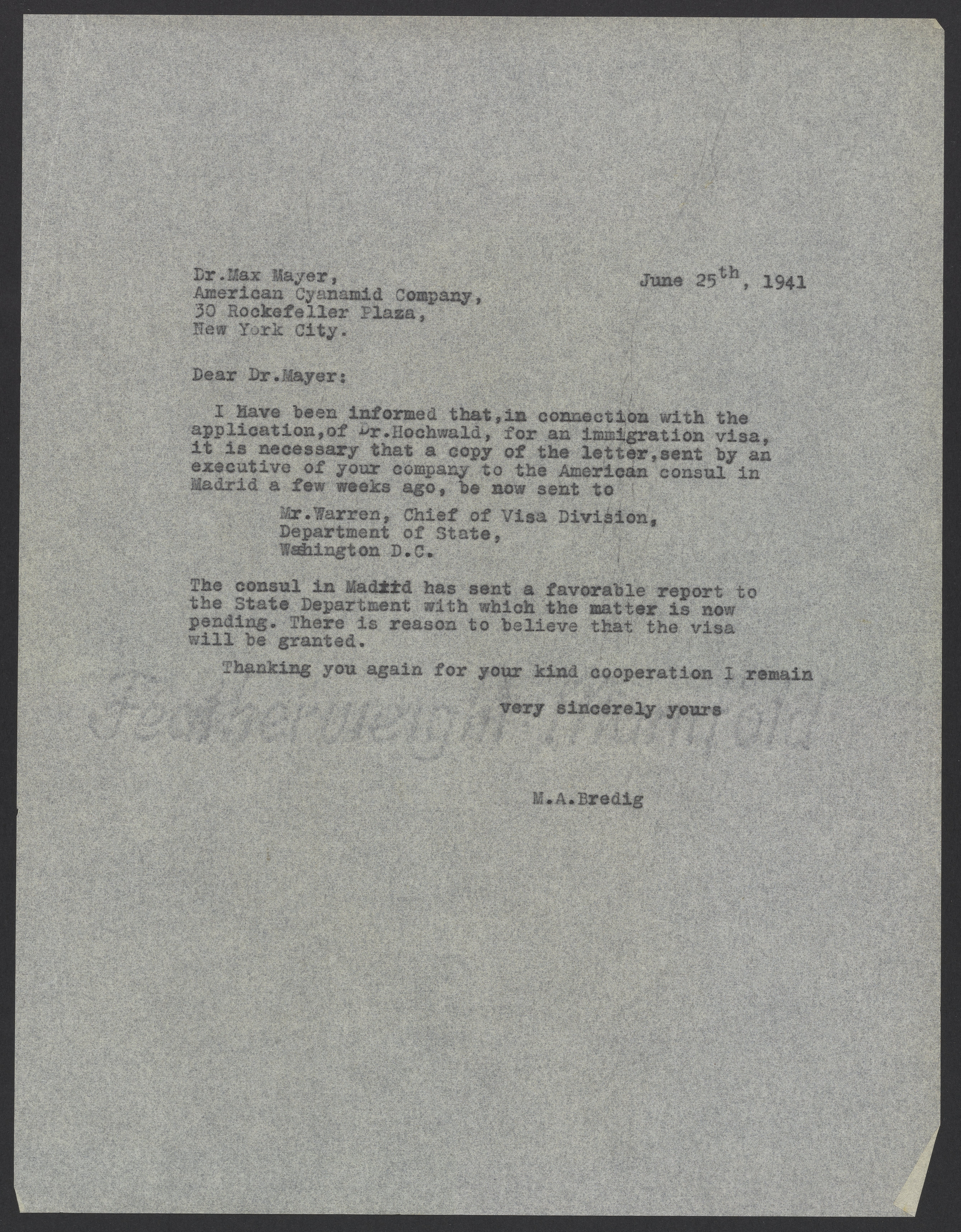 Letter from Max Bredig to Max Mayer, June 25, 1941