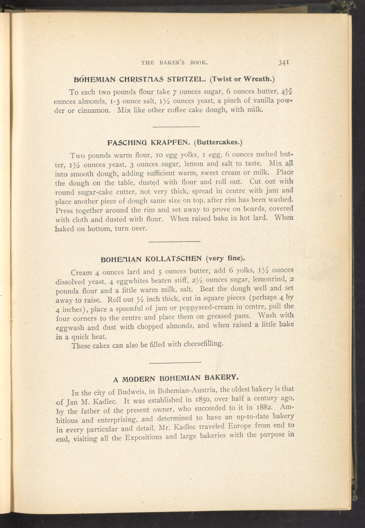Small JPG1200 x 1607px — 347 KBLarge JPG2880 x 3857px — 1.6 MBFull-sized JPG3014 x 4036px — 1.7 MBOriginal fileTIFF — 3014 x 4036px — 34.9 MBThe illustrated second volume of The Baker's Book, providing a comprehensive discussion of baking. Intended to be "every baker's hand book," the series describes the global history and significance of baked goods, predominantly bread, and provides technical information about the nutritive value and chemical composition of bread. Includes recipes, information regarding bakery equipment and supplies, an index, and a selection of advertisements found at the end of each volume. As stated in the preface of the first volume, "it is a book for every baker, be he master, foreman, journeyman, or apprentice." The Baker's Book is an adaptation and translation from the German, Das Baeckerbuch. The first and second volumes are digitized in their entirety.