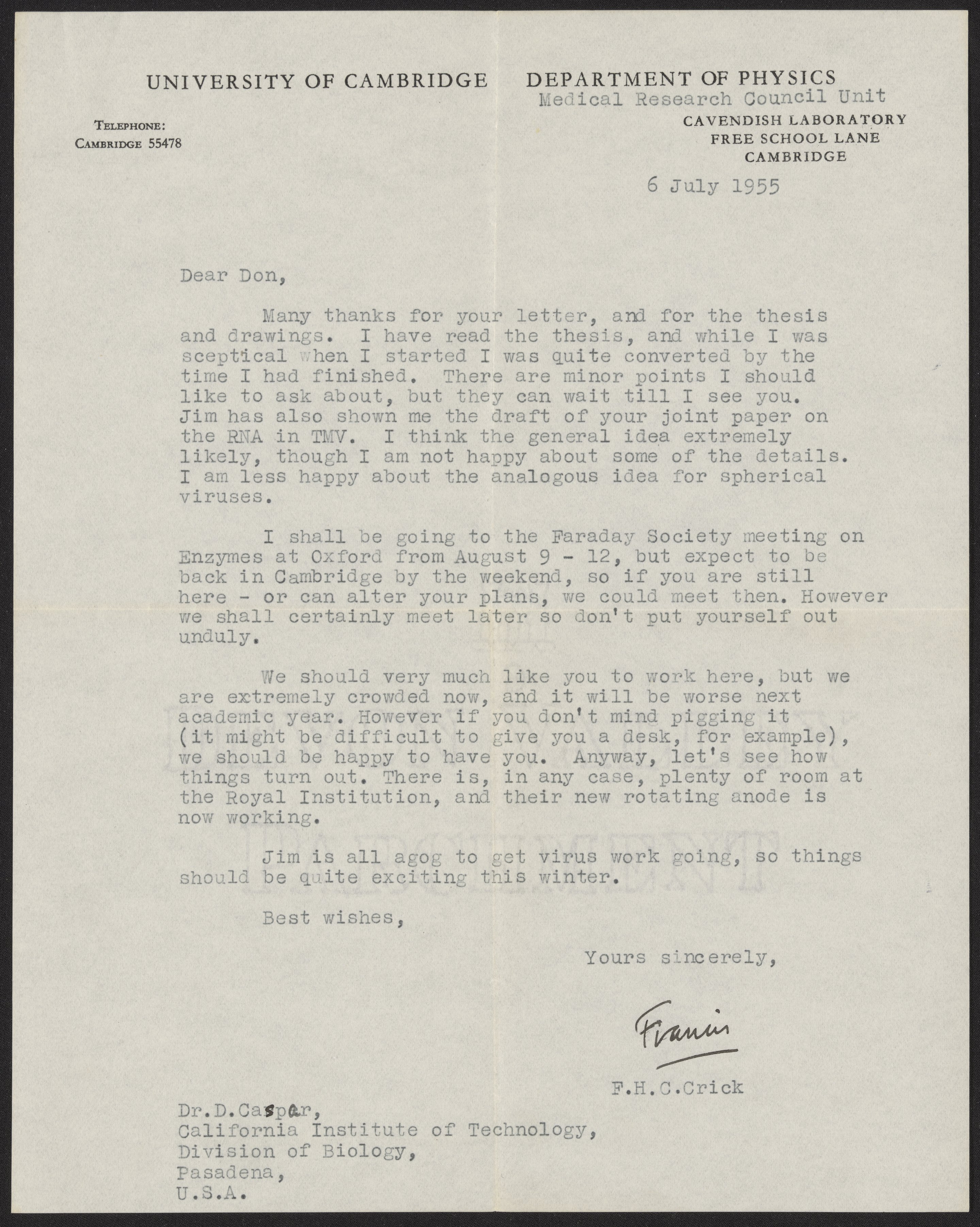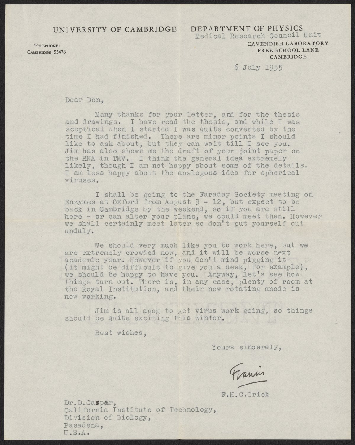 Letter from Francis Crick to Donald Caspar, July 6, 1955