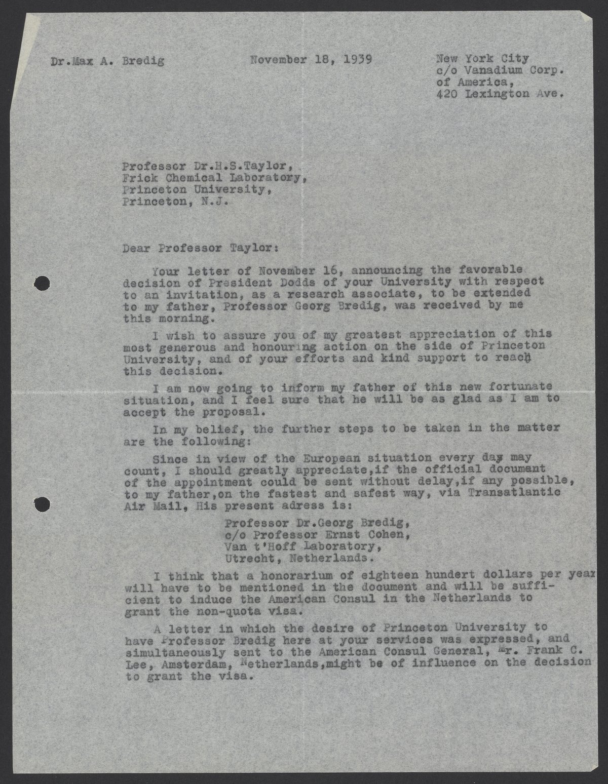 Letter from Max Bredig to Hugh S. Taylor, November 18, 1939